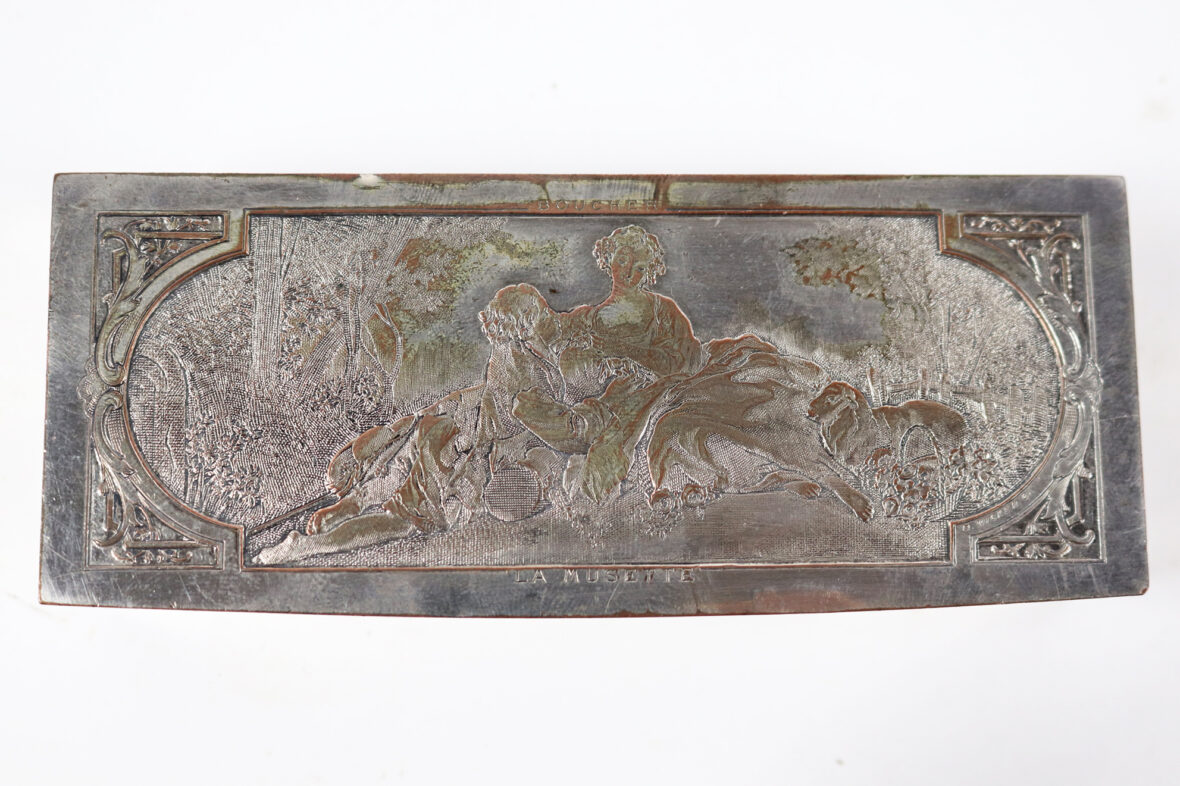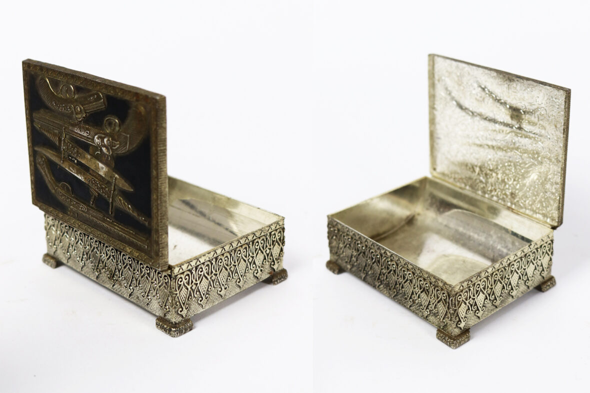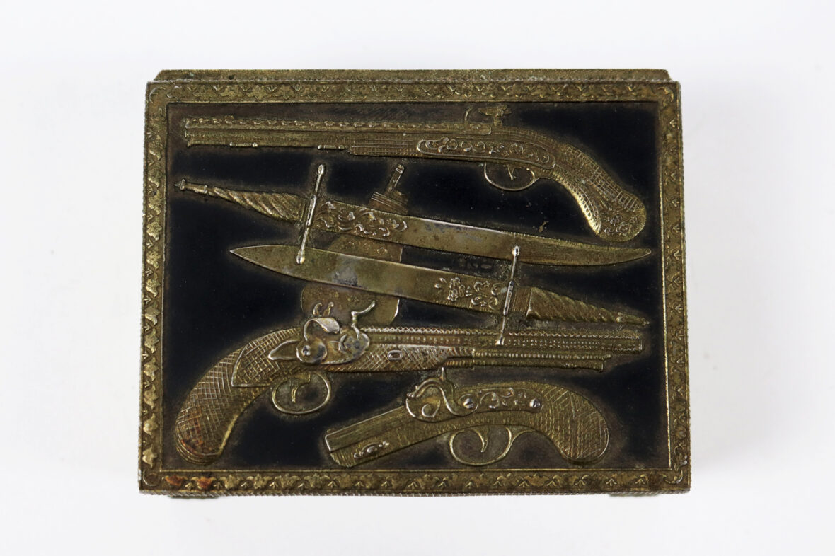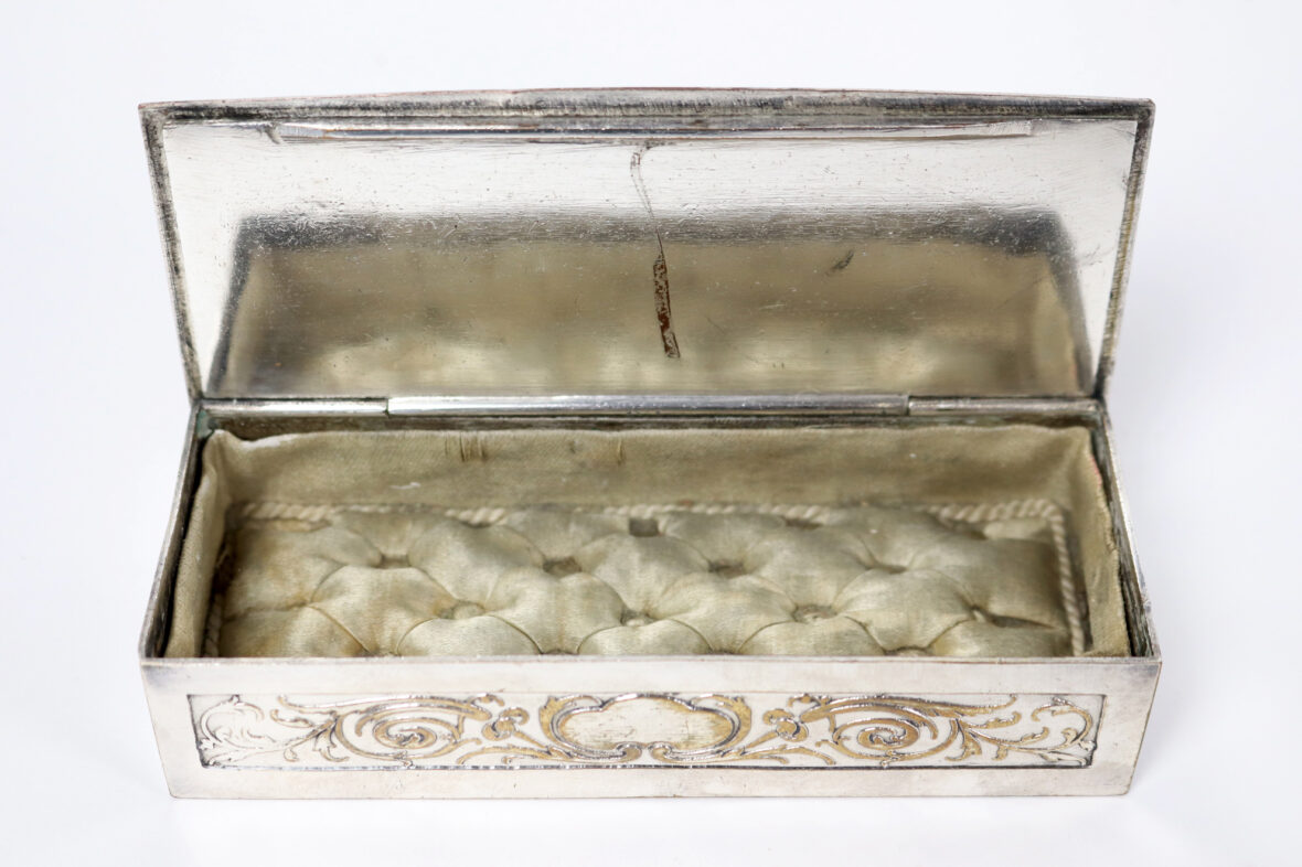 Ensemble comprenant un plumier en bois et couvercle coulissant en métal (Haut. : 2,5 cm – Long. : 21,7 cm); une boîte à bijoux en métal à décor d’une scène galante d’après Boucher, signée B WICKER GR (Haut. : 3 cm – Long. : 13 cm – Prof. : 5,3 cm) et une ancienne boîte à cigarettes à décor d’armes en métal doré (Haut. : 3,5cm – Long. : 9,5 cm – Prof. : 7,5 cm).