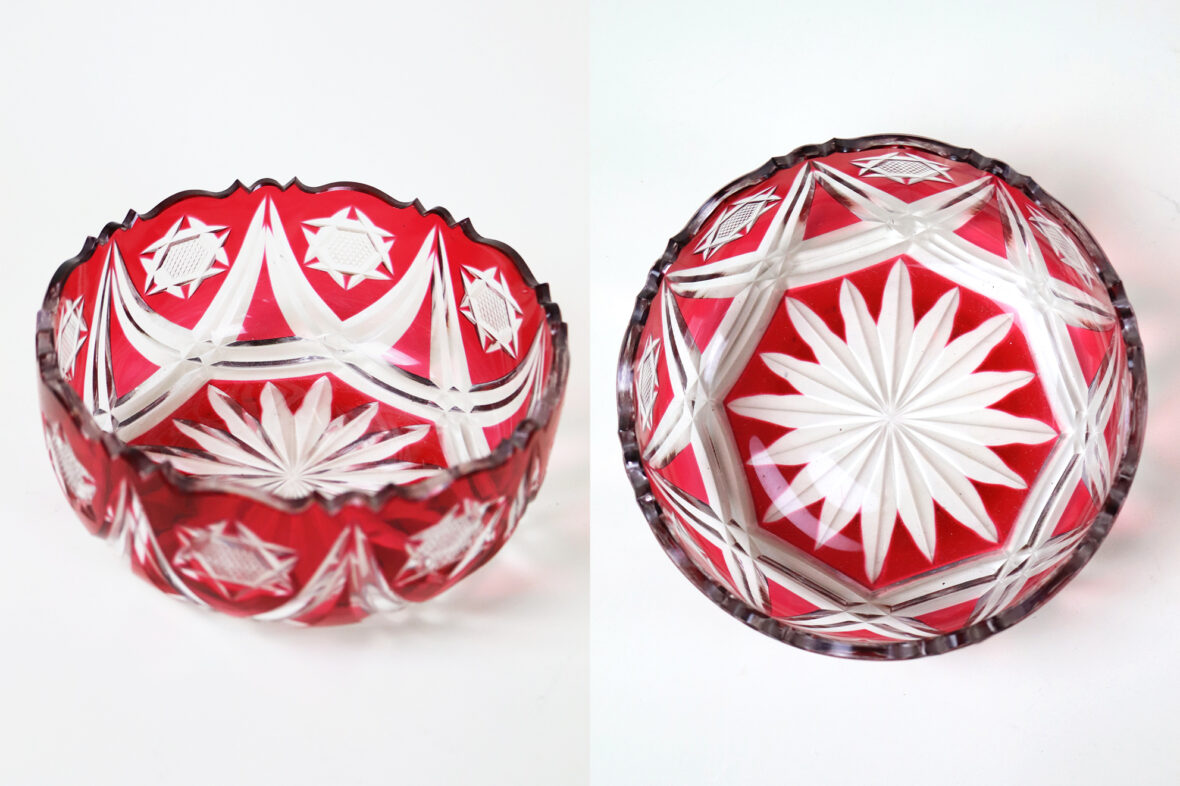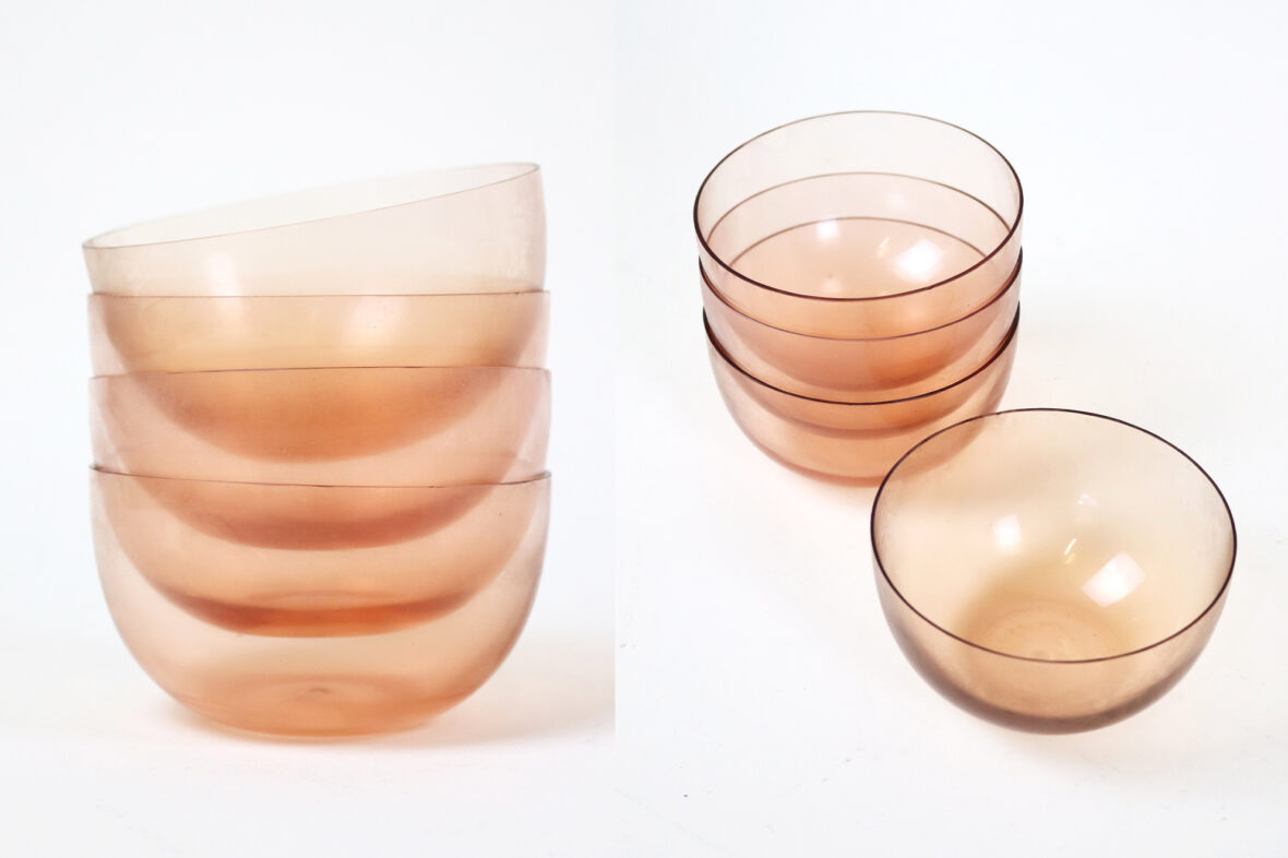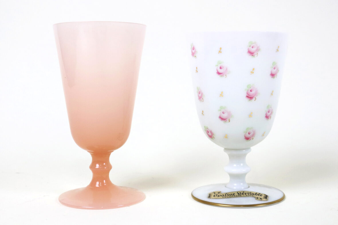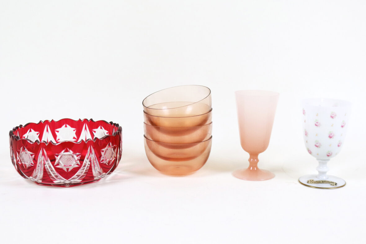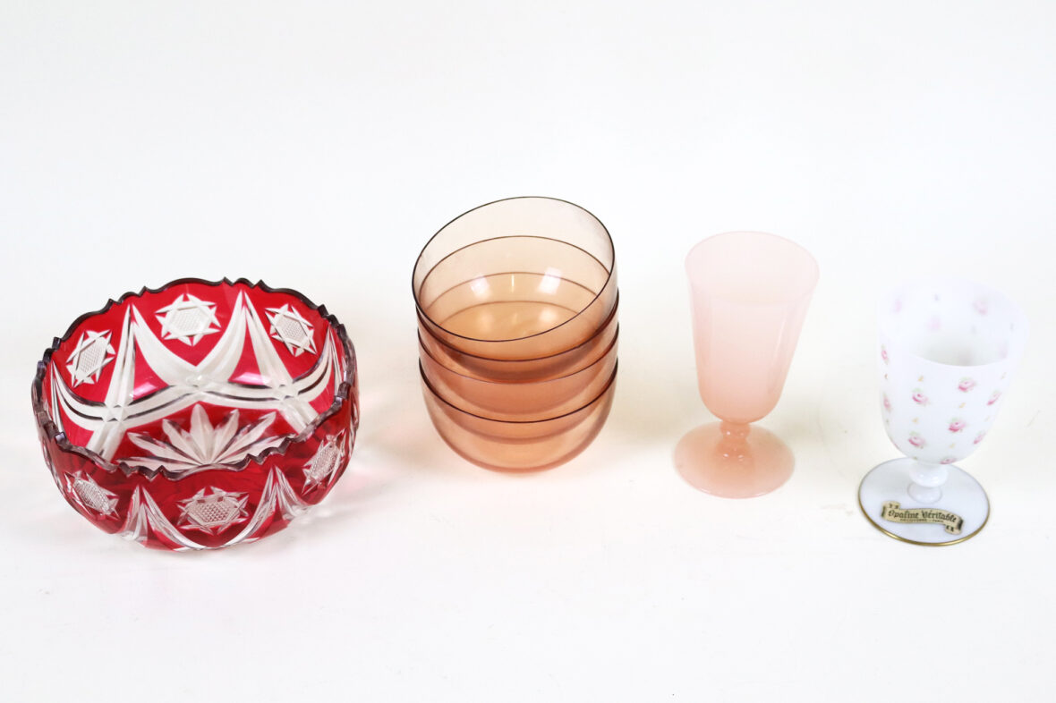 Ensemble comprenant un saladier en verre taillé transparent et teinté rouge, quatre coupelles en verre rose et deux verres sur piédouche en opaline.