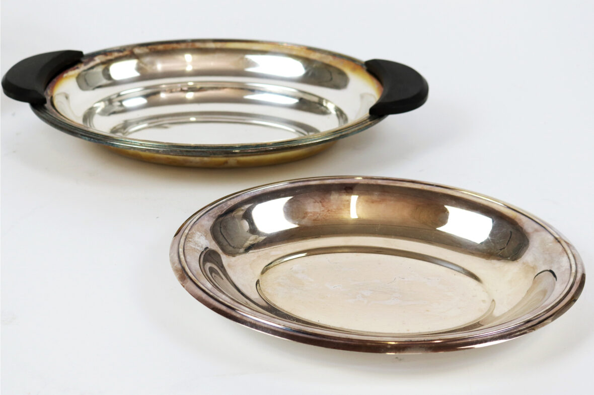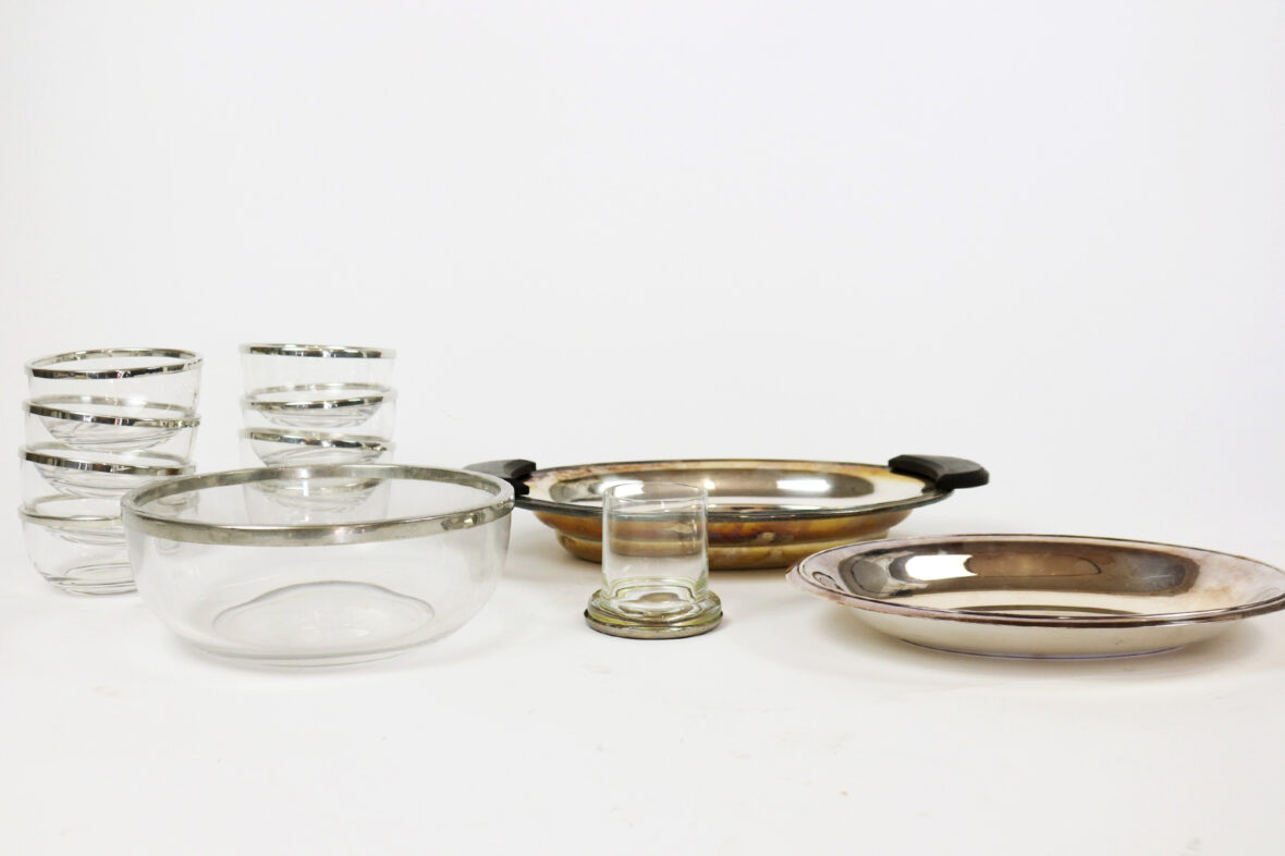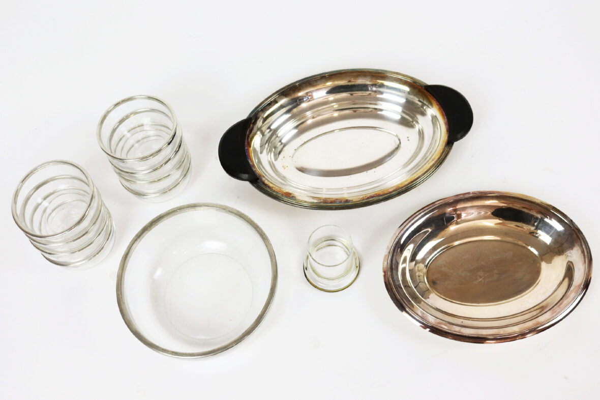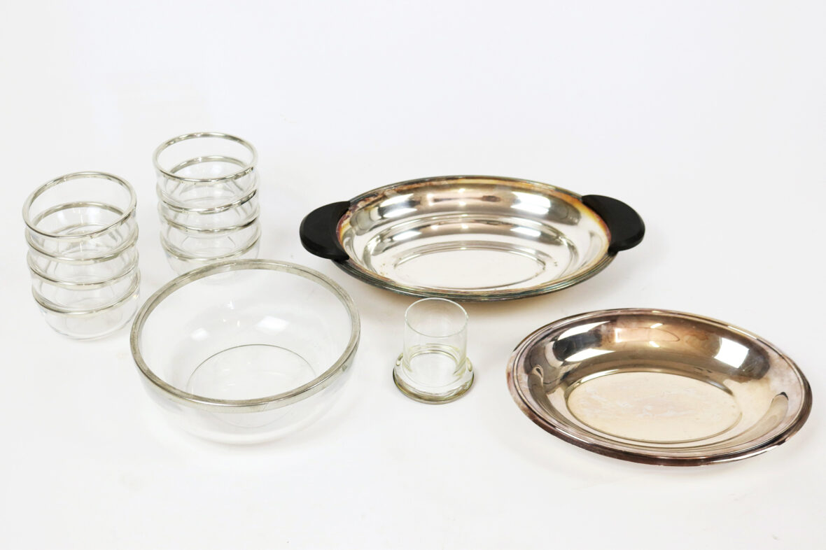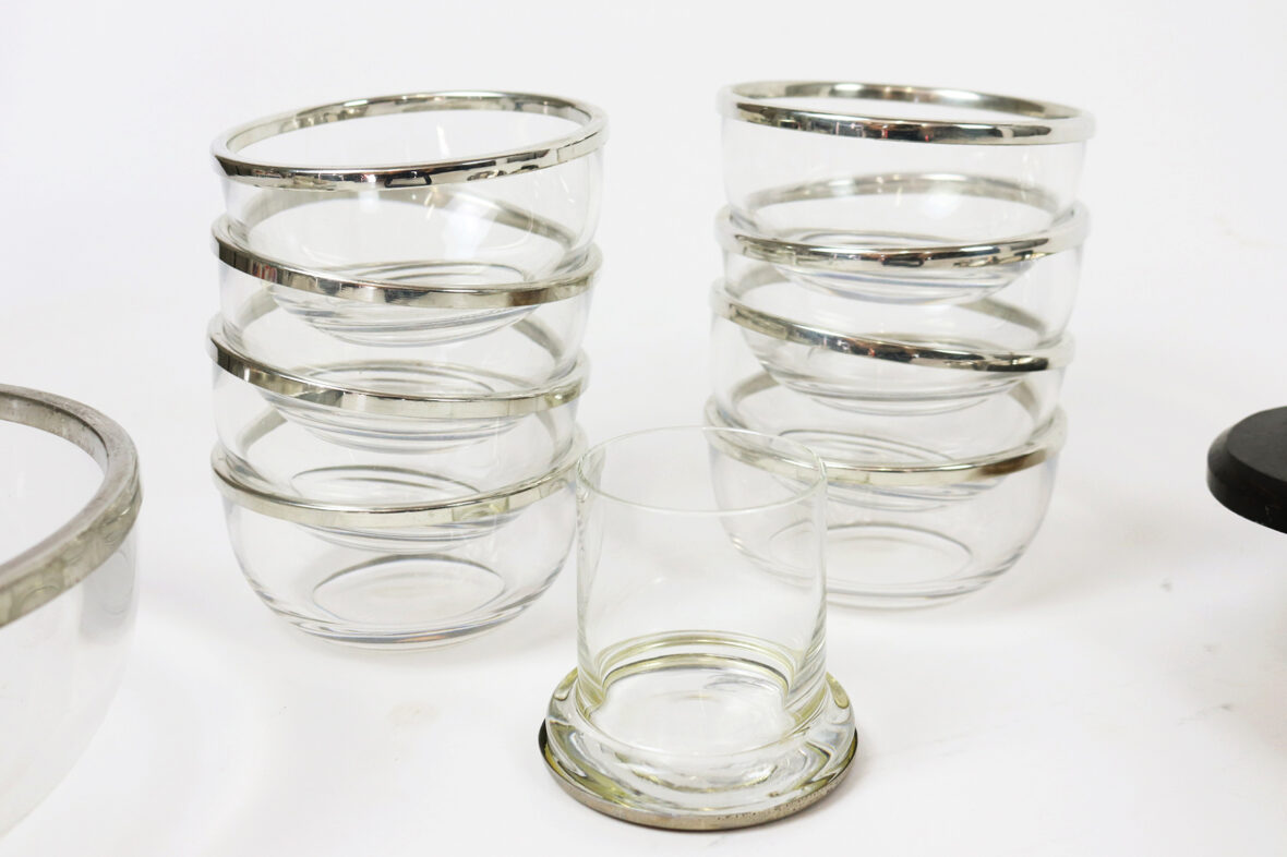 Ensemble comprenant un saladier et 8 coupelles en verre cerclé de métal argenté, un verre à fond applati cerclé de métal argenté, un légumier en métal argenté aux poignées en bois et un plat rond en métal argenté.