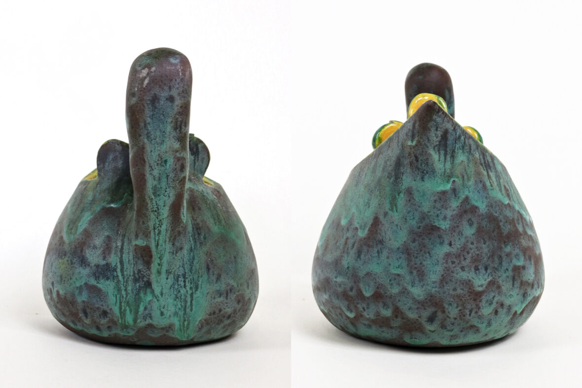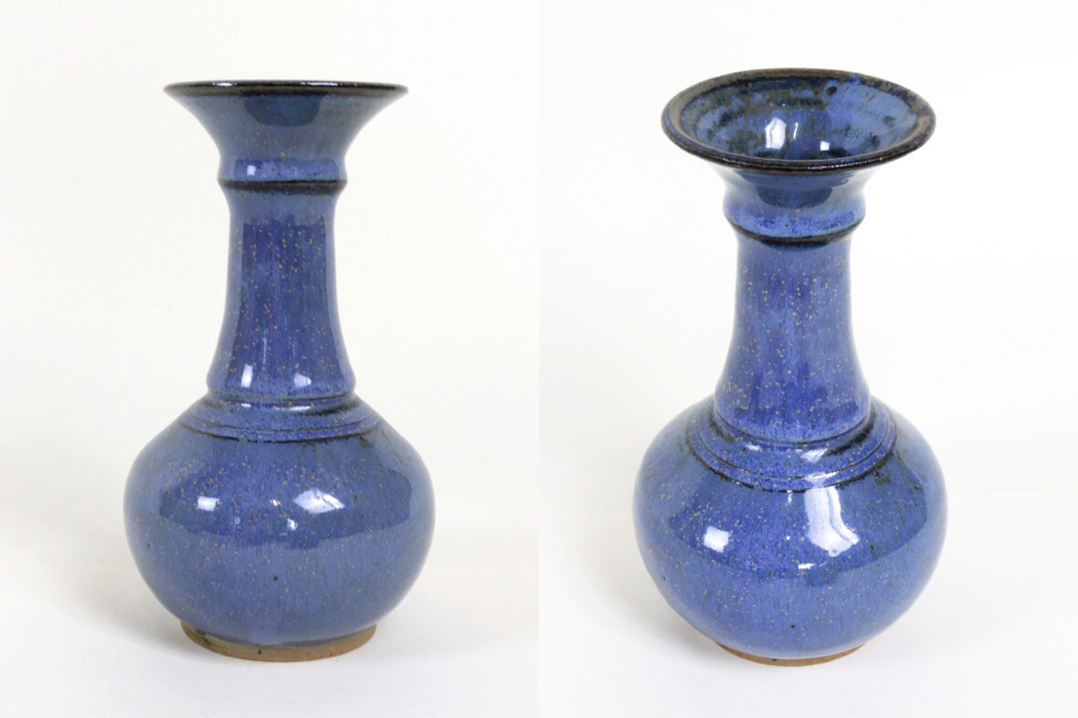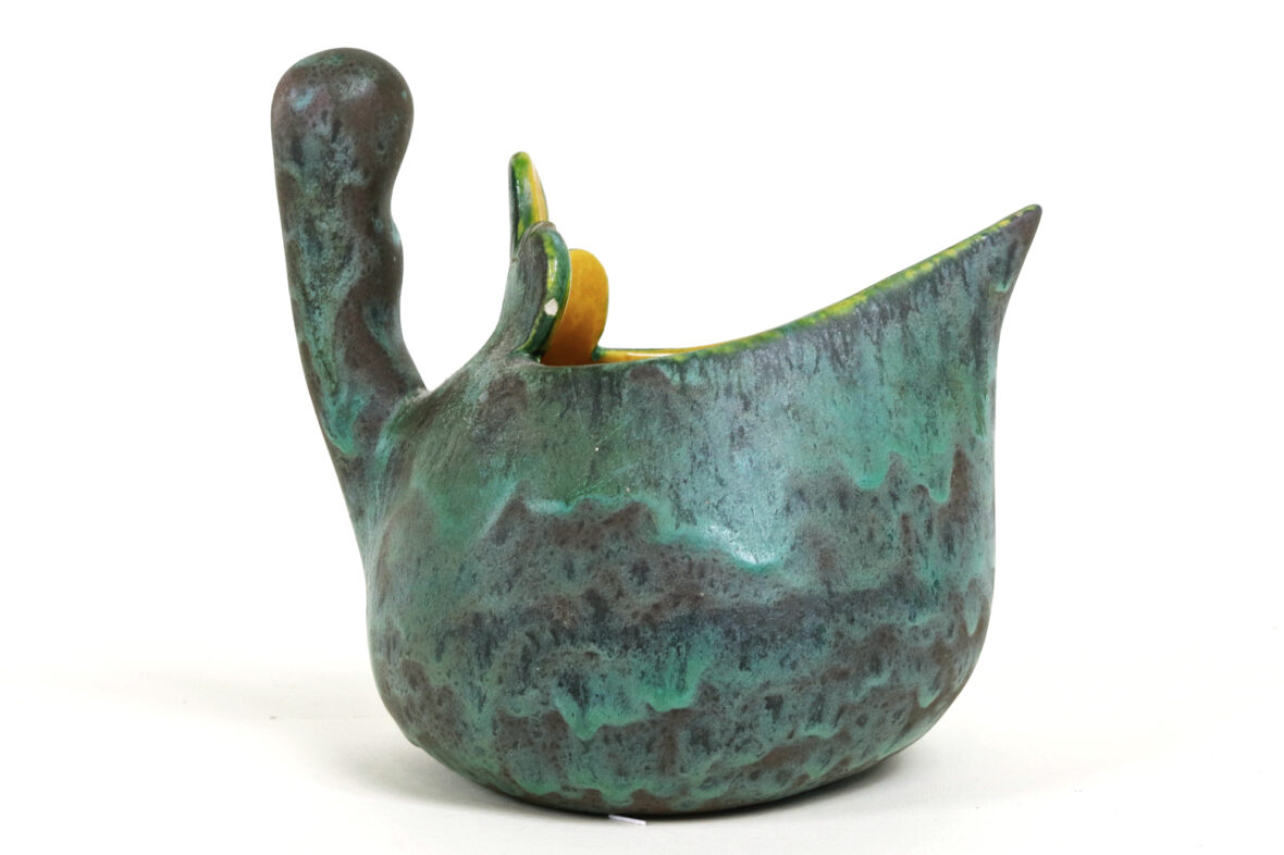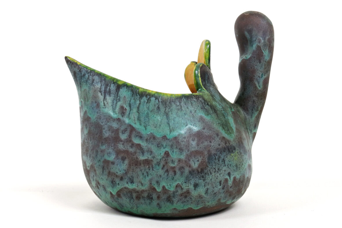 Ensemble comprenant un vide-poche en céramique émaillée bleue à décor de craquelures et motifs émaillés gris (Long. : 17 cm), une verseuse en céramique émaillée vert et intérieur jaune (Haut. : 16 cm – Larg. : 17,5 cm) et un petit vase soliflore de forme balustre en céramique émaillée bleue mouchetée (Haut. : 15,5 cm).