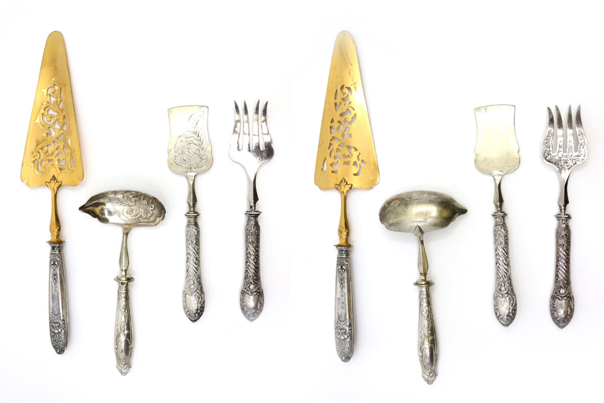 Ensemble comprenant une cuillère à sauce à décor floral stylisé en métal et manche en argent fourré, une pelle à tarte en métal doré à décor ajouré et manche en argent fourré et un ensemble pelle et fourchette à mignardises en métal et manche en argent fourré.