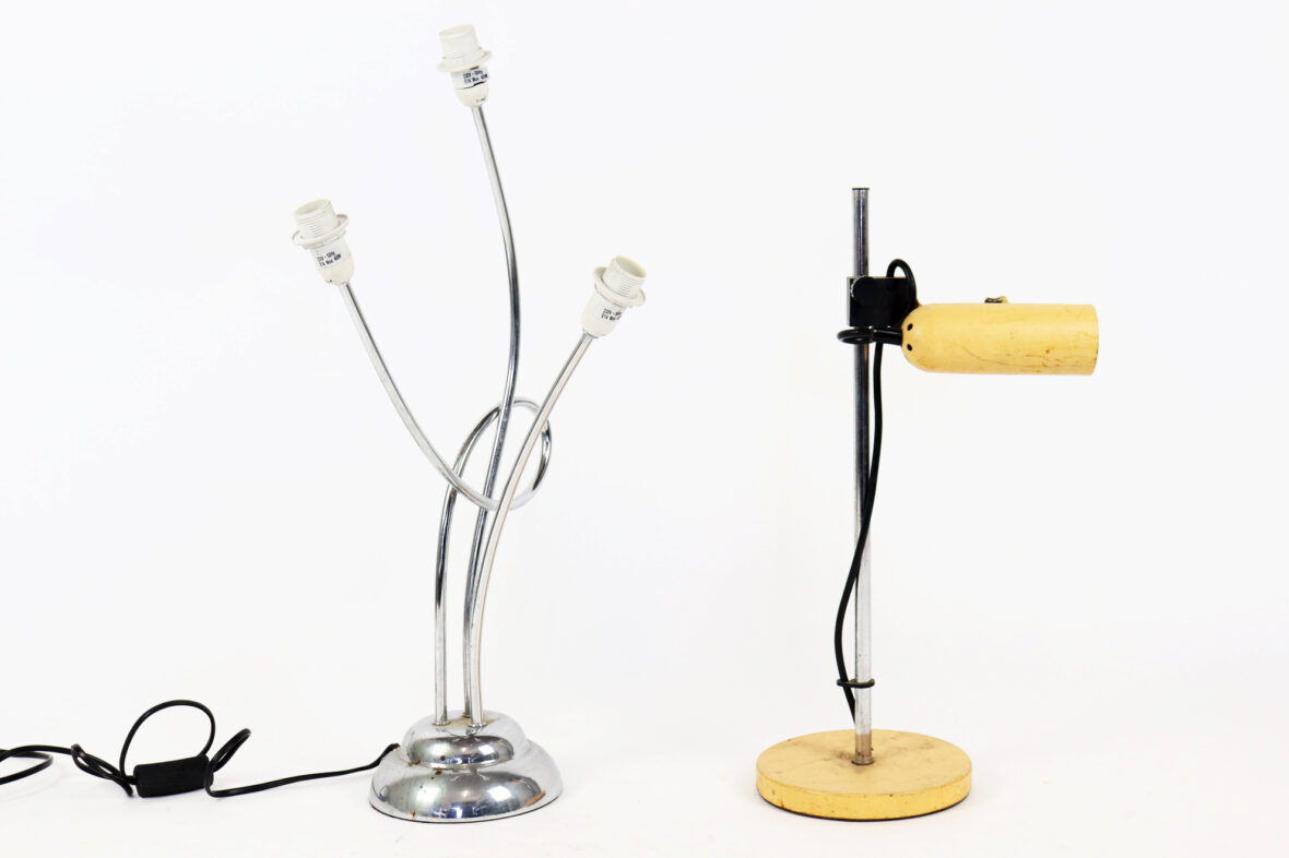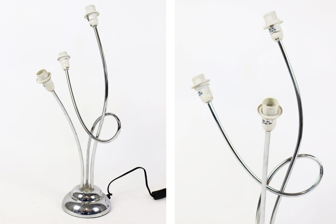 – une lampe à poser en métal chromé à trois lumières.