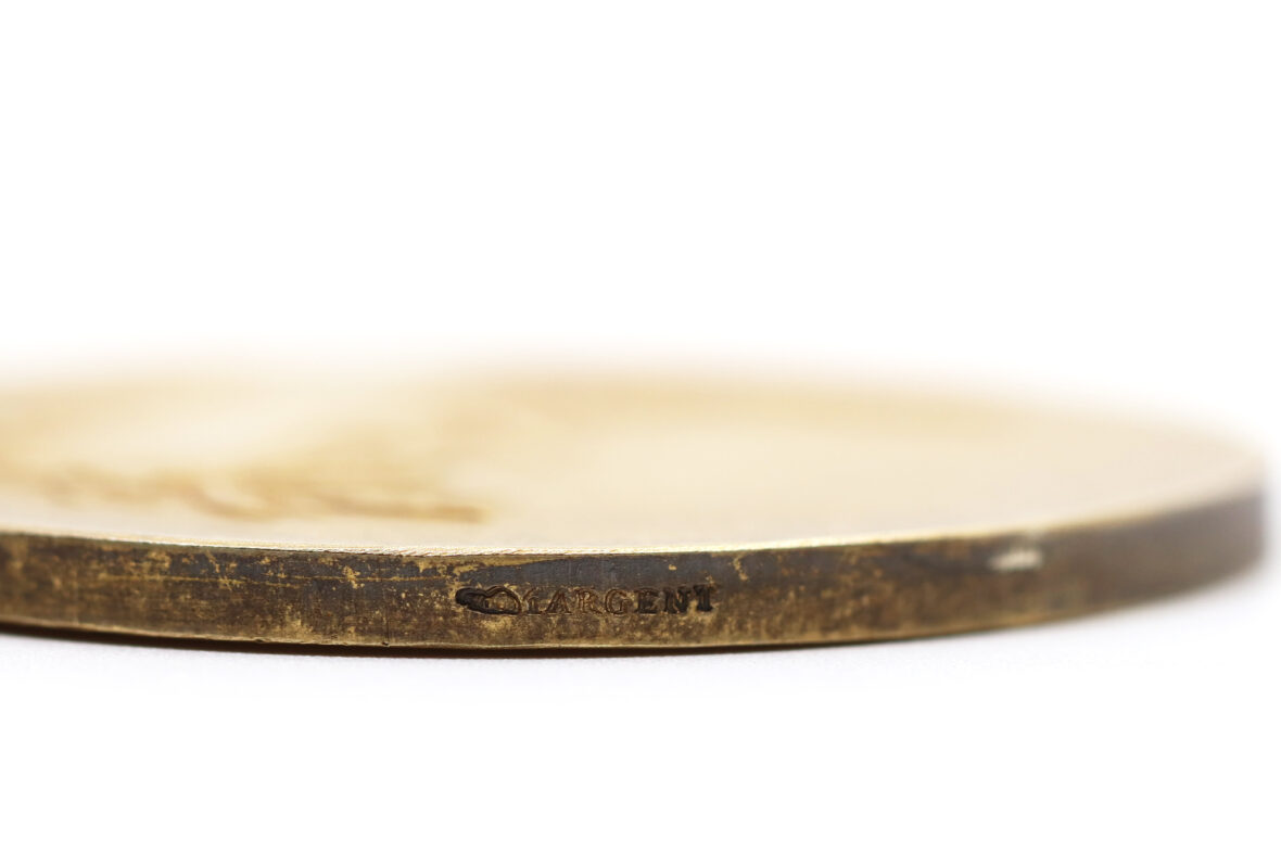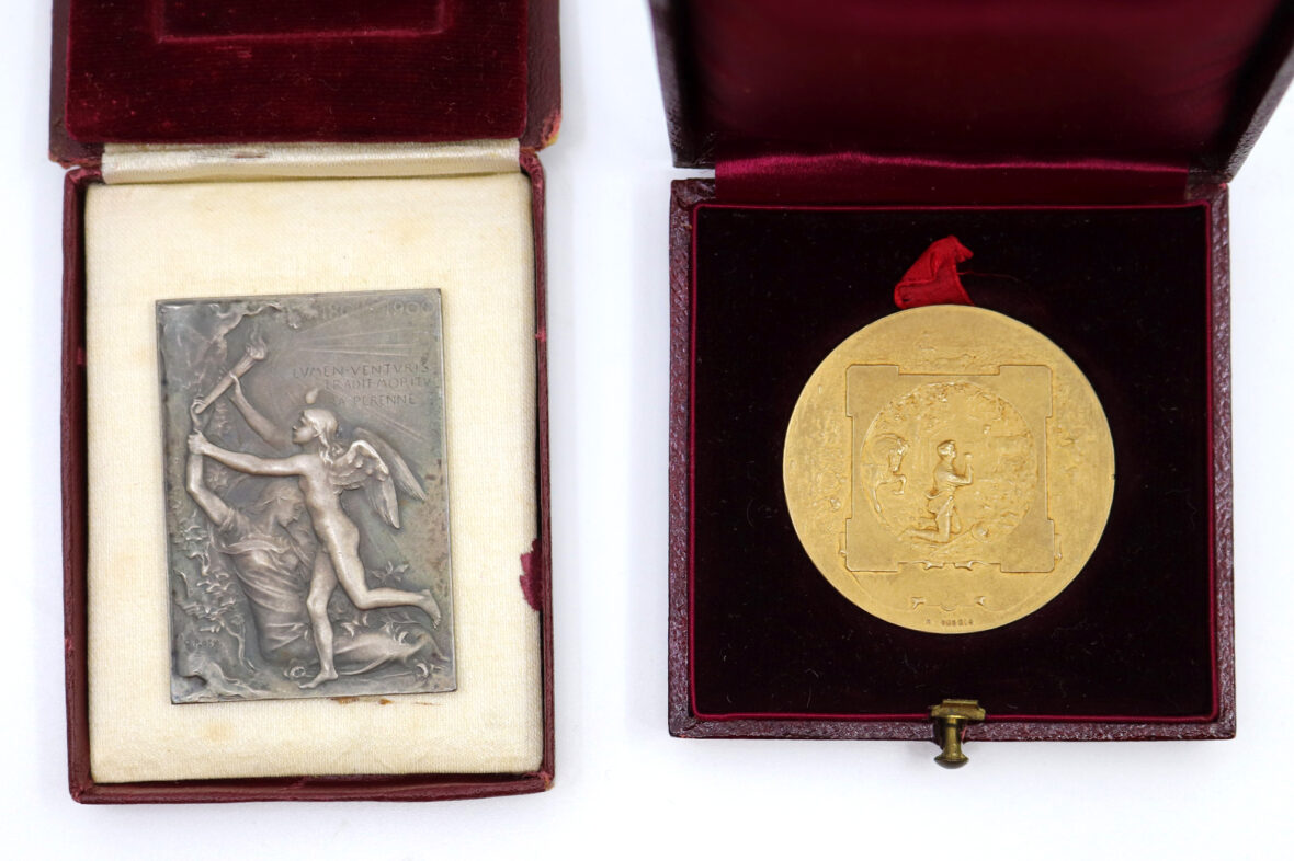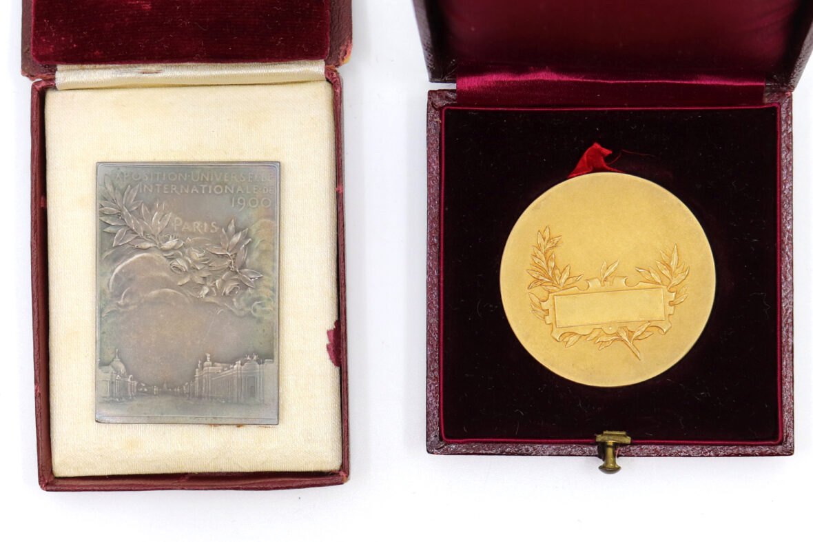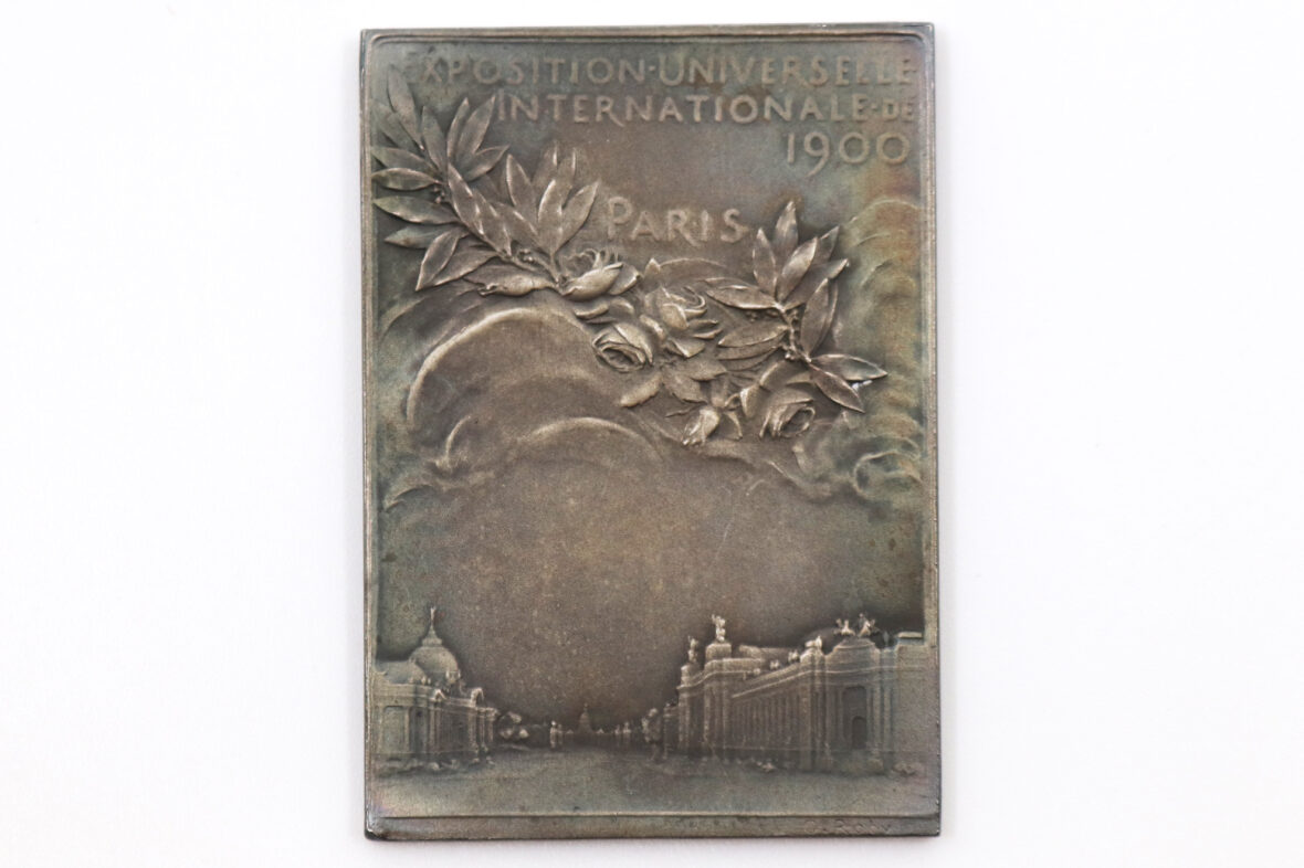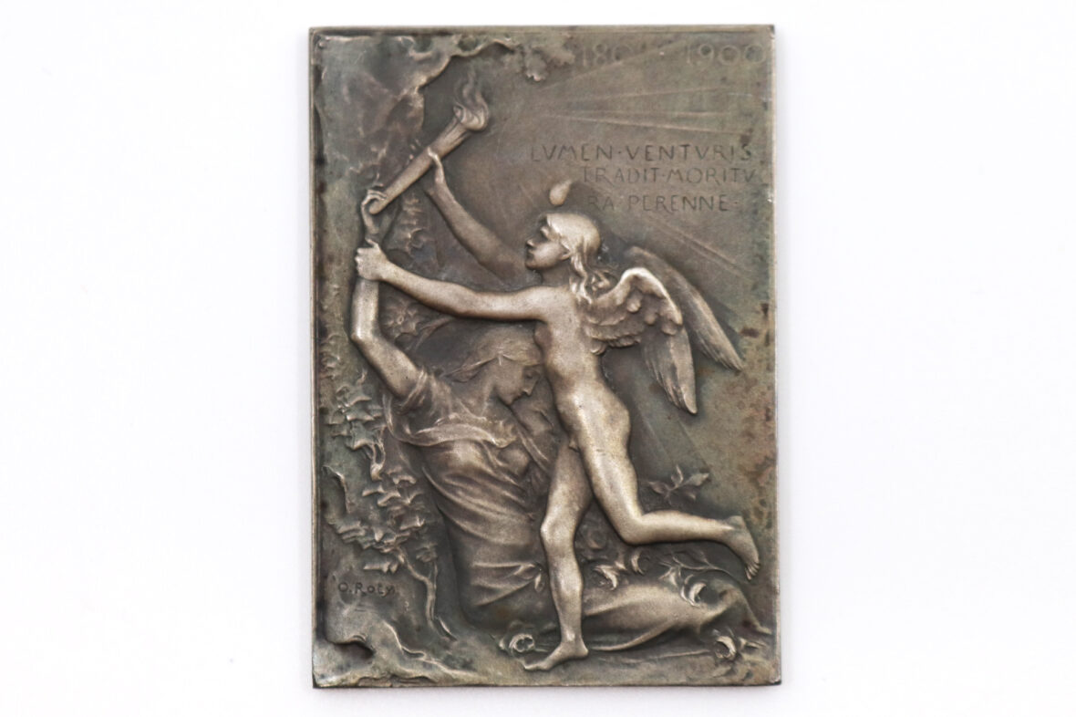 – une médaille rectangulaire en bronze argenté pour l’Exposition universelle internationale de 1900 à Paris. Signée de O. Roty. 61 x 36 mm