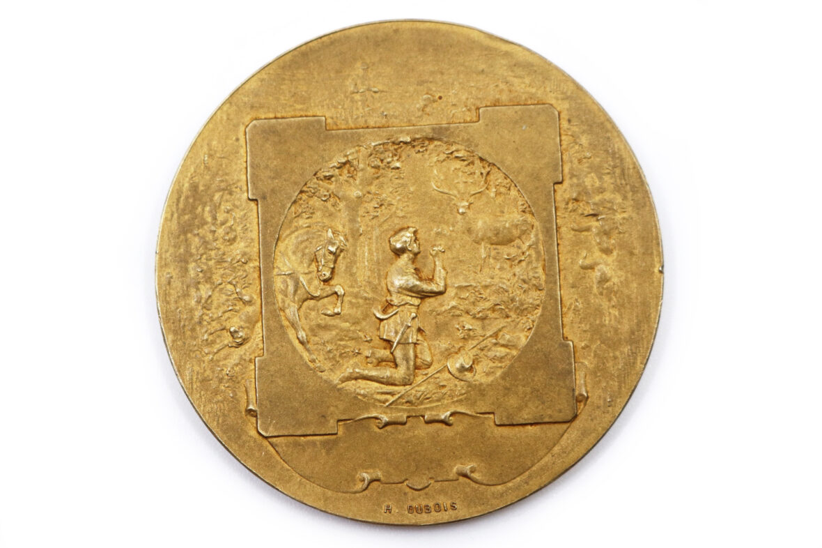 – une médaille ronde en argent ciselé à décor de Saint Hubert. Signé H. Dubois. Gravée seulement au recto.