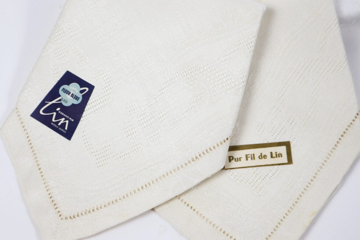 Ensemble comprenant une nappe et 10 serviettes de tables en coton blanc et 2 serviettes en lin (Fleur Bleue).