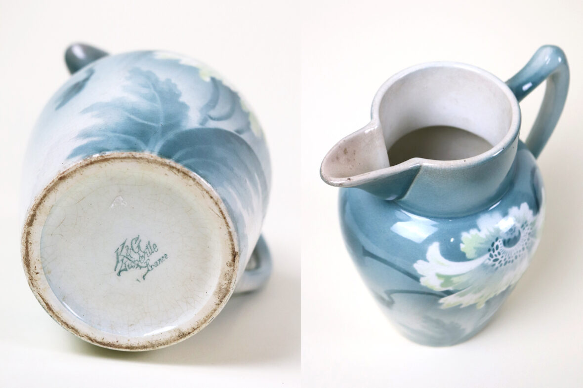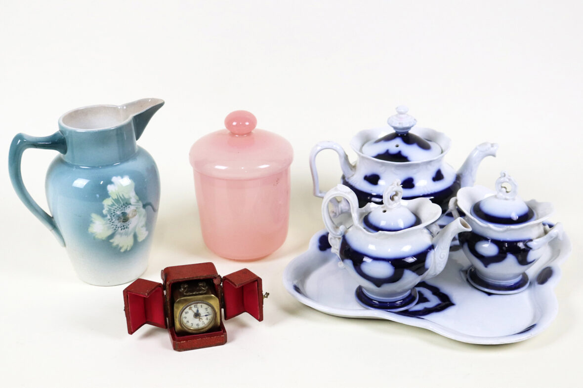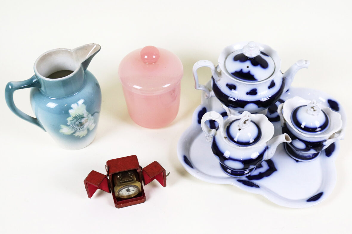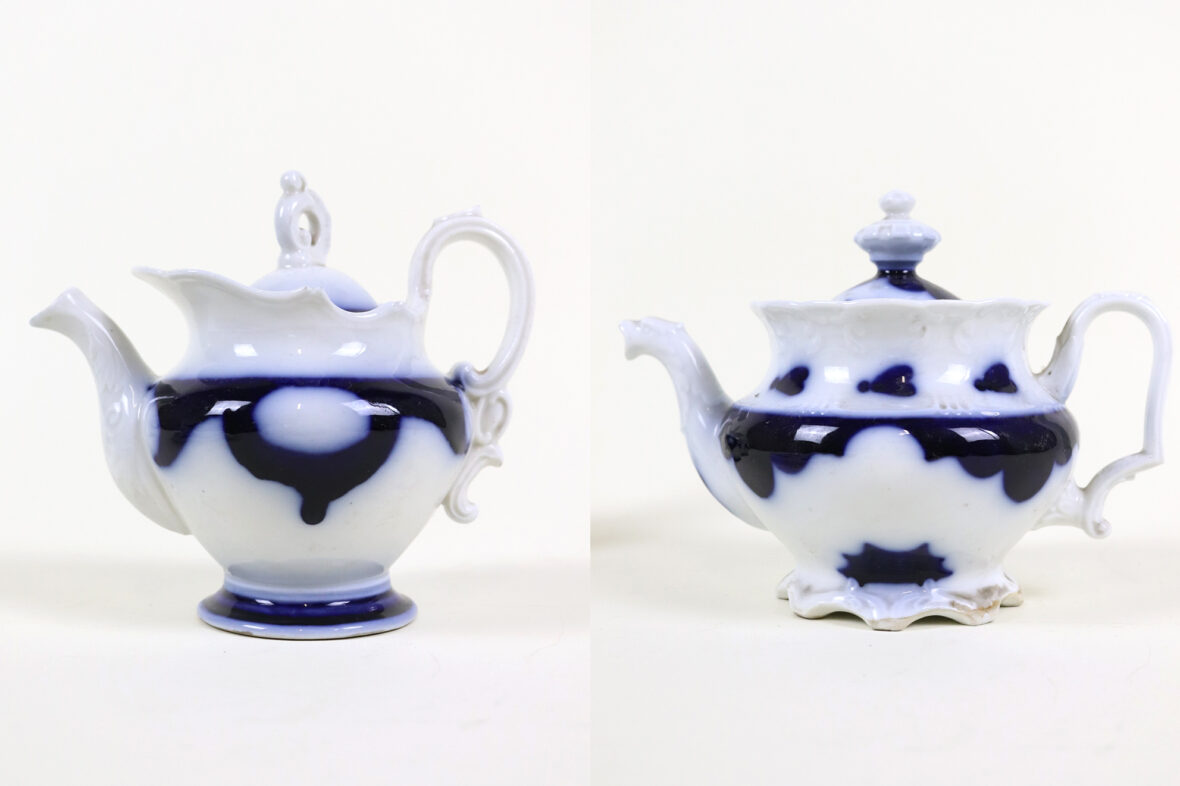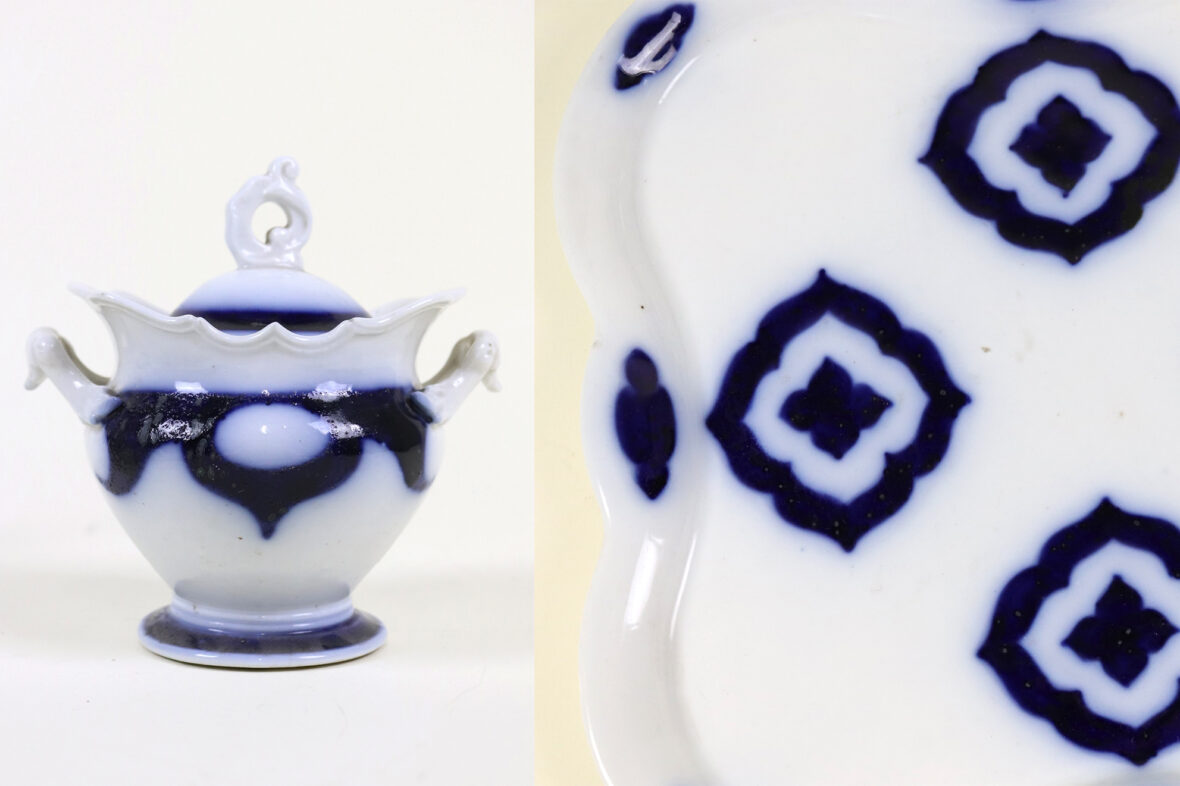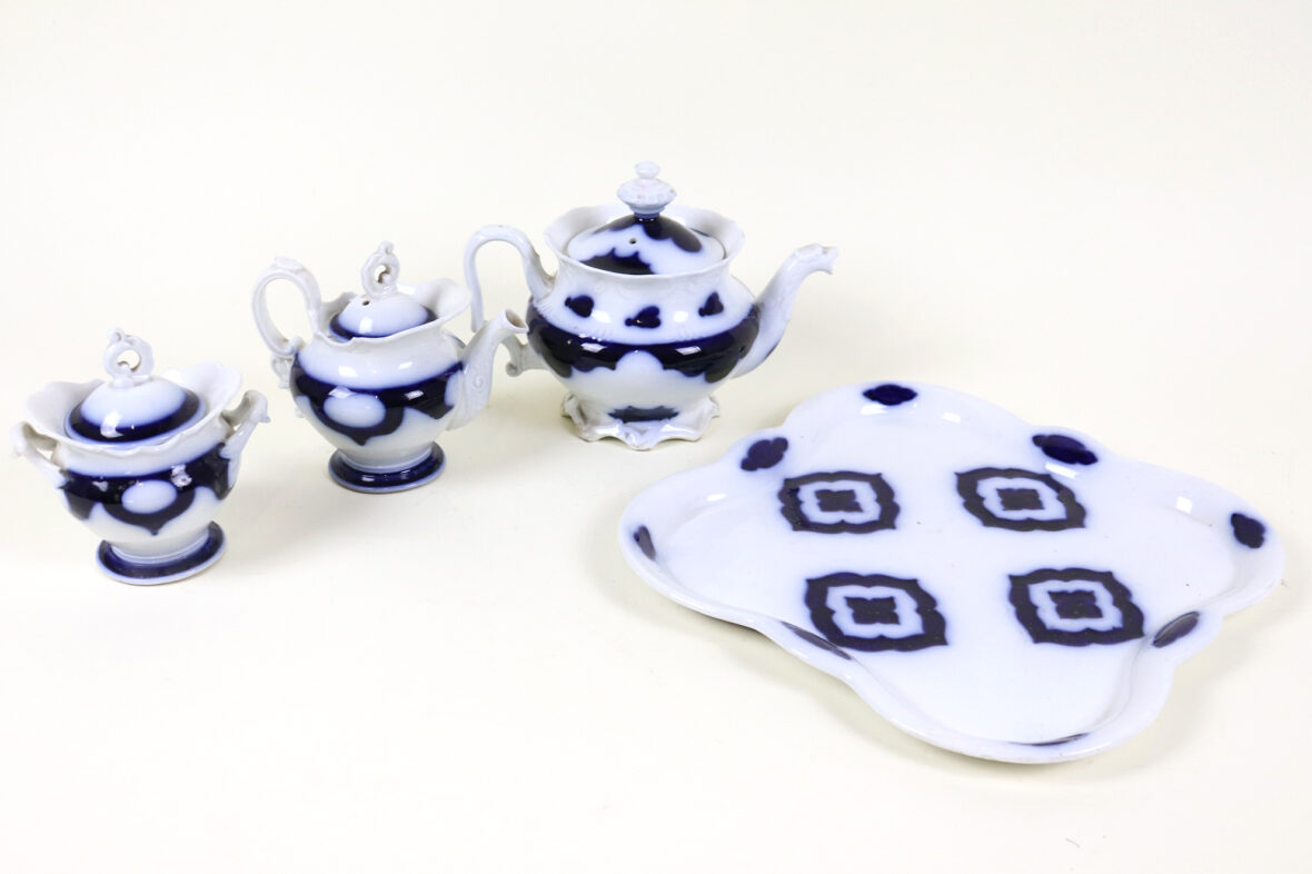 – une partie de service à thé en porcelaine émaillée à décor blanc et bleu comprenant une petite théière et un sucrier. On y joint une grande théière et un plateau quadrilobé assortis.