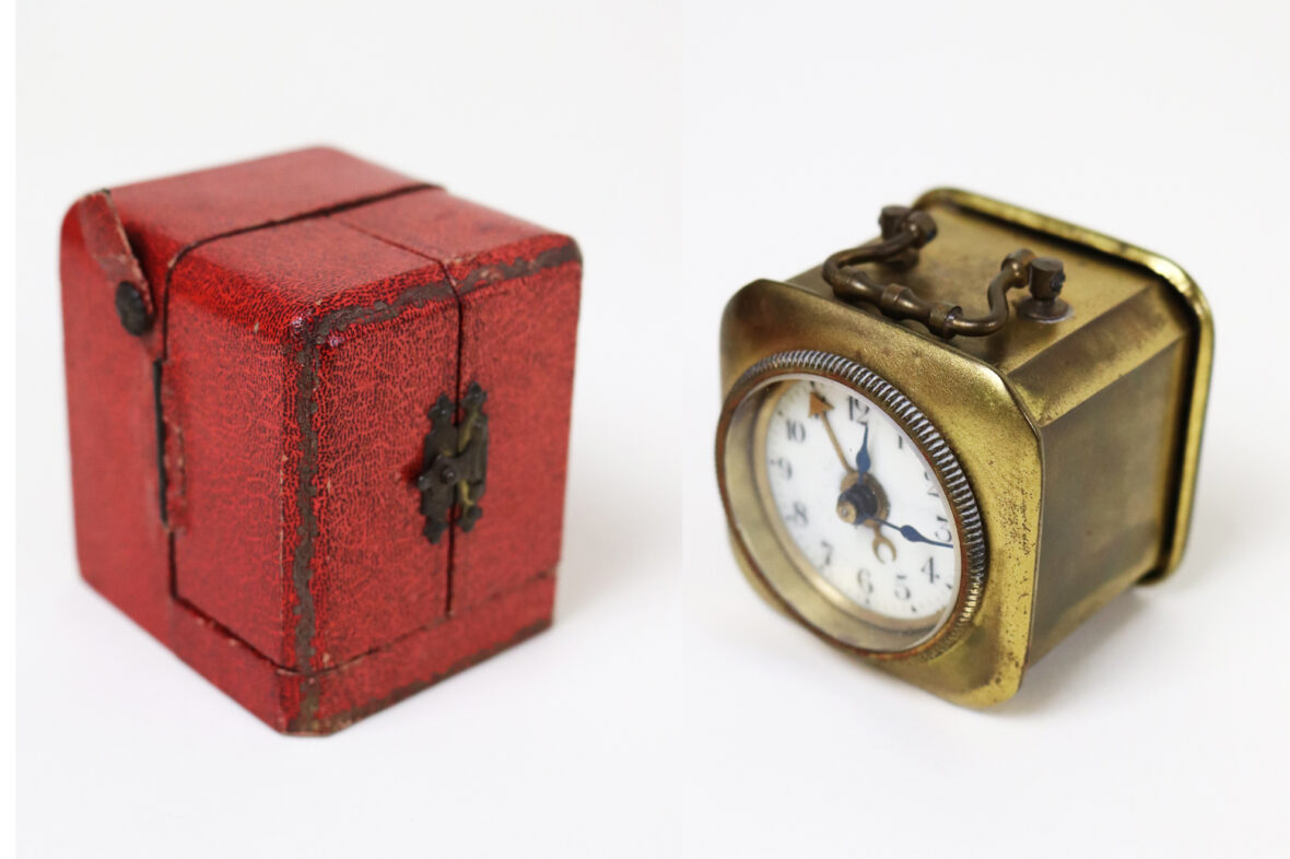 – un réveil de voyage « Bijou », le cadran émaillé blanc à chiffres arabes. Dans son petit écrin rouge.