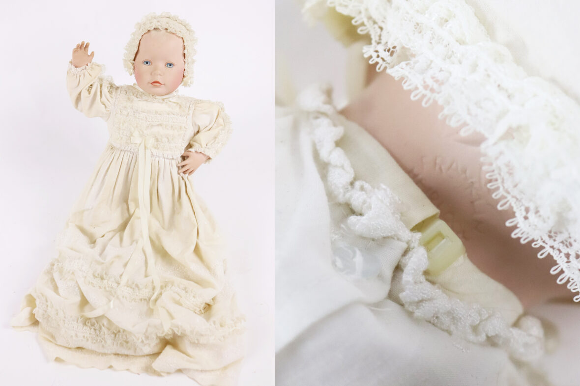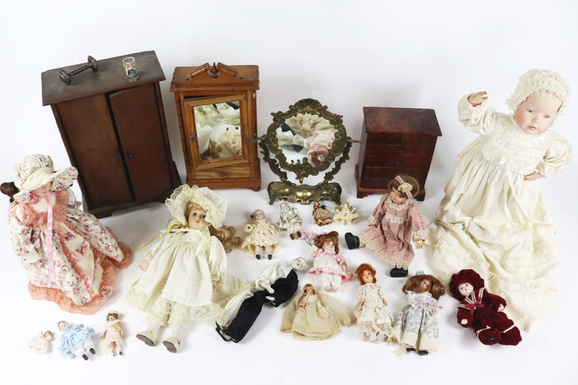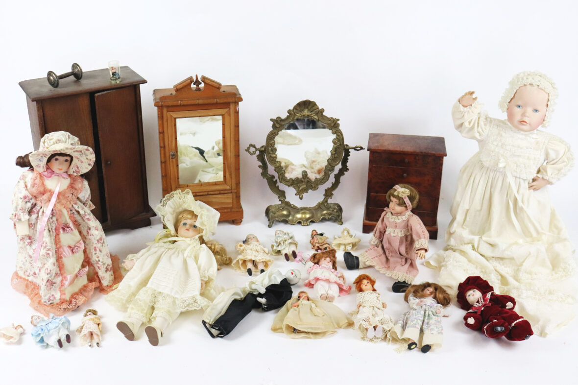 Ensemble comprenant une petite armoire de poupée en bois naturel, une armoire en rotin, une commode haute à tiroirs et poupées dont un poupon en robe de baptême.