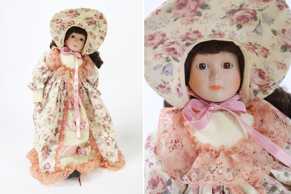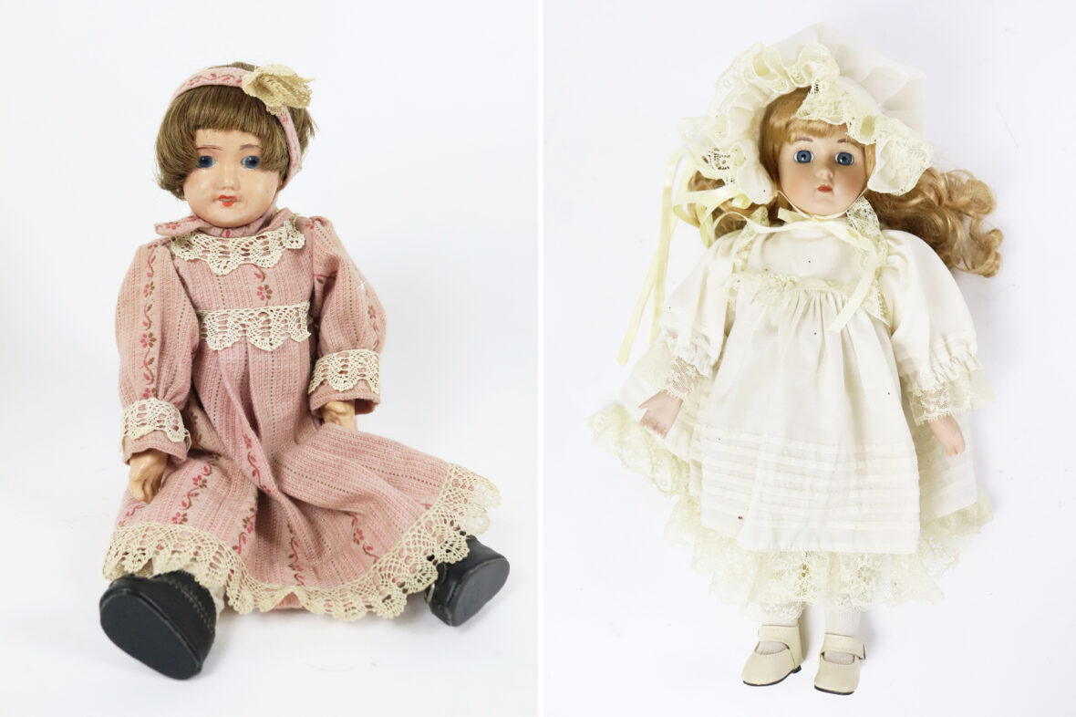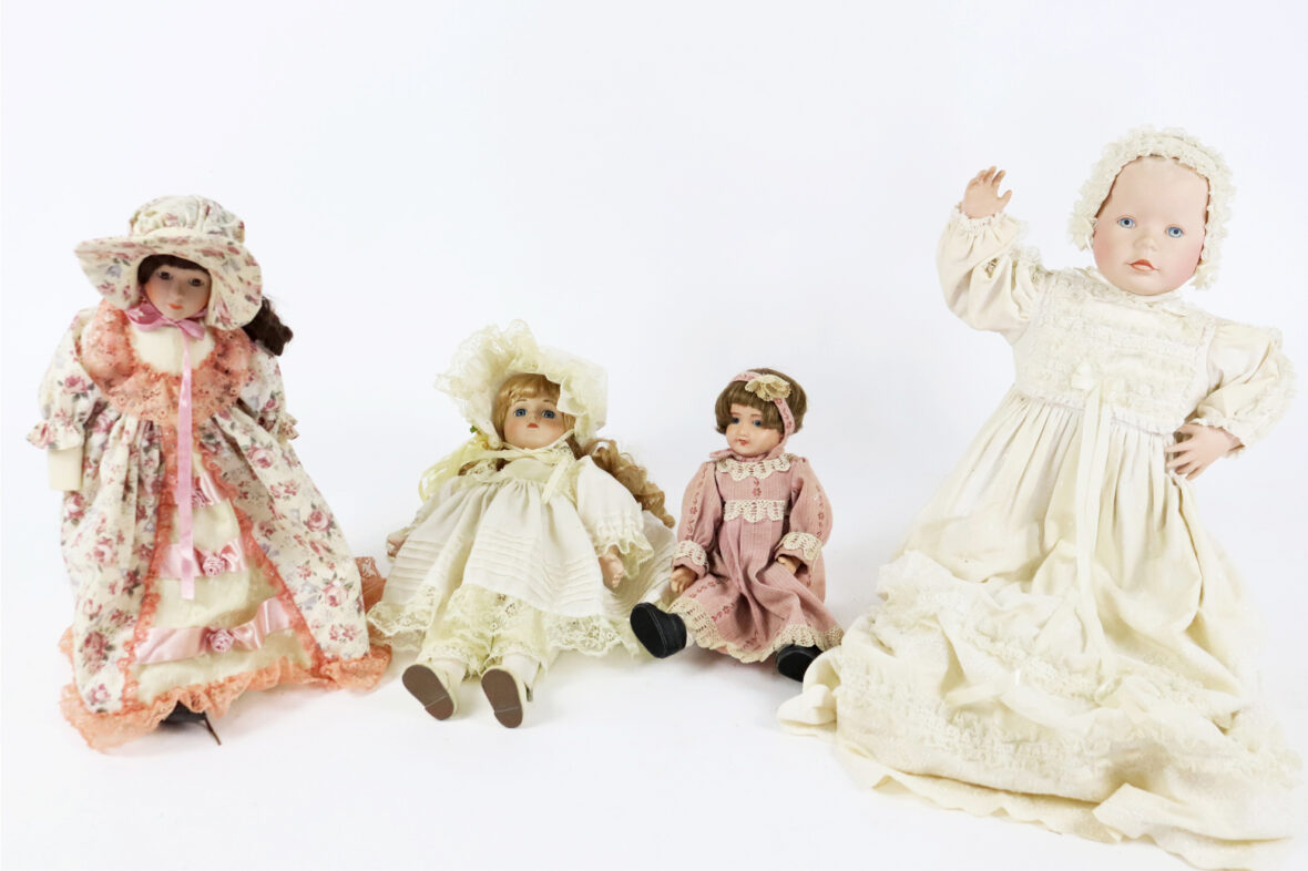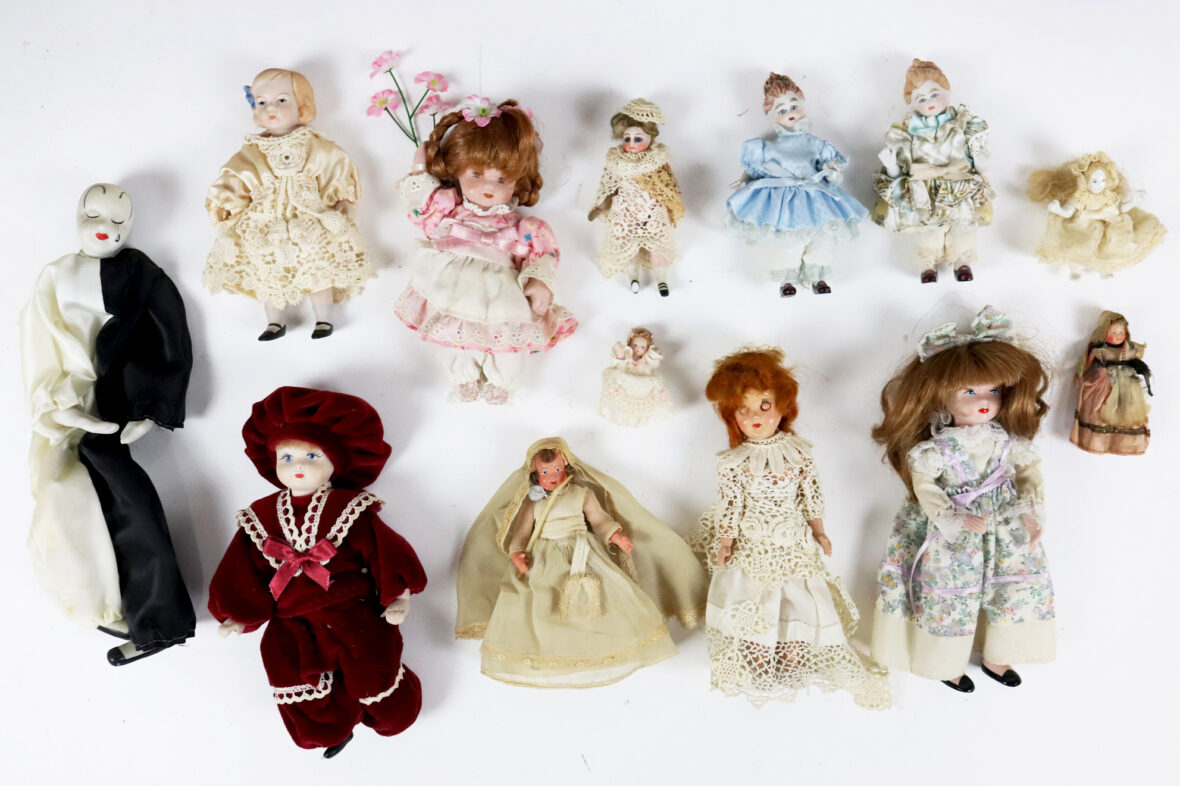 Ensemble comprenant une petite armoire de poupée en bois naturel, une armoire en rotin, une commode haute à tiroirs et poupées dont un poupon en robe de baptême.