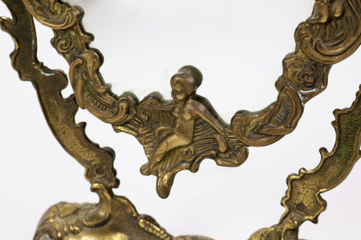On y joint un miroir à poser en bronze doré de style rocaille, la glace pivotant.