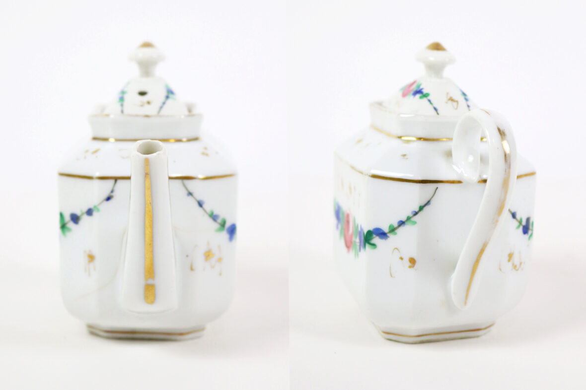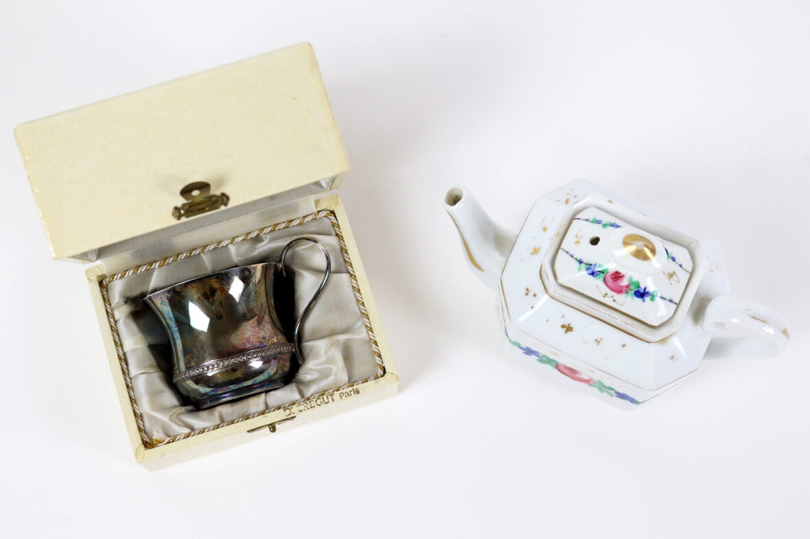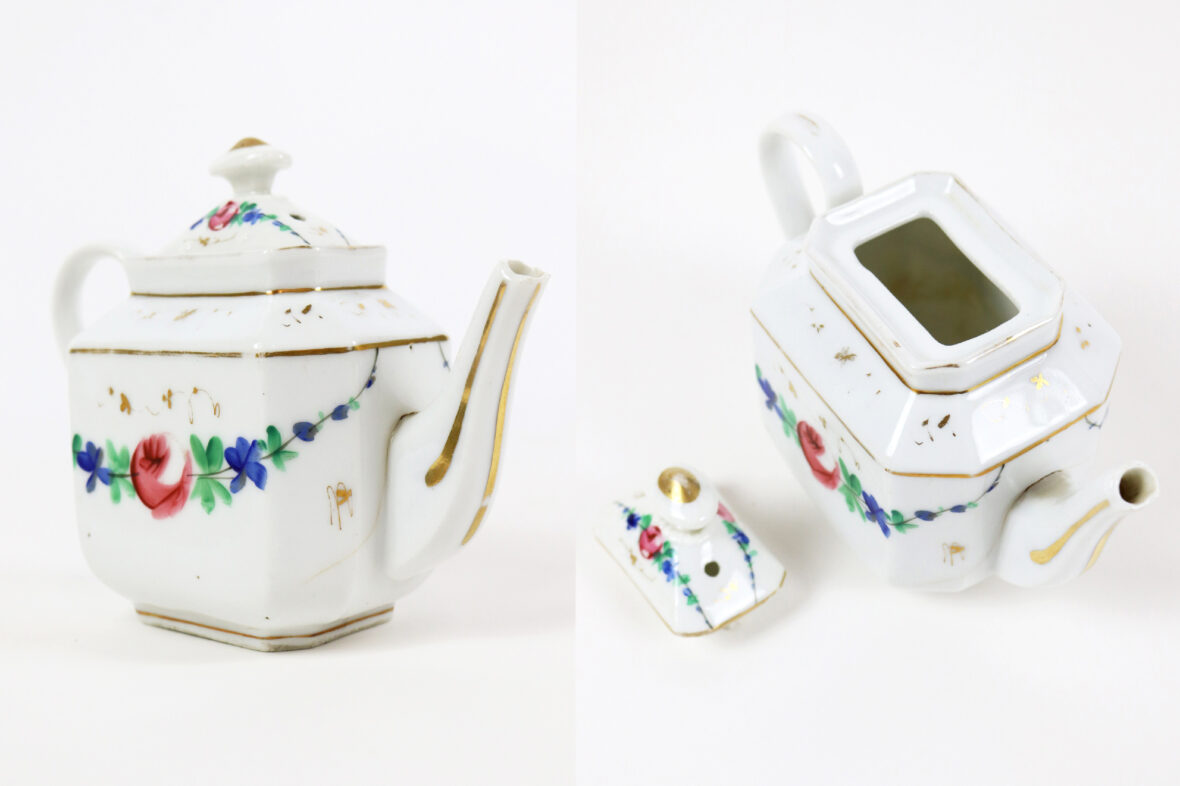 Ensemble comprenant une tasse en métal argenté à décor d’une frise de perles et une petite théière en porcelaine Vieux Paris à décor polychrome de guirlandes fleuries et rehauts de dorure.