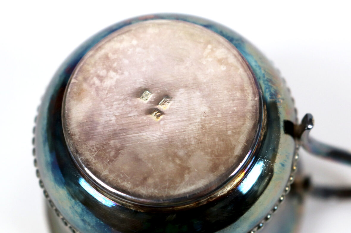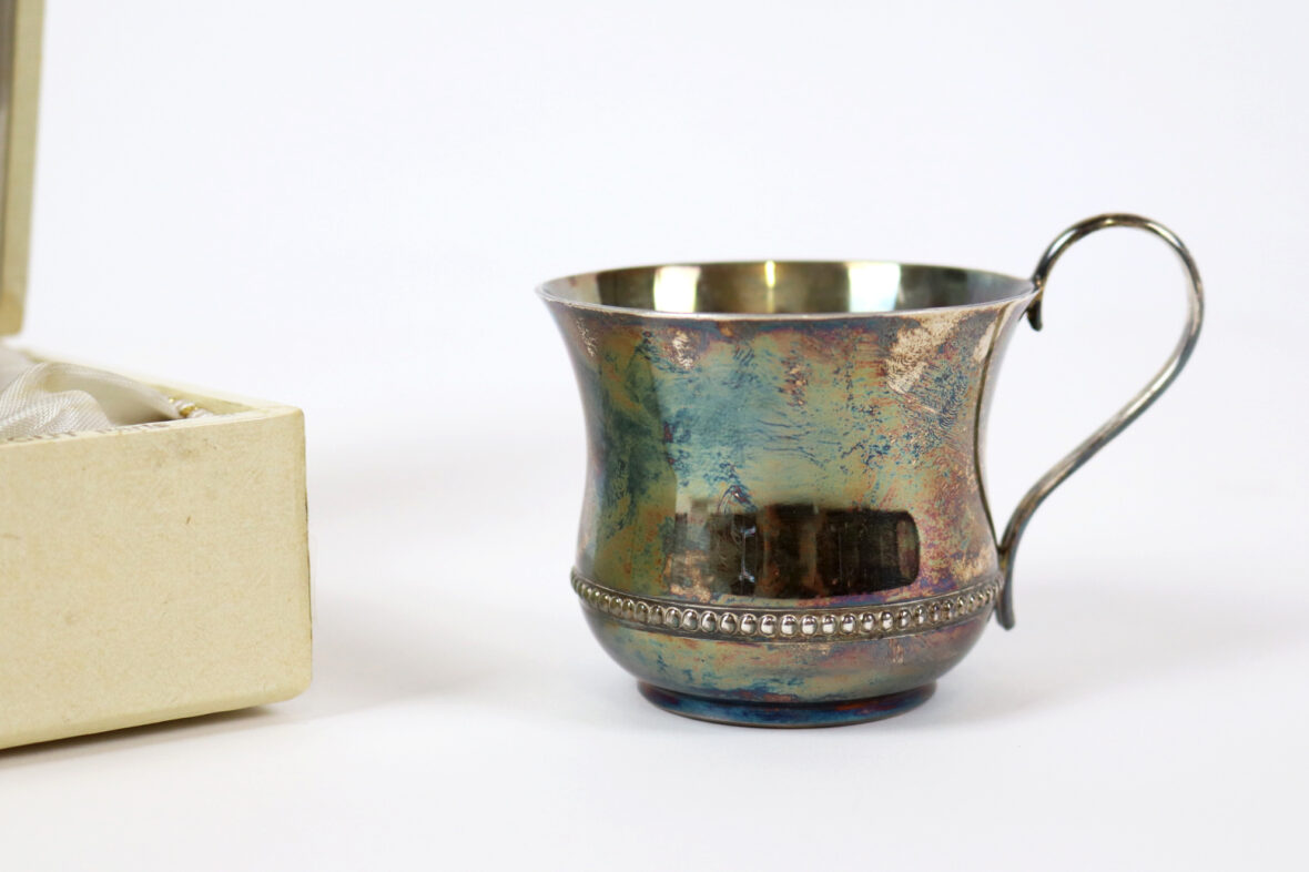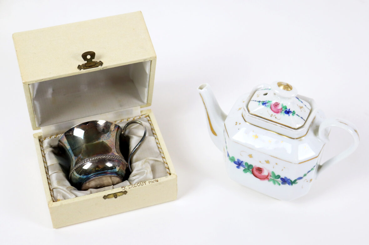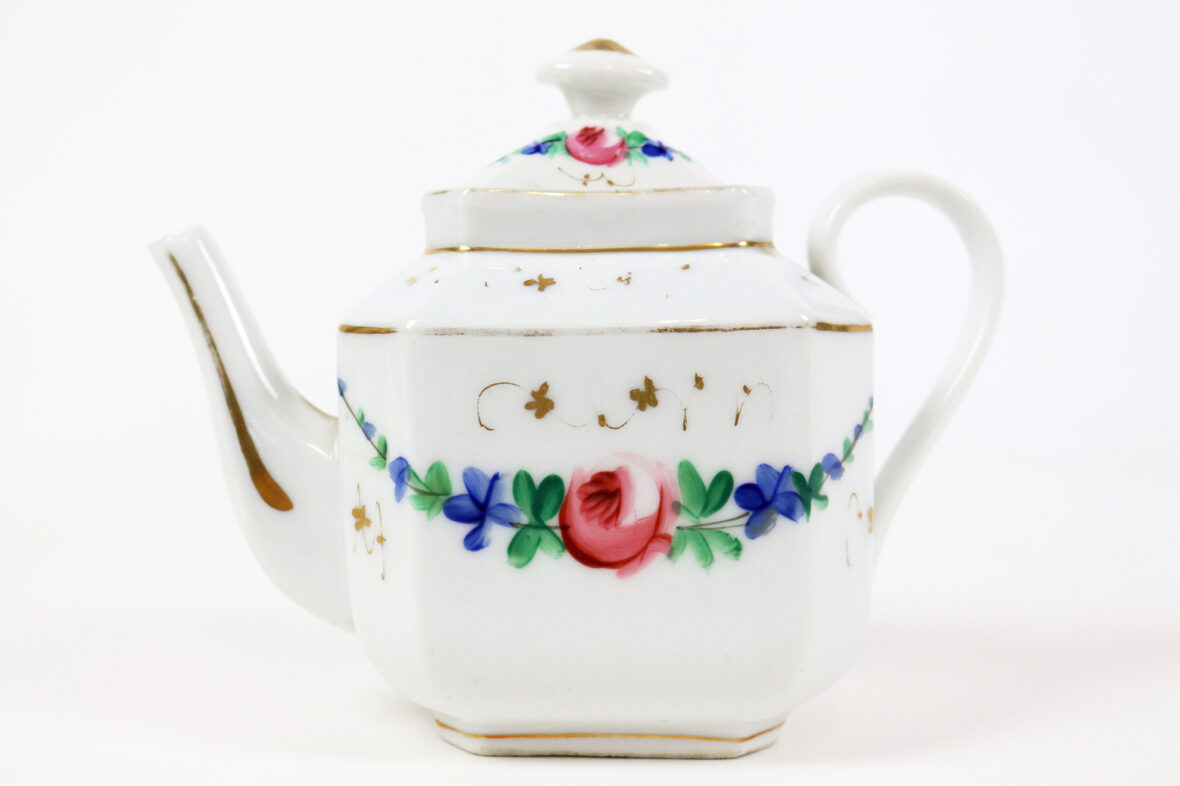 Ensemble comprenant une tasse en métal argenté à décor d’une frise de perles et une petite théière en porcelaine Vieux Paris à décor polychrome de guirlandes fleuries et rehauts de dorure.