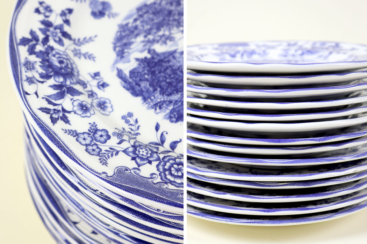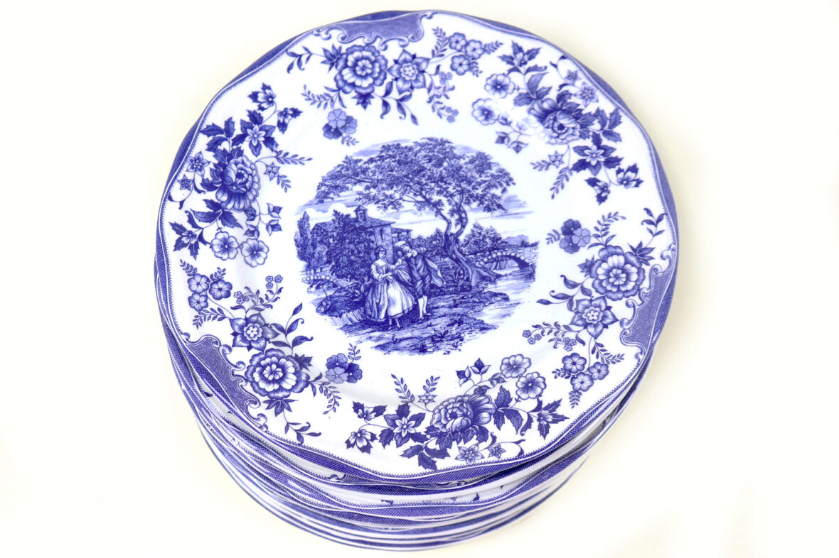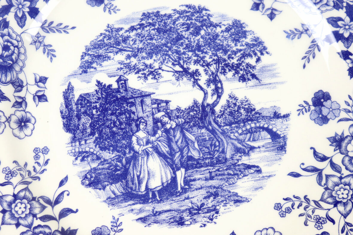 Ensemble de 12 assiettes en faïence à décor imprimé bleu de scènes galantes dans le bassin et jetés de fleurs sur l’aile.