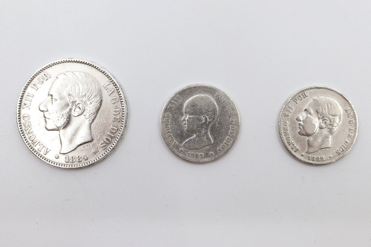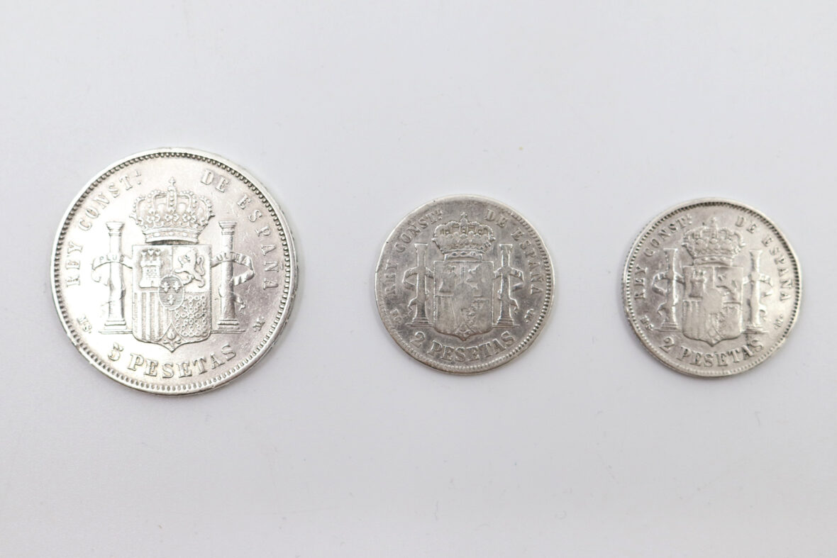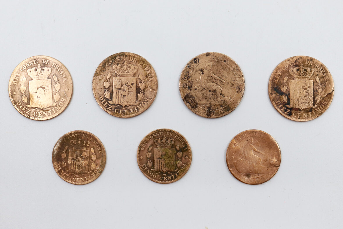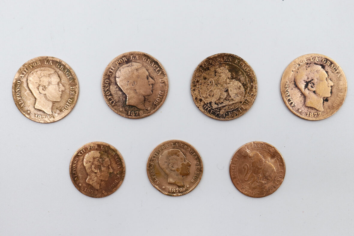 Ensemble de 7 pièces espagnoles en cuivre dont 5 et 10 centimes et 3 pièces espagnoles en argent dont 2 et 5 pesetas.