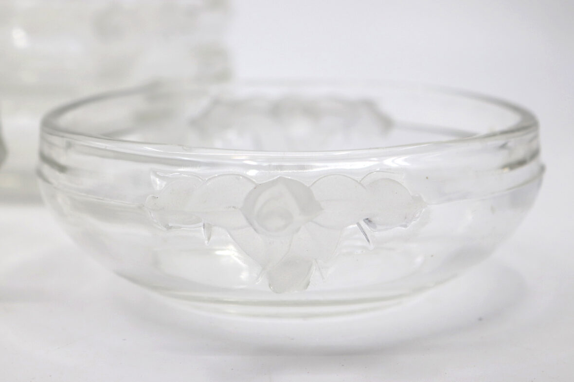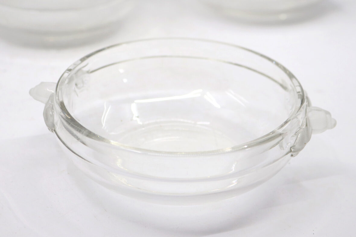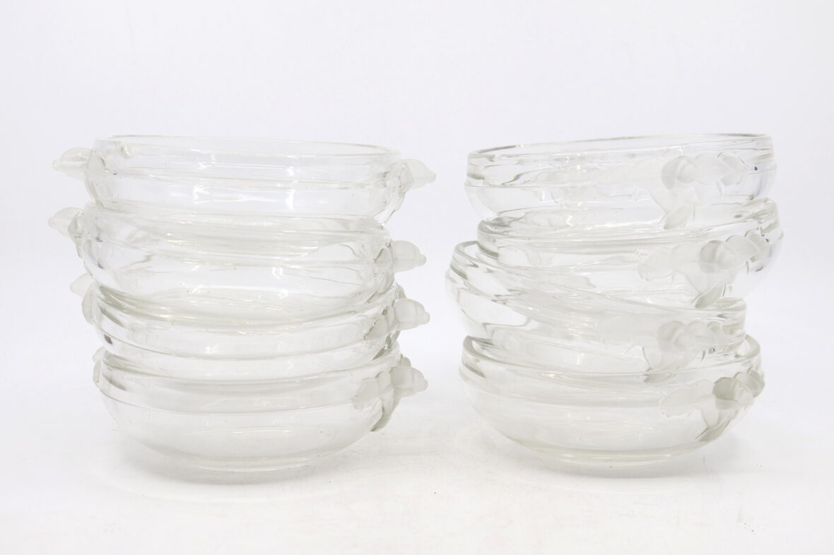 Ensemble de 8 coupelles en verre pressé moulé transparent, les anses en forme de roses en verre sablé.