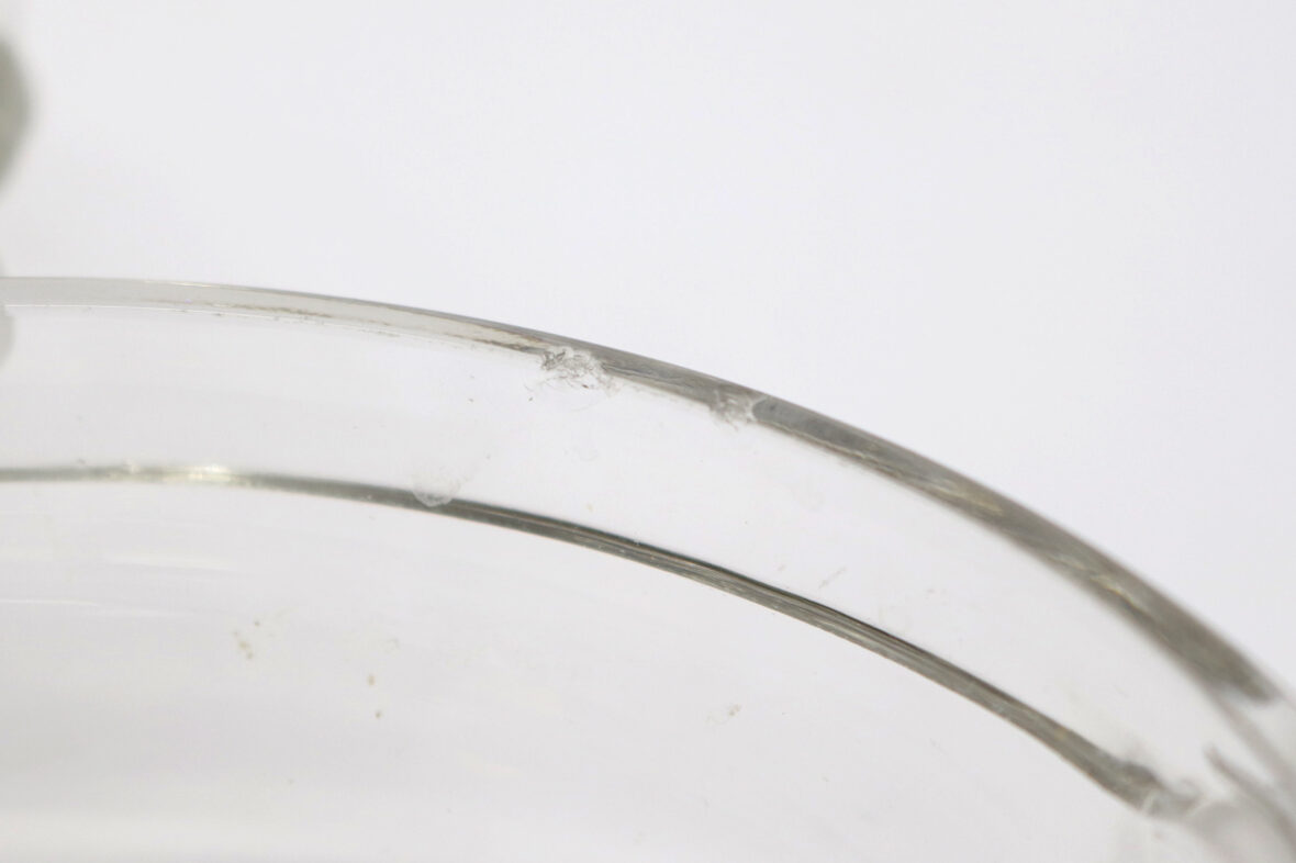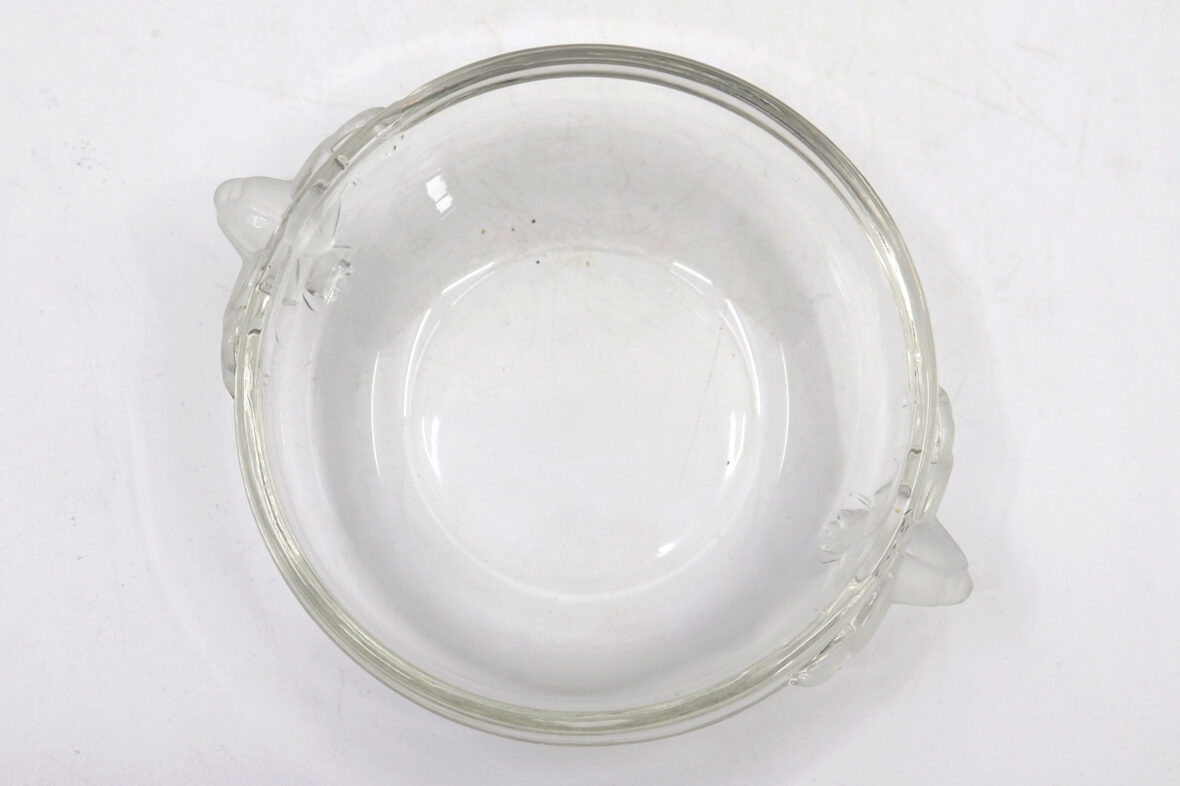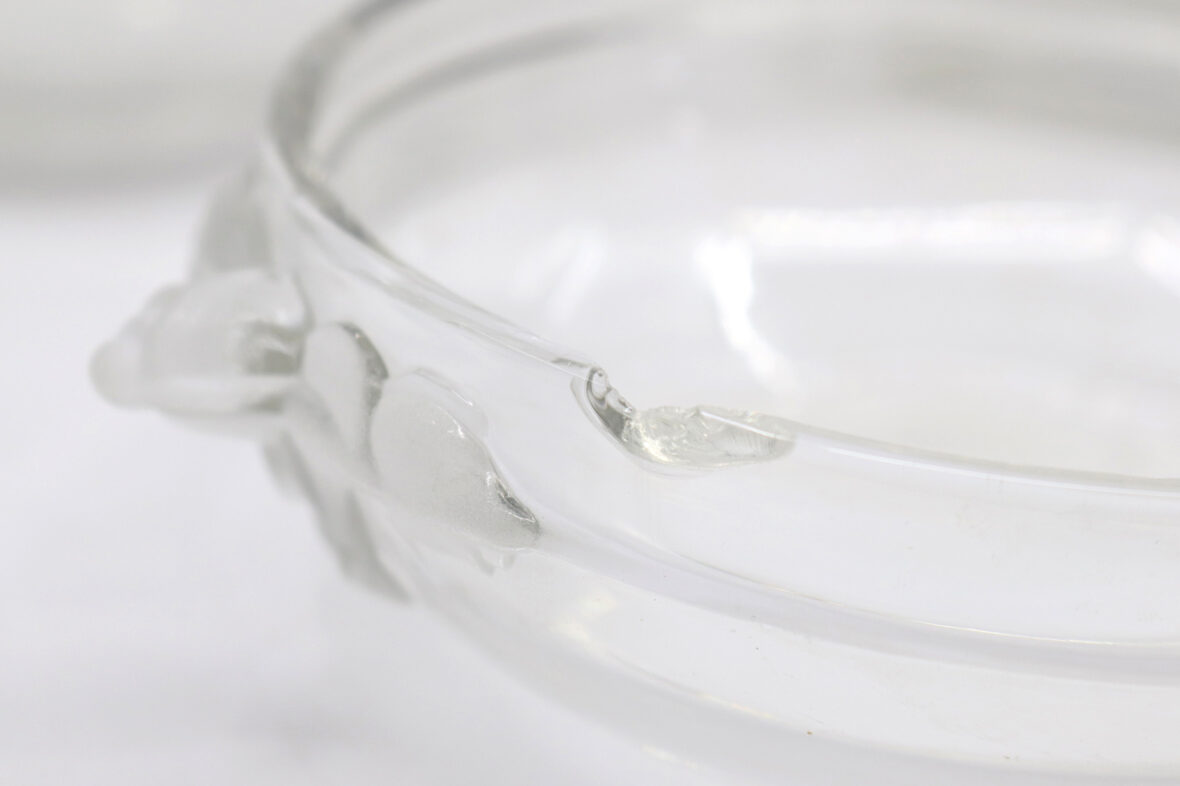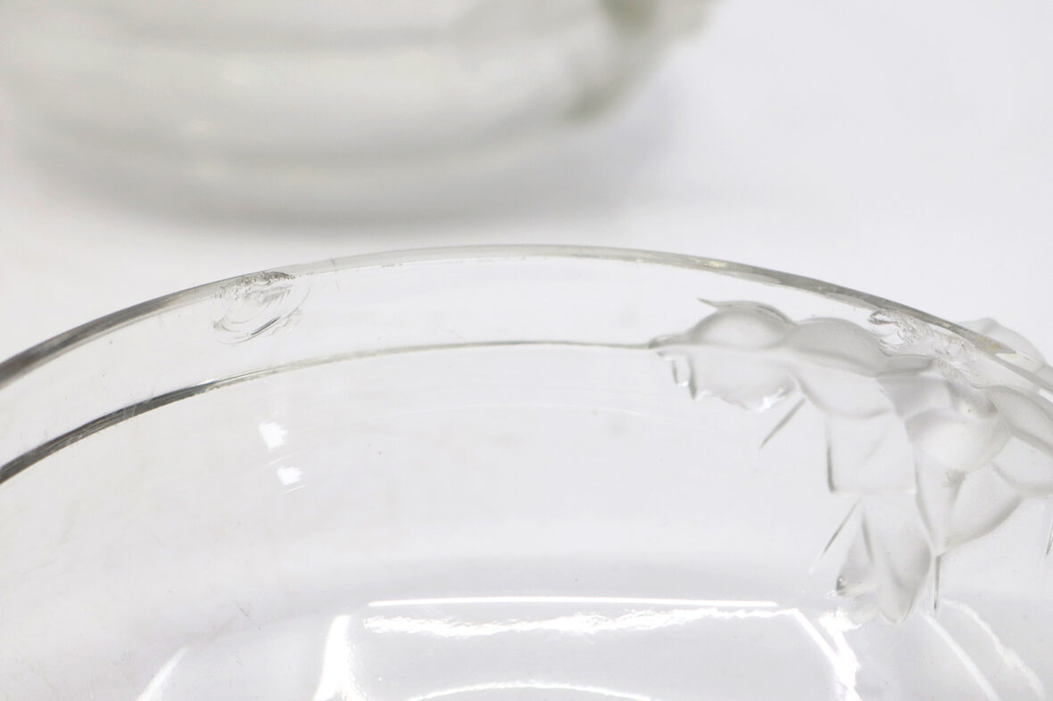 Ensemble de 8 coupelles en verre pressé moulé transparent, les anses en forme de roses en verre sablé.