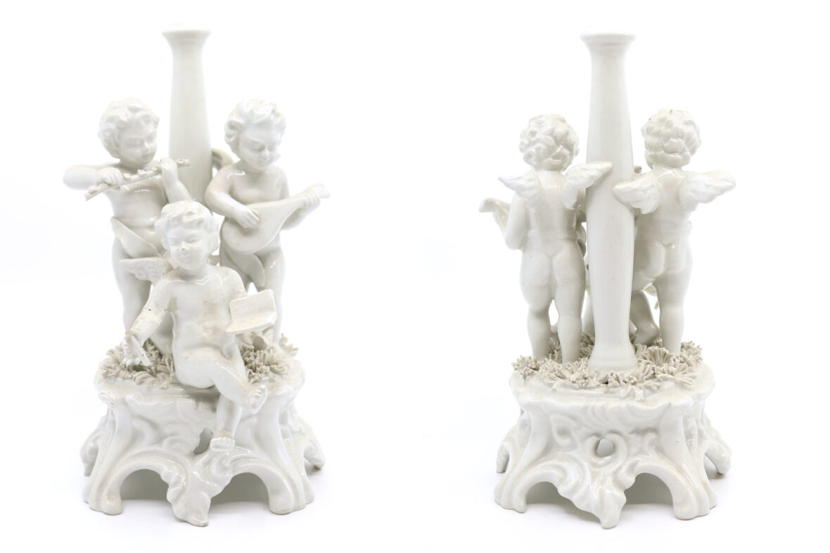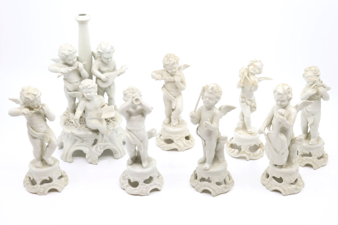 Ensemble de 8 sujets en porcelaine émaillée blanche représentant des anges musiciens sur un socle rocaille.