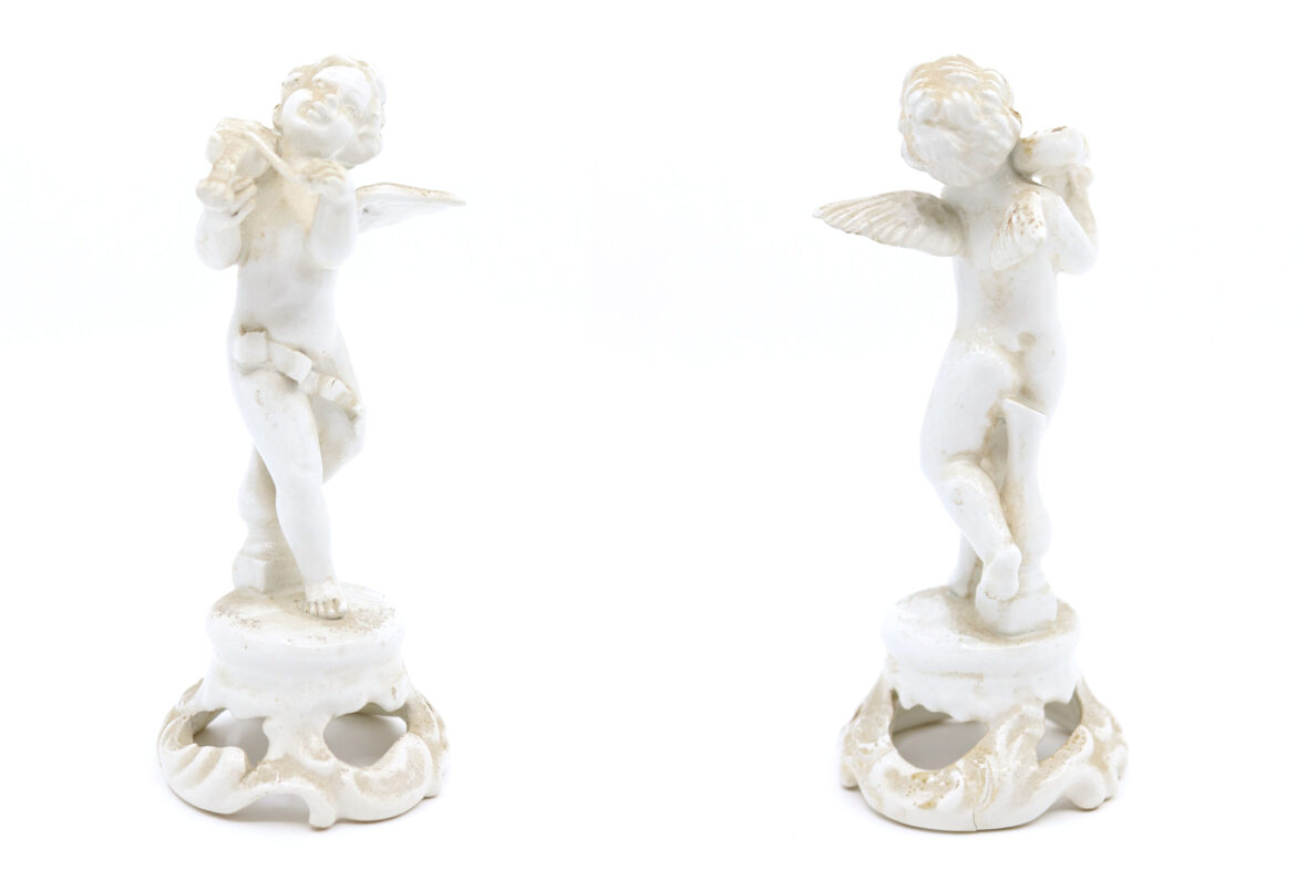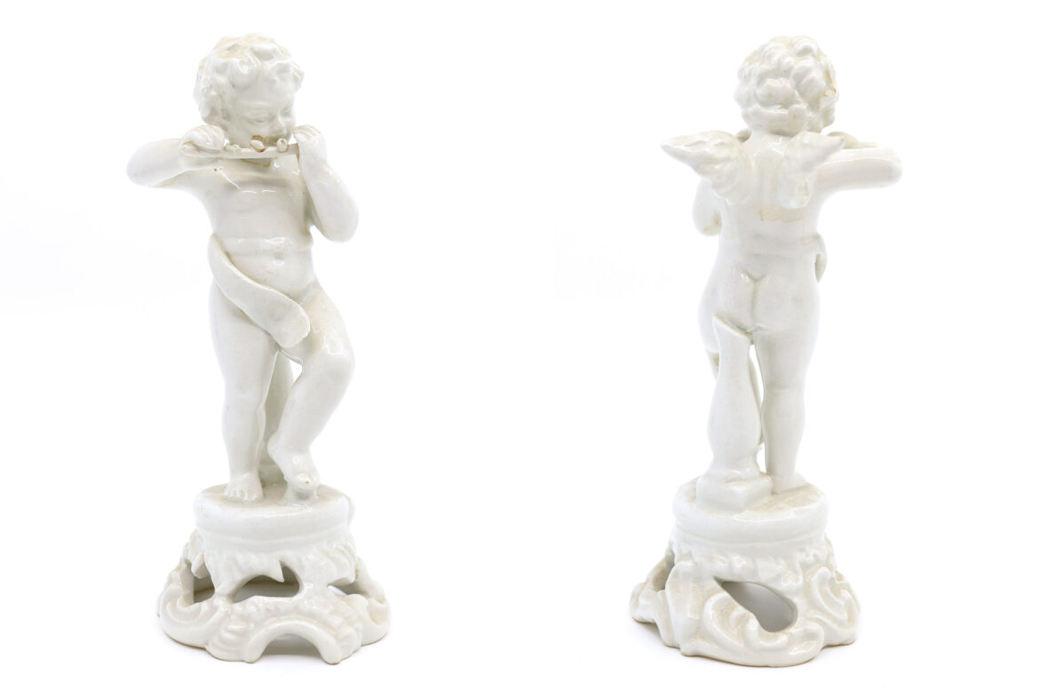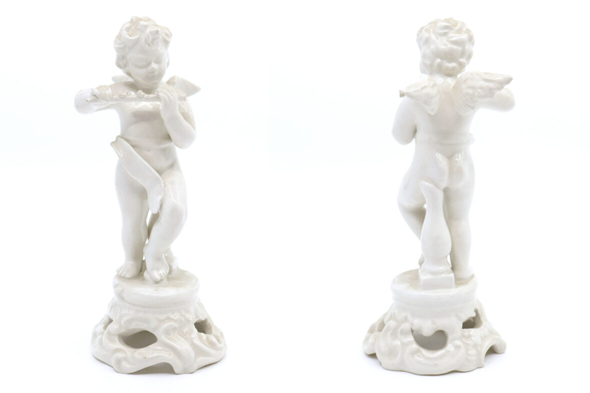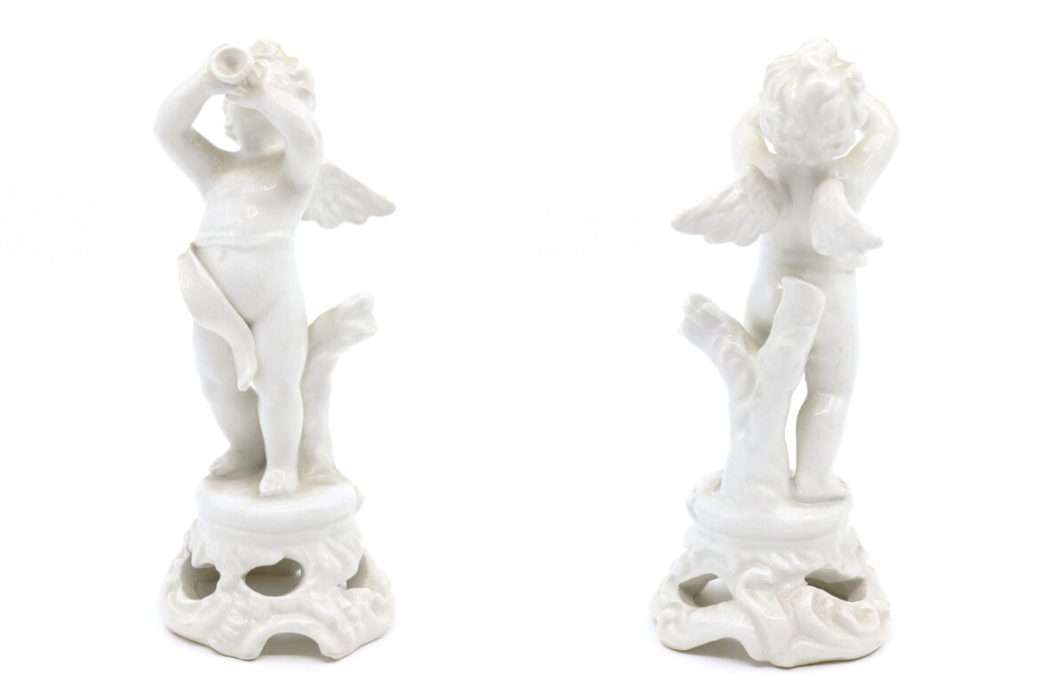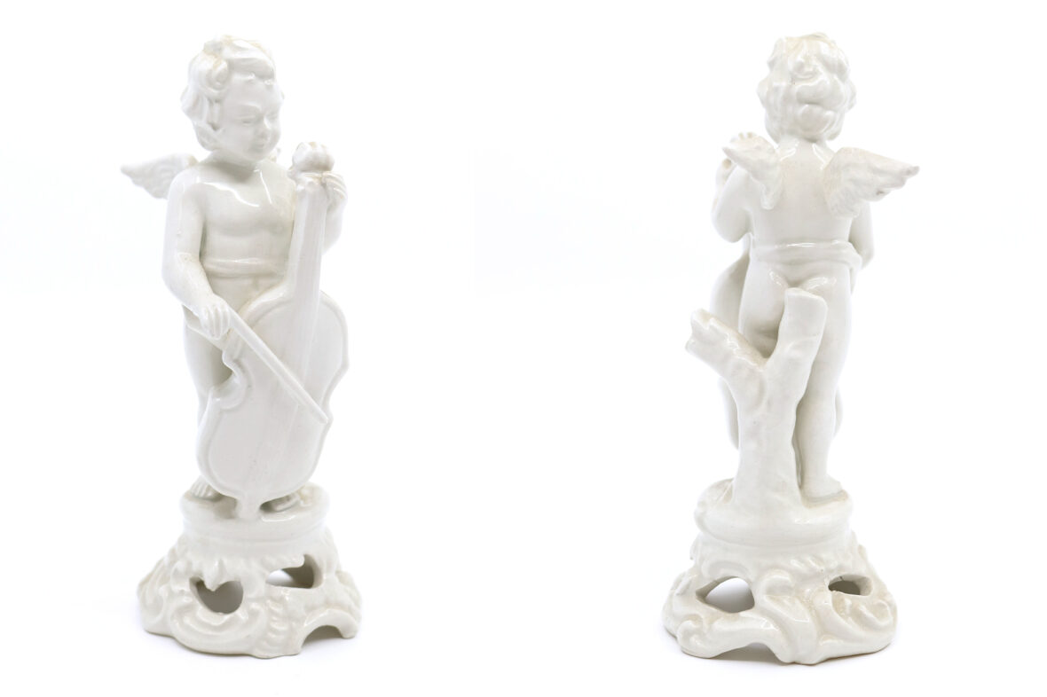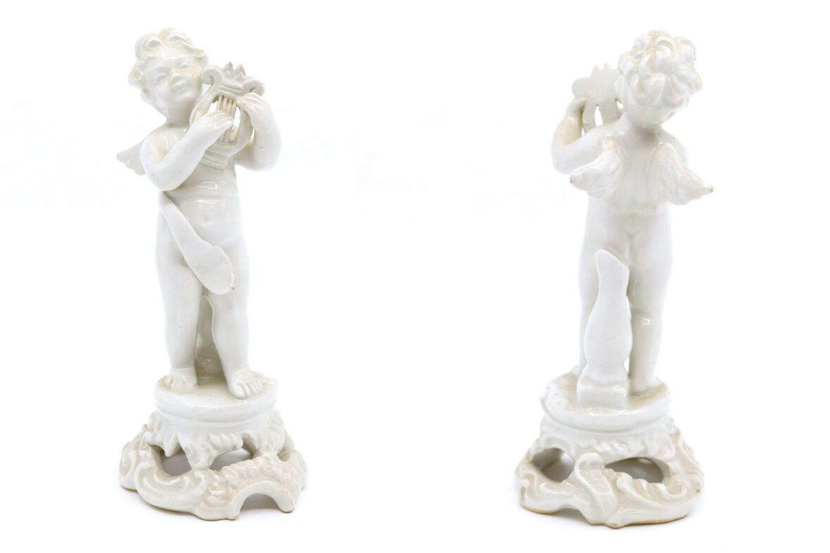 Ensemble de 8 sujets en porcelaine émaillée blanche représentant des anges musiciens…