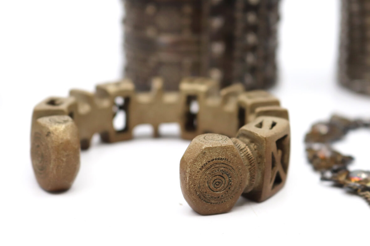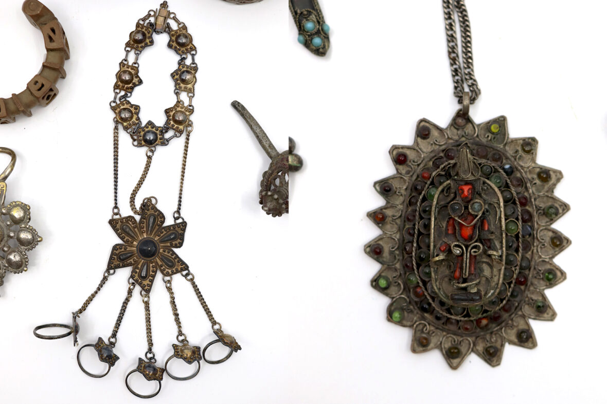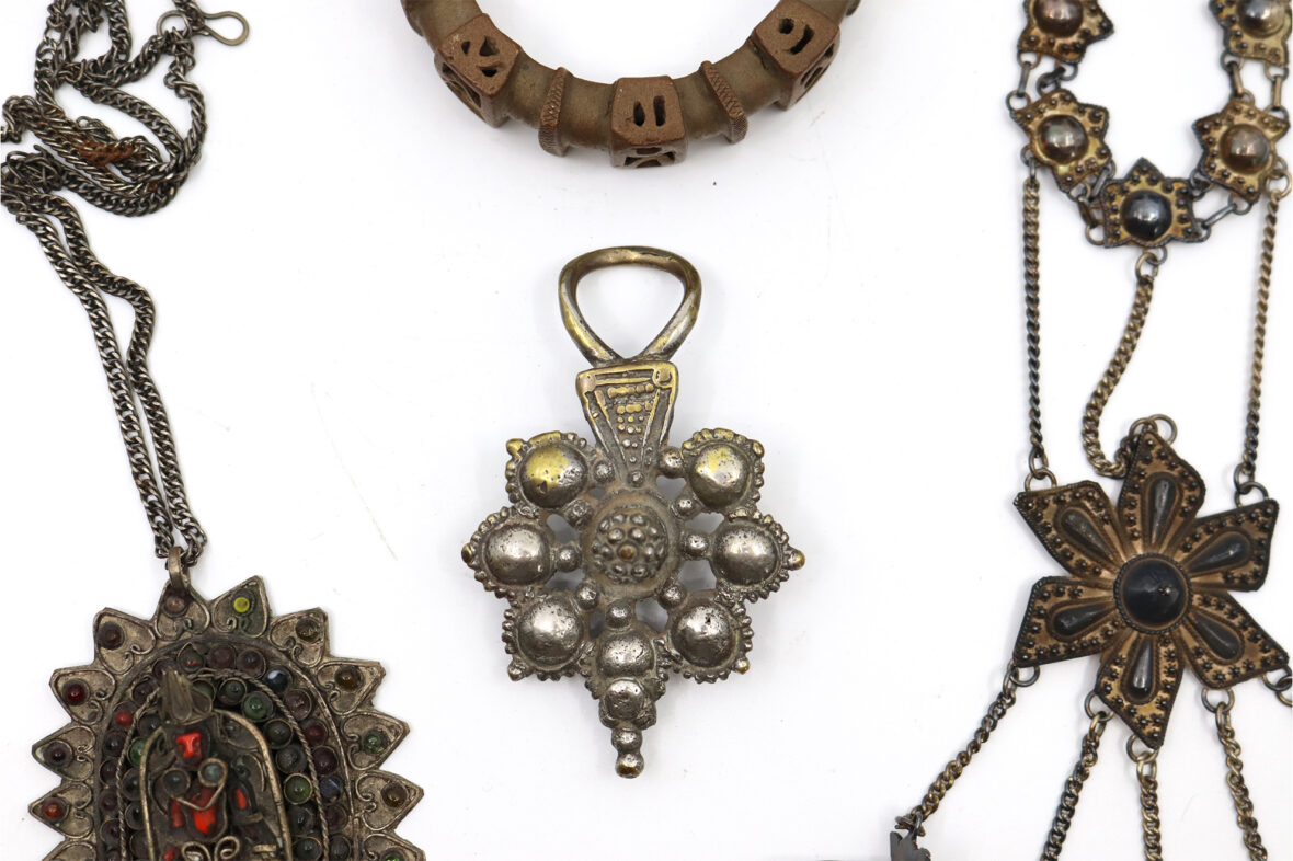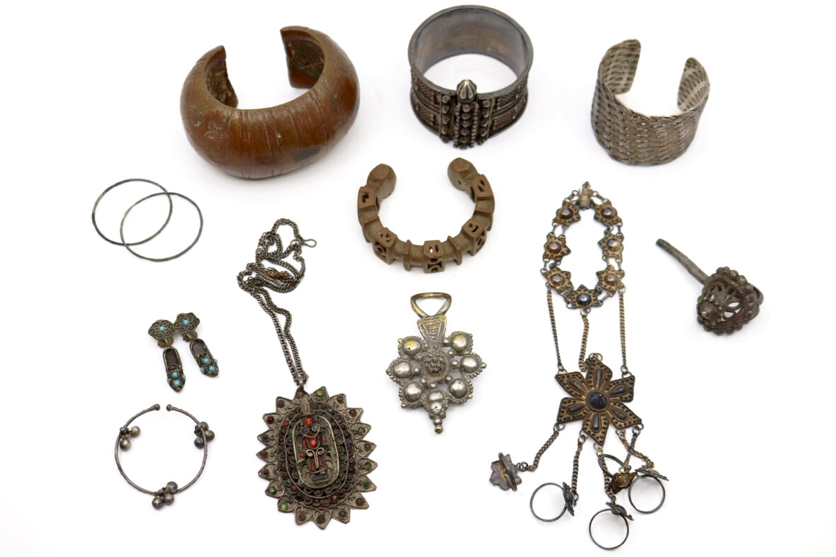 Ensemble de bijoux ethniques comprenant manchettes, pendentifs et boucles d’oreilles.
