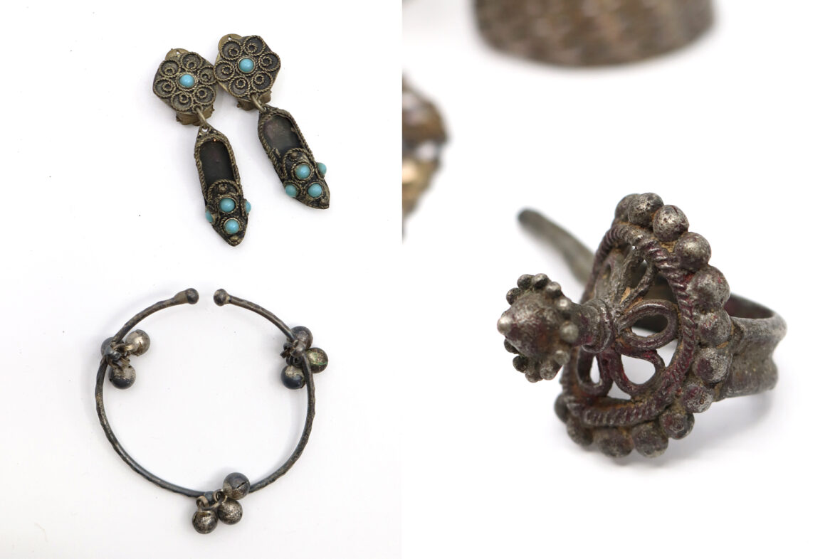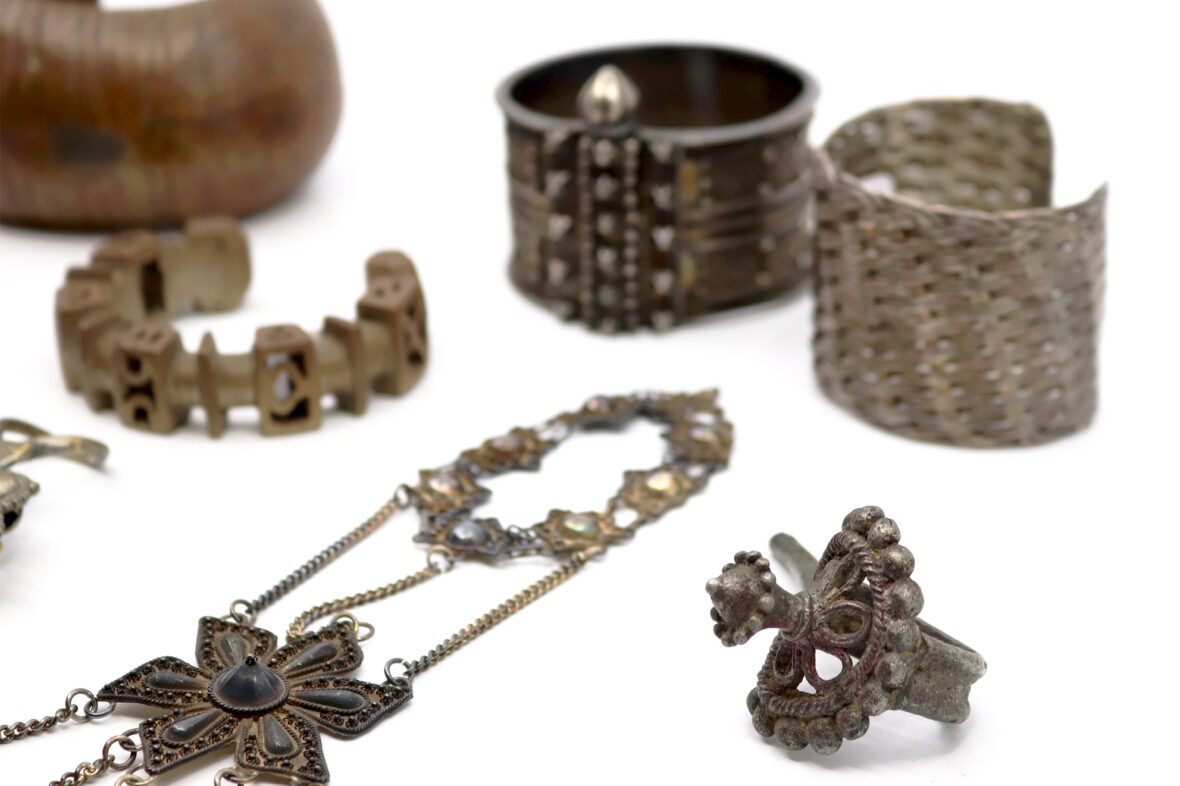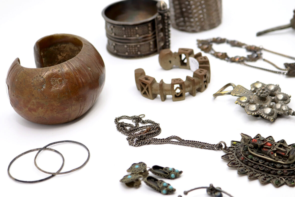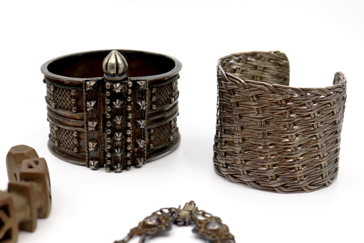 Ensemble de bijoux ethniques comprenant manchettes, pendentifs et boucles d’oreilles.