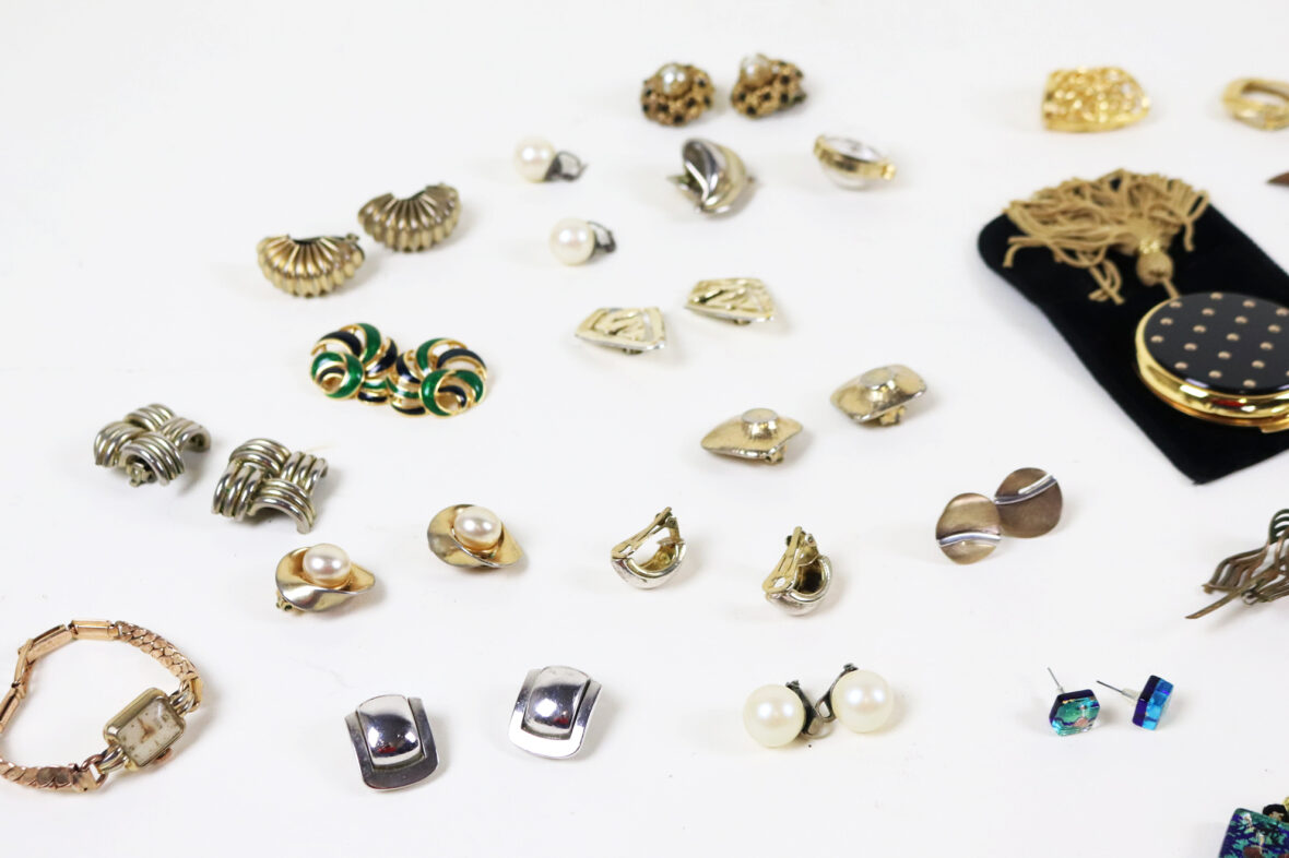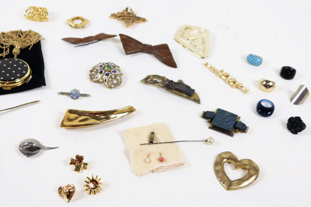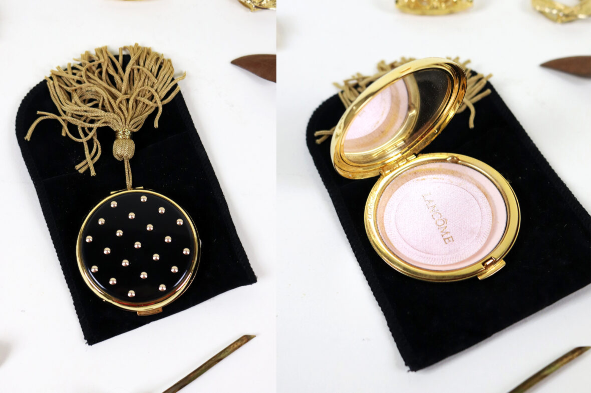 Ensemble de bijoux fantaisie comprenant notamment bagues, broches, clips d’oreille, une demi parure en verre de Murano (collier formé d’un cordon et d’une plaque et une paire de boutons d’oreilles à décor d’inclusions or et vertes sur fond bleu), une montre bracelet en plaqué or (10 microns), une montre pendentif publicitaire pour le Paris Saint Germain et trois pins Arthus Bertrand Paris. On y joint un poudrier LANCÔME « Poudre Majeur compacte 01 » (état quasi neuf). A découvrir.