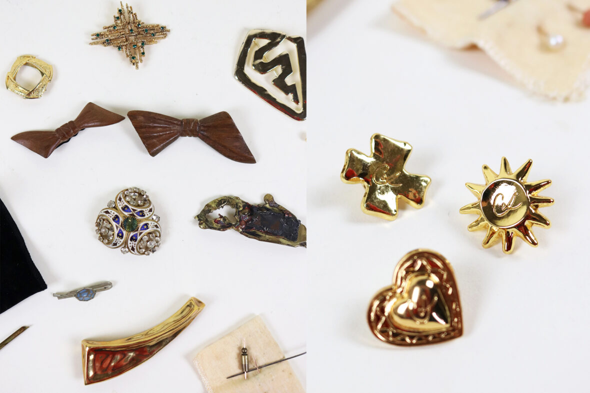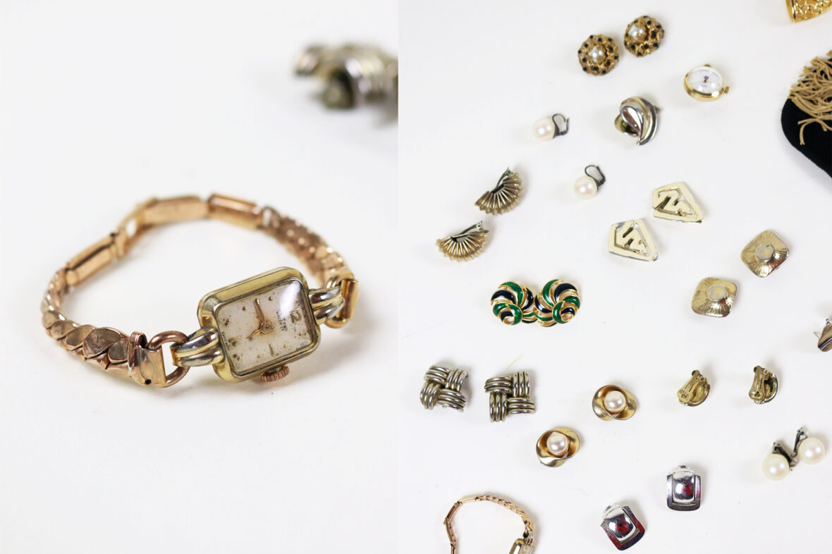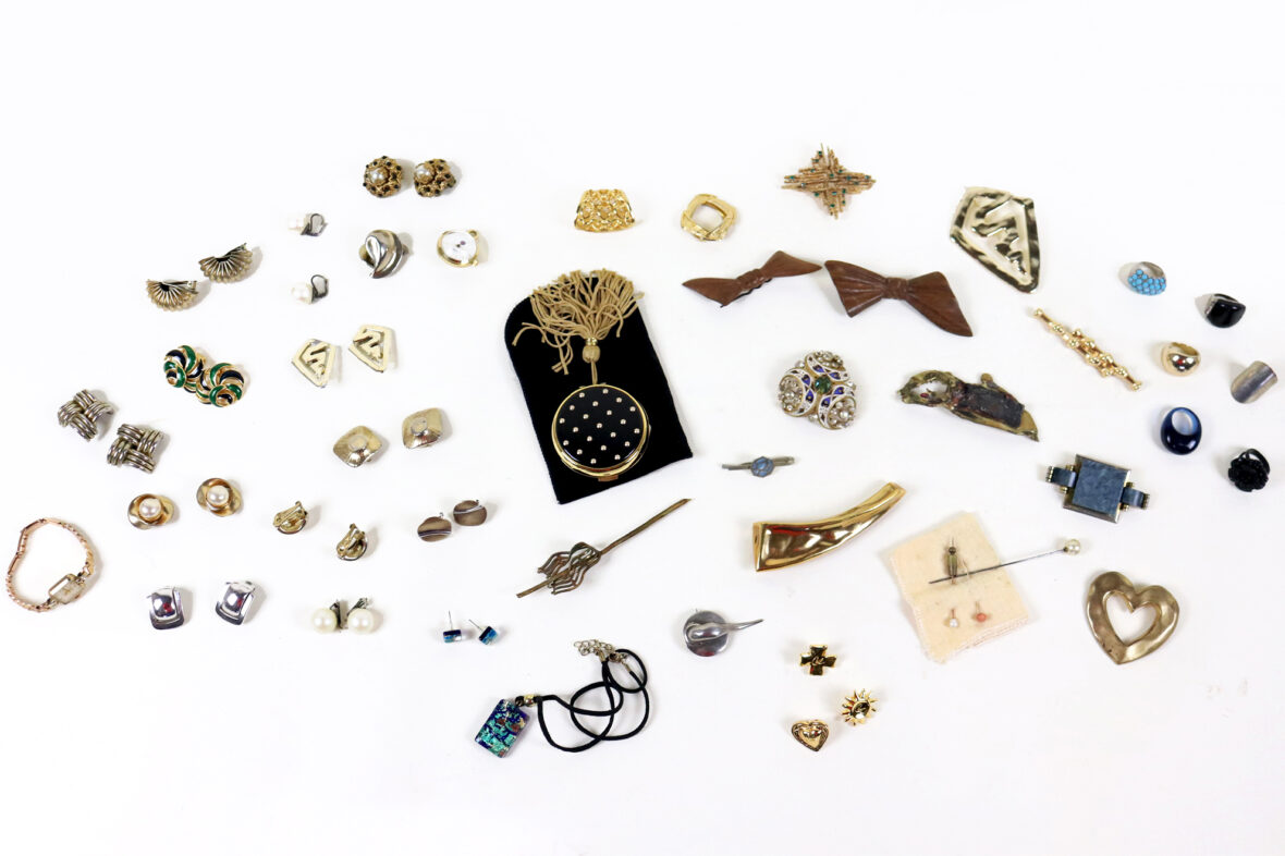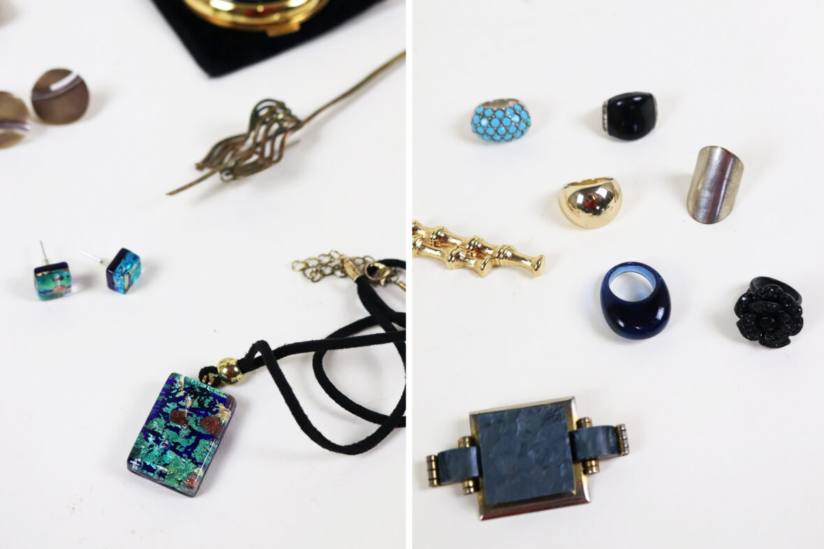 Ensemble de bijoux fantaisie comprenant notamment bagues, broches, clips d’oreille, une demi parure en verre de Murano (collier formé d’un cordon et d’une plaque et une paire de boutons d’oreilles à décor d’inclusions or et vertes sur fond bleu), une montre bracelet en plaqué or (10 microns), une montre pendentif publicitaire pour le Paris Saint Germain et trois pins Arthus Bertrand Paris. On y joint un poudrier LANCÔME « Poudre Majeur compacte 01 » (état quasi neuf). A découvrir.