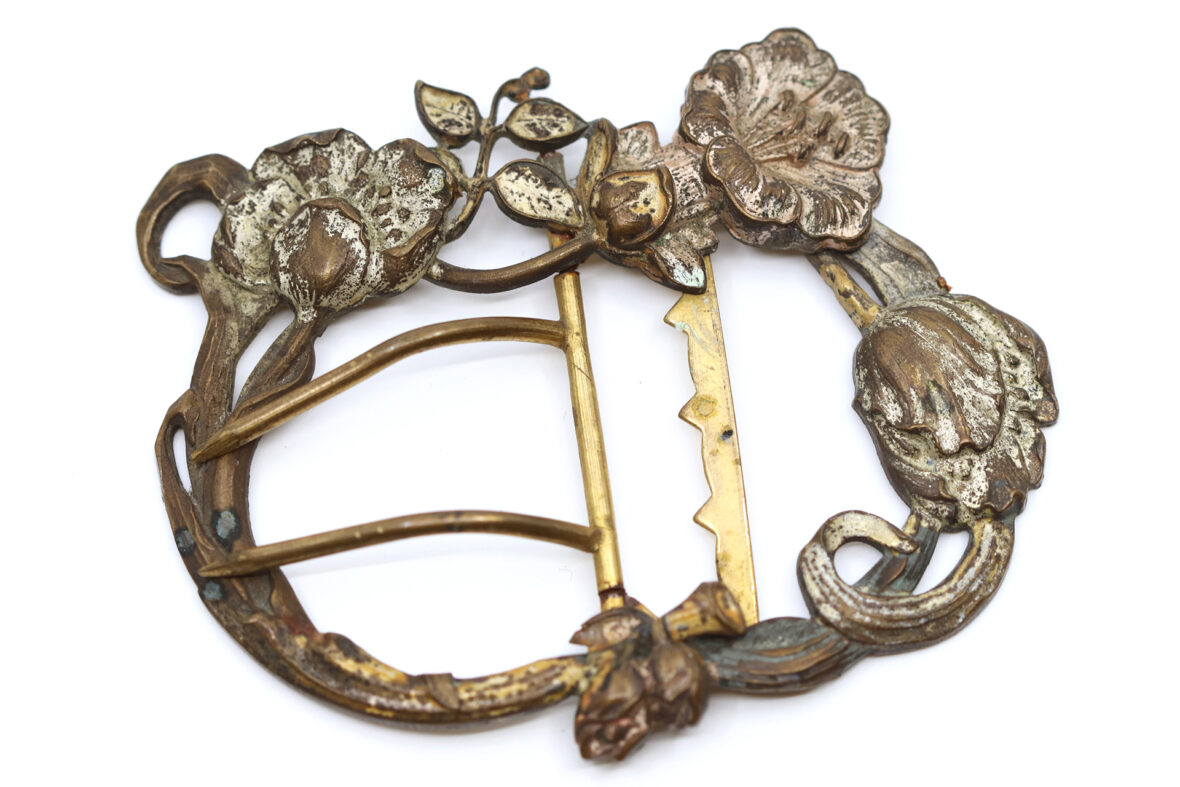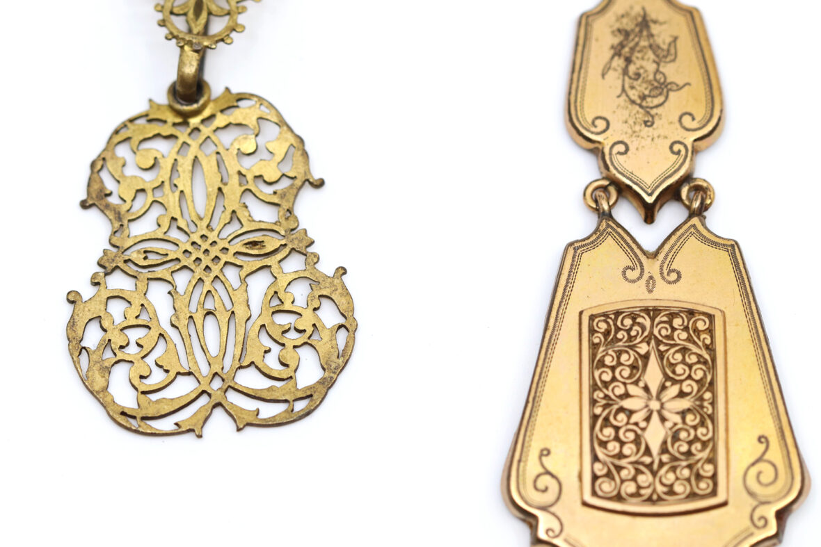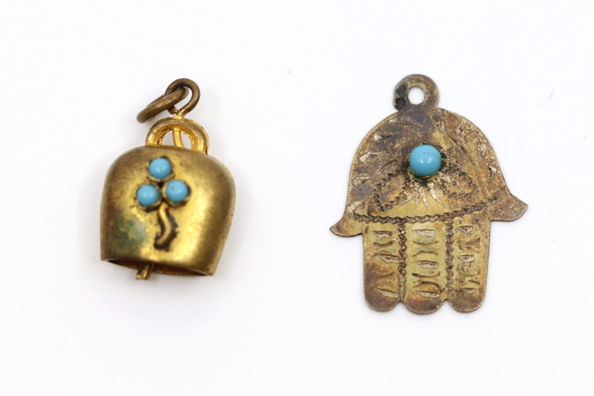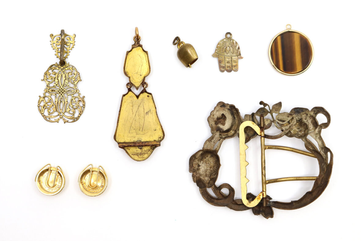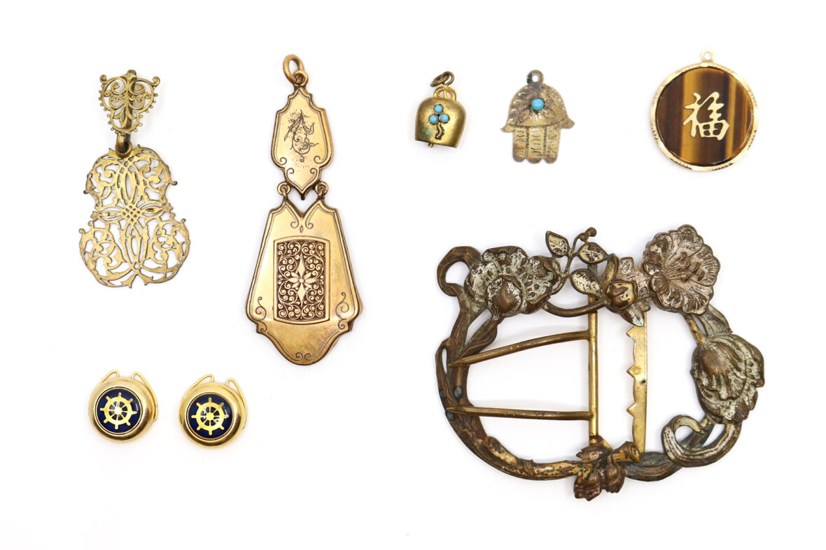 Ensemble de bijoux fantaisie comprenant notamment un pendentif « main de Fatma », un pendentif « cloche », une boucle de ceinture en métal à décor de rinceaux fleuris, une paire de boutons à décor de gouvernail, un pendentif chinois en métal doré orné d’une plaque ronde en œil-de-tigre et deux pendentifs en métal doré.