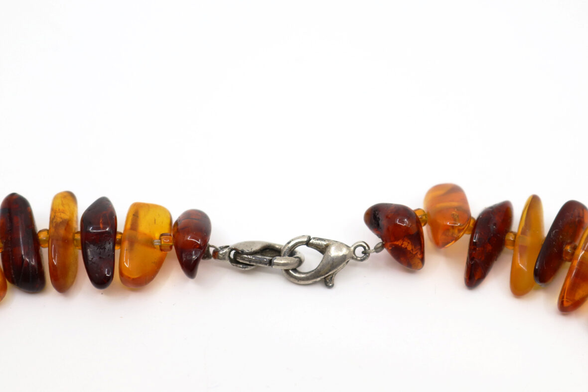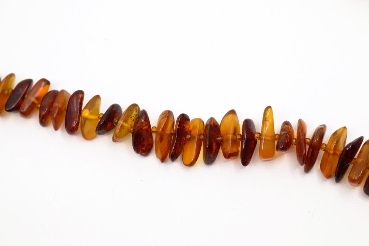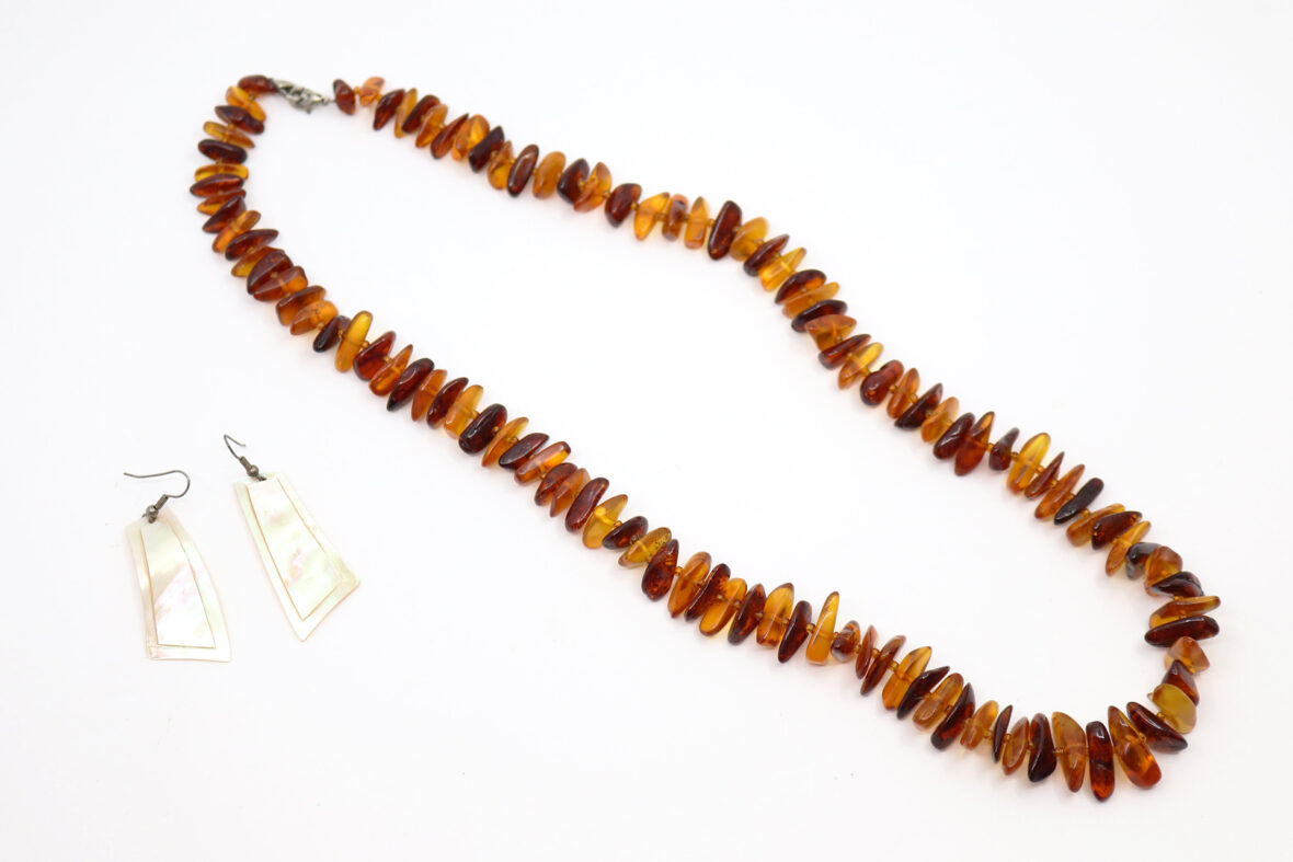 Ensemble de bijoux fantaisie comprenant une paire de pendants d’oreilles en nacre, un sautoir en pierres à l’imitation de l’ambre.