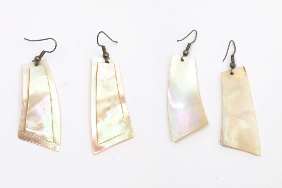 Ensemble de bijoux fantaisie comprenant une paire de pendants d’oreilles en nacre, un sautoir en pierres à l’imitation de l’ambre.