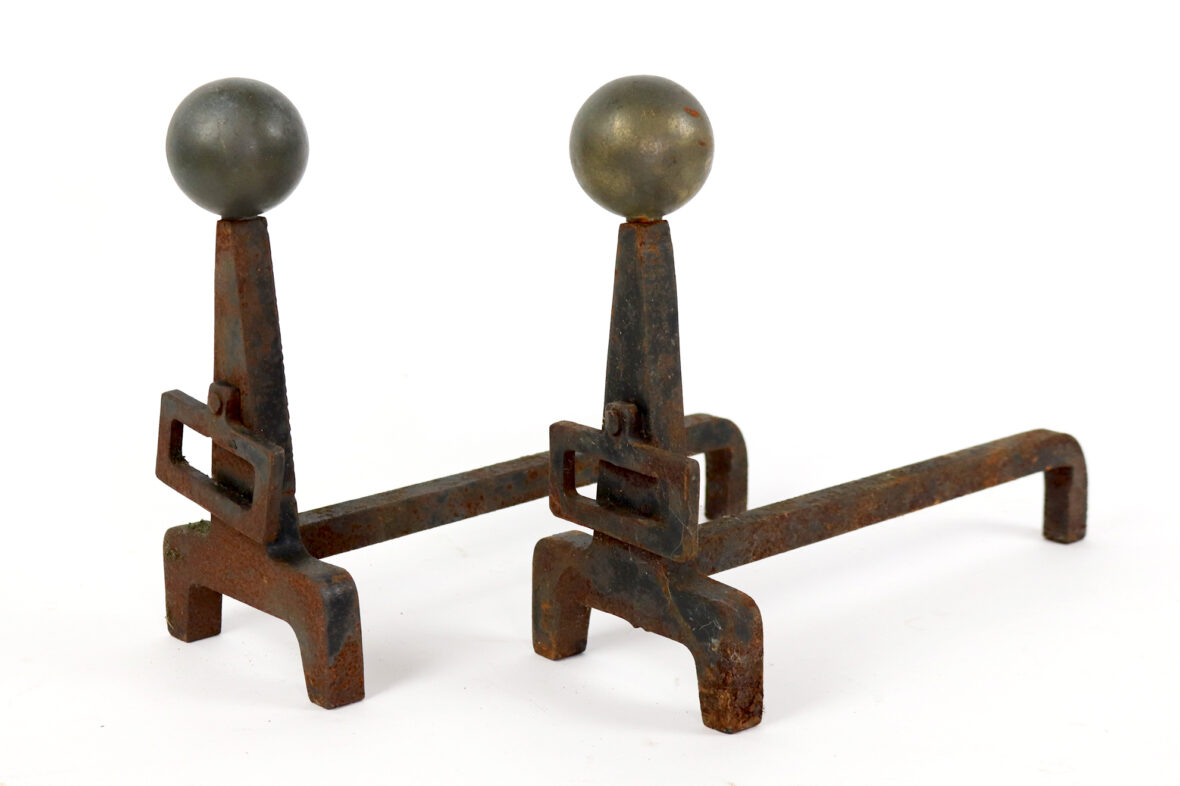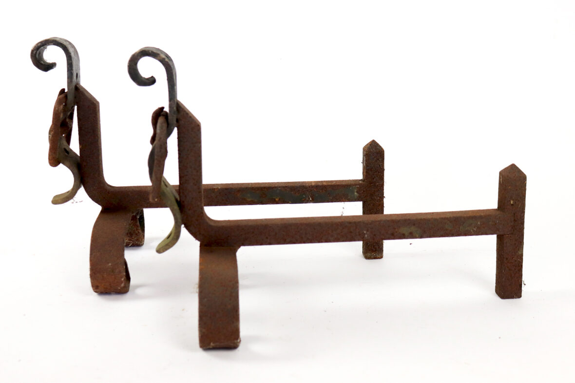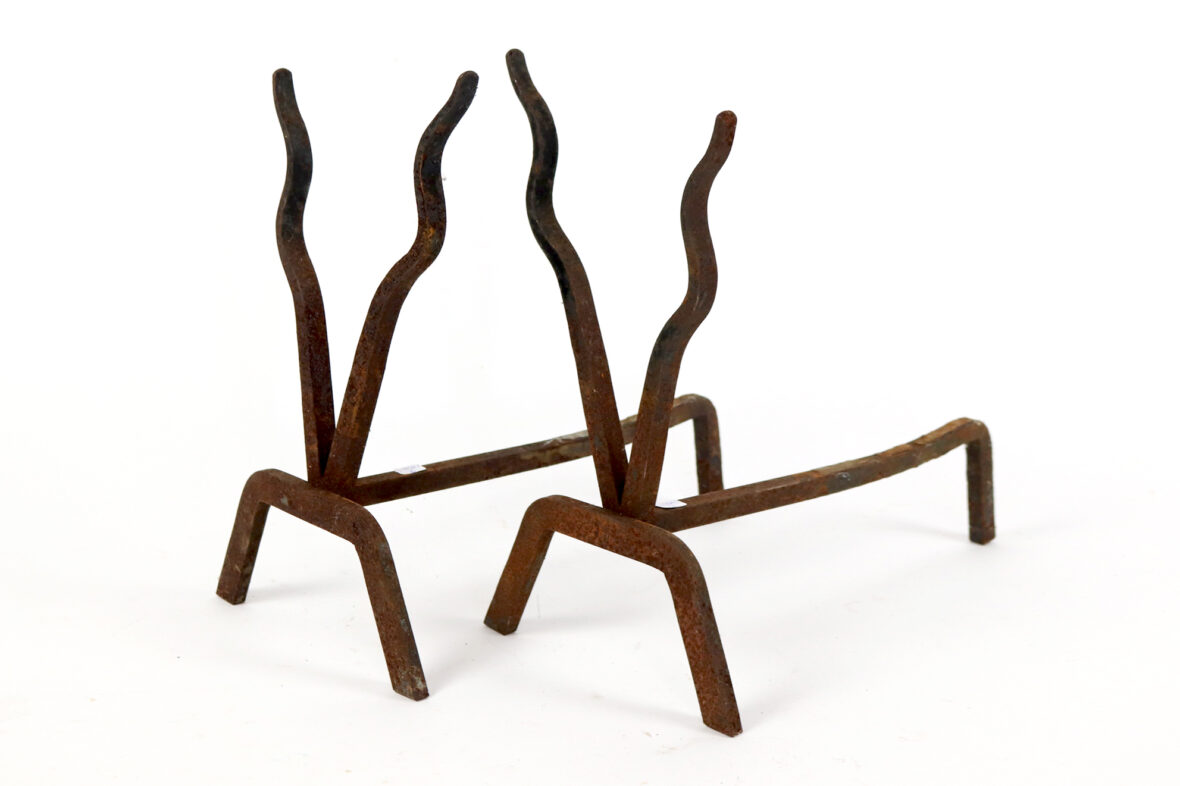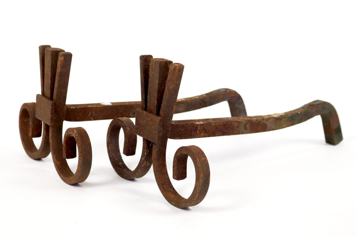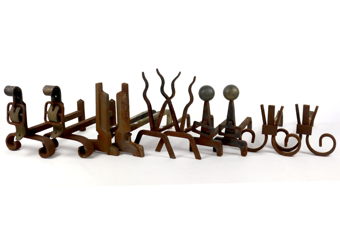 Ensemble de cinq paires de chenêts en fer forgé. (Usures et rouille).