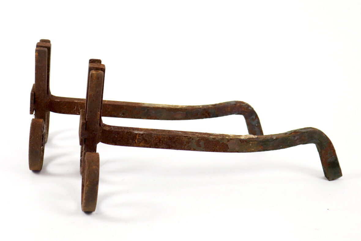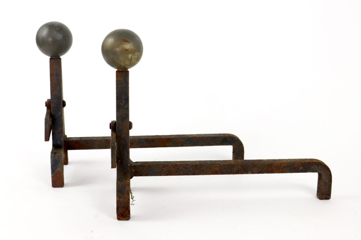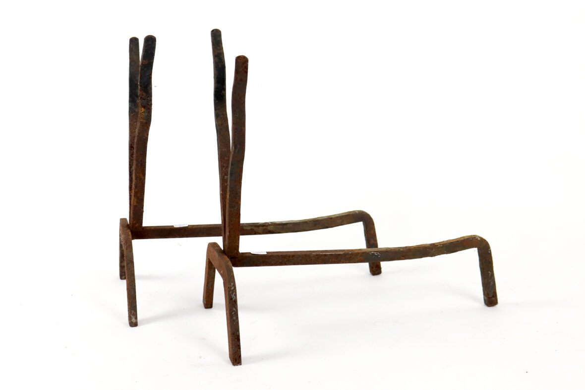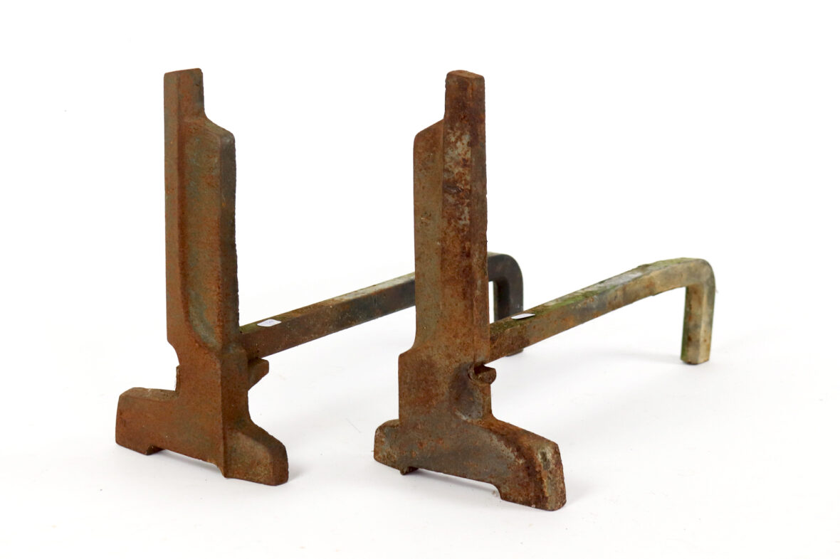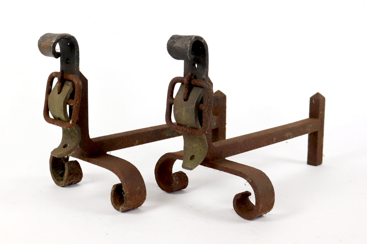 Ensemble de cinq paires de chenêts en fer forgé. (Usures et rouille).