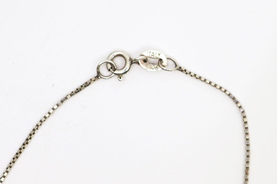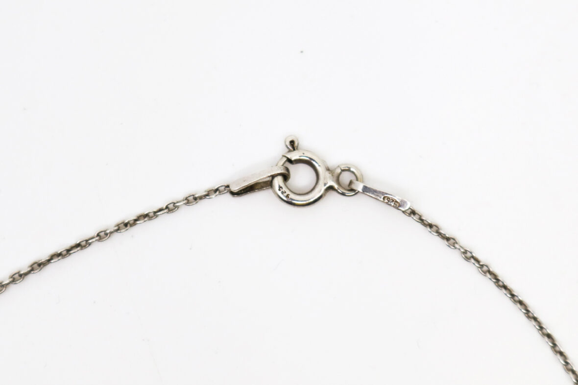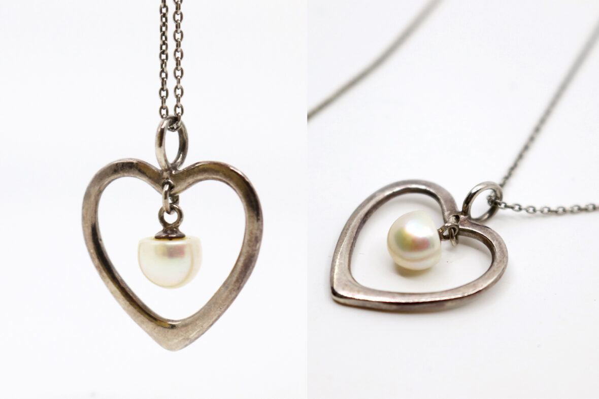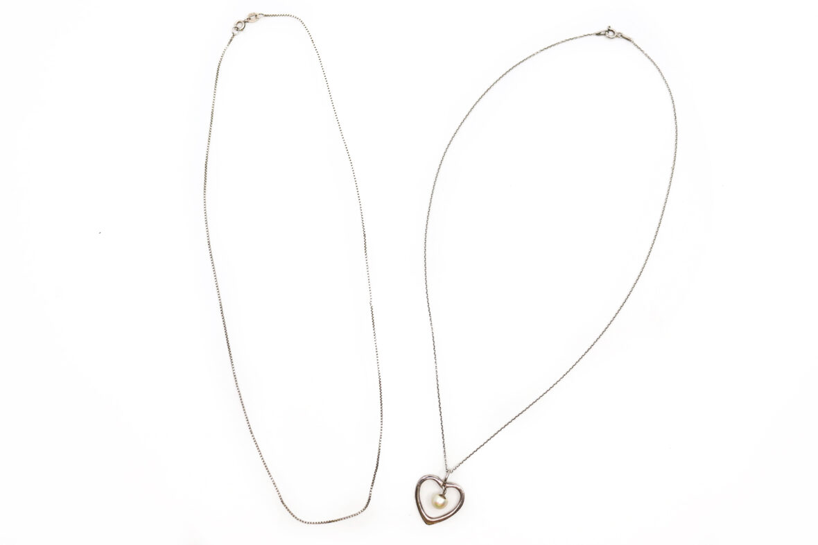 Ensemble de deux chaînes en argent et un pendentif cœur ajouré en argent orné d’une perle blanche.