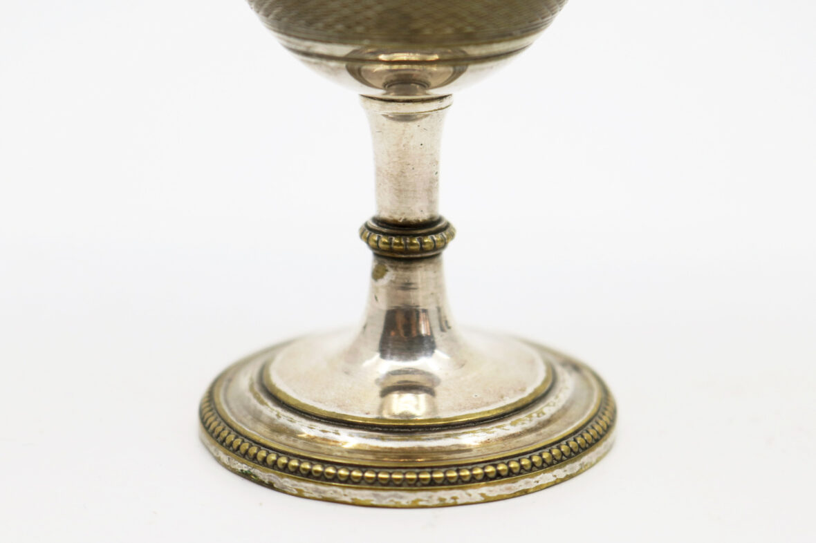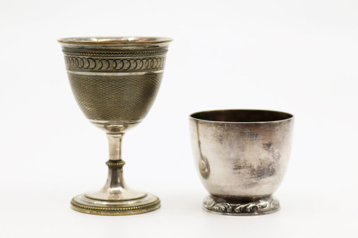 Ensemble de deux coquetiers en bronze et métal argenté. Haut. : 4,3 cm et 7,3 cm