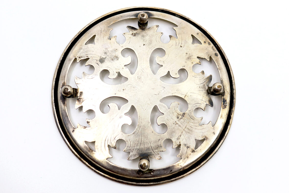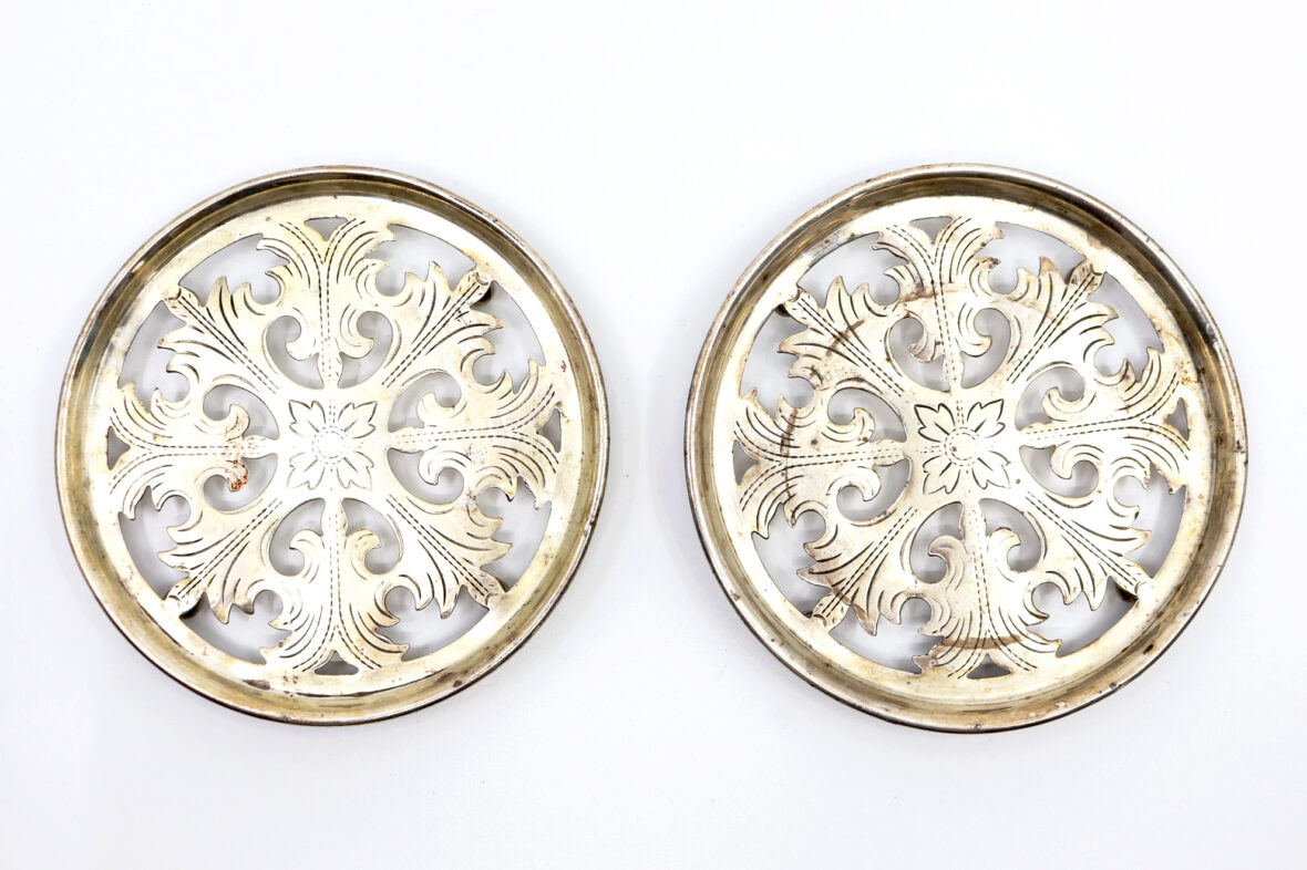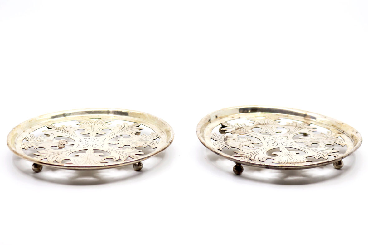 Ensemble de deux dessous de bouteille en métal argenté posant sur des pieds boules, à décor ajouré de feuillage stylisé.