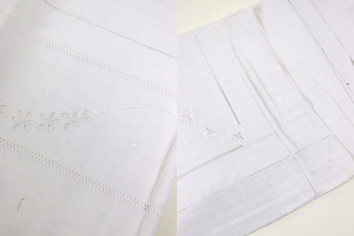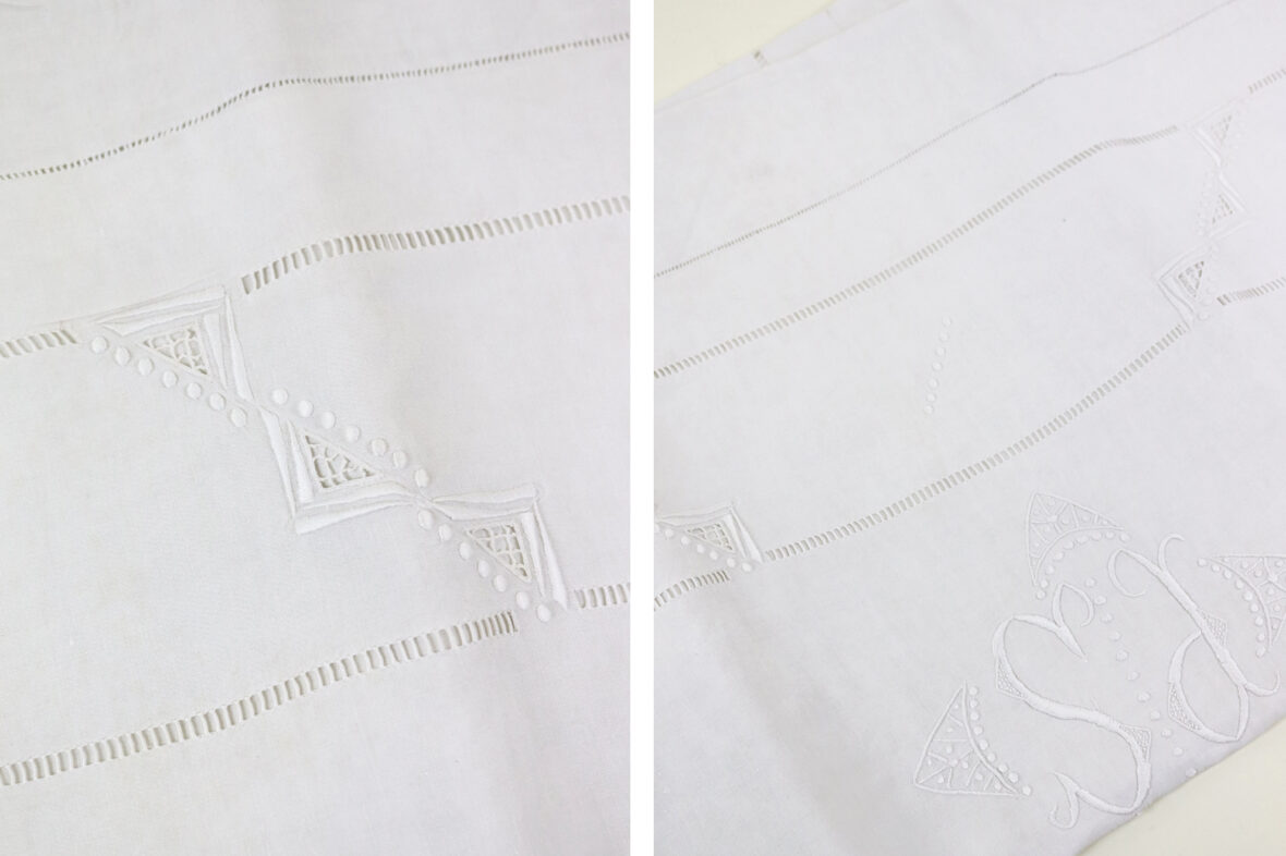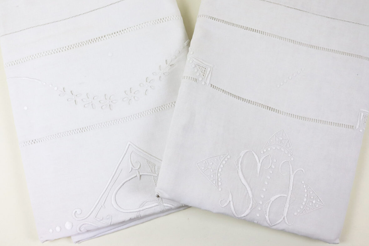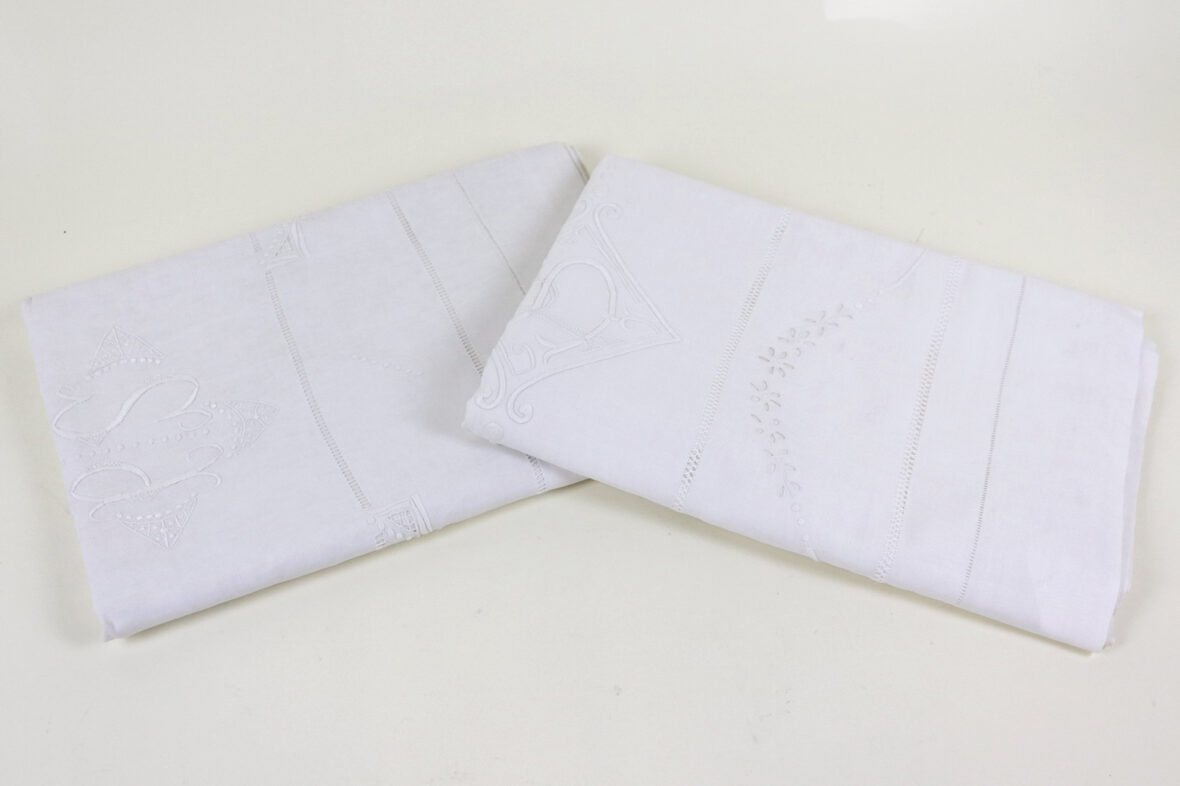 Ensemble de deux draps anciens en coton et lin blanc à décor brodé et chiffré.