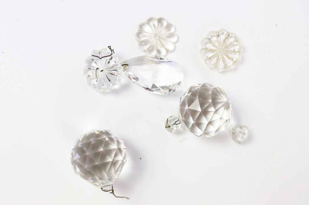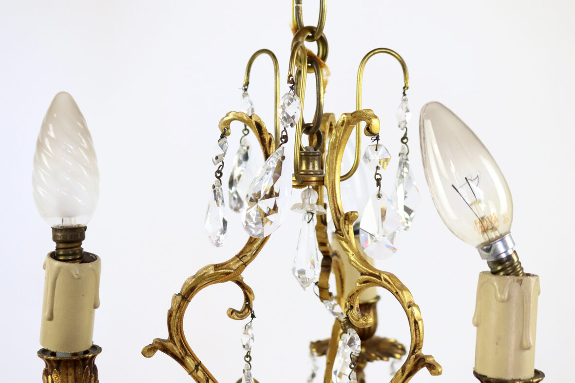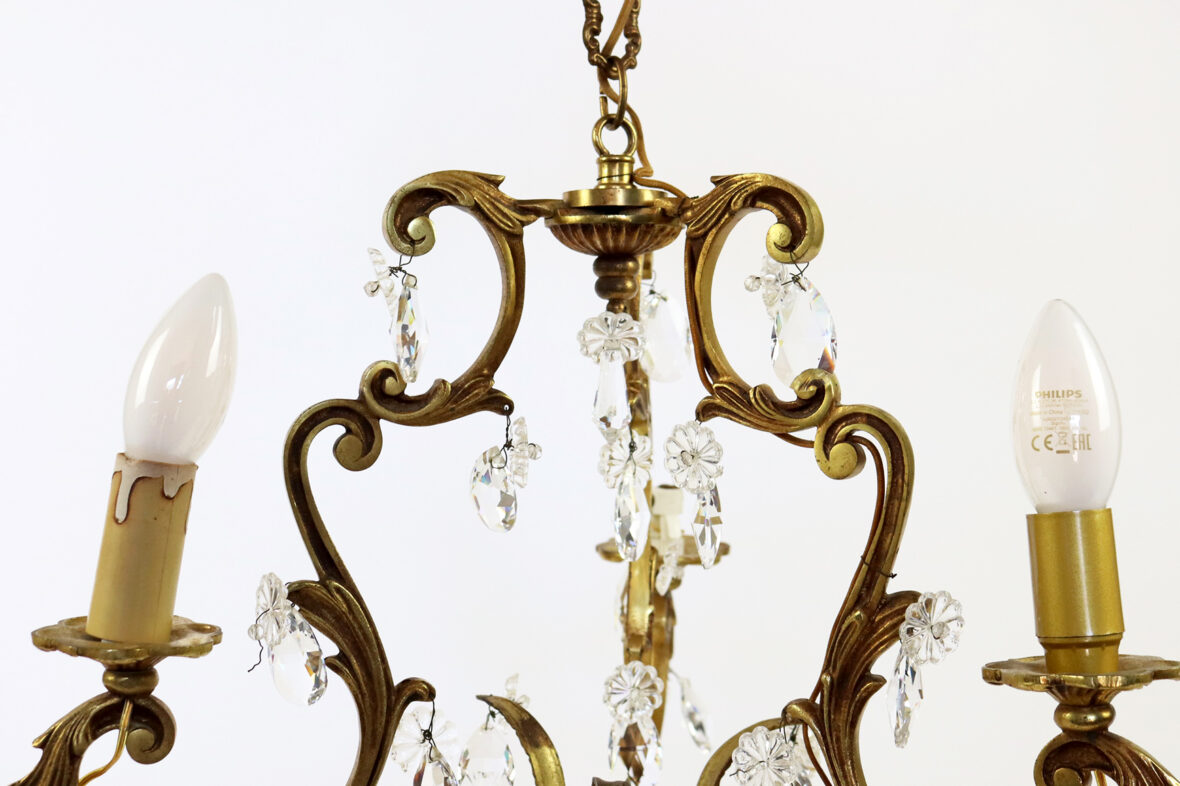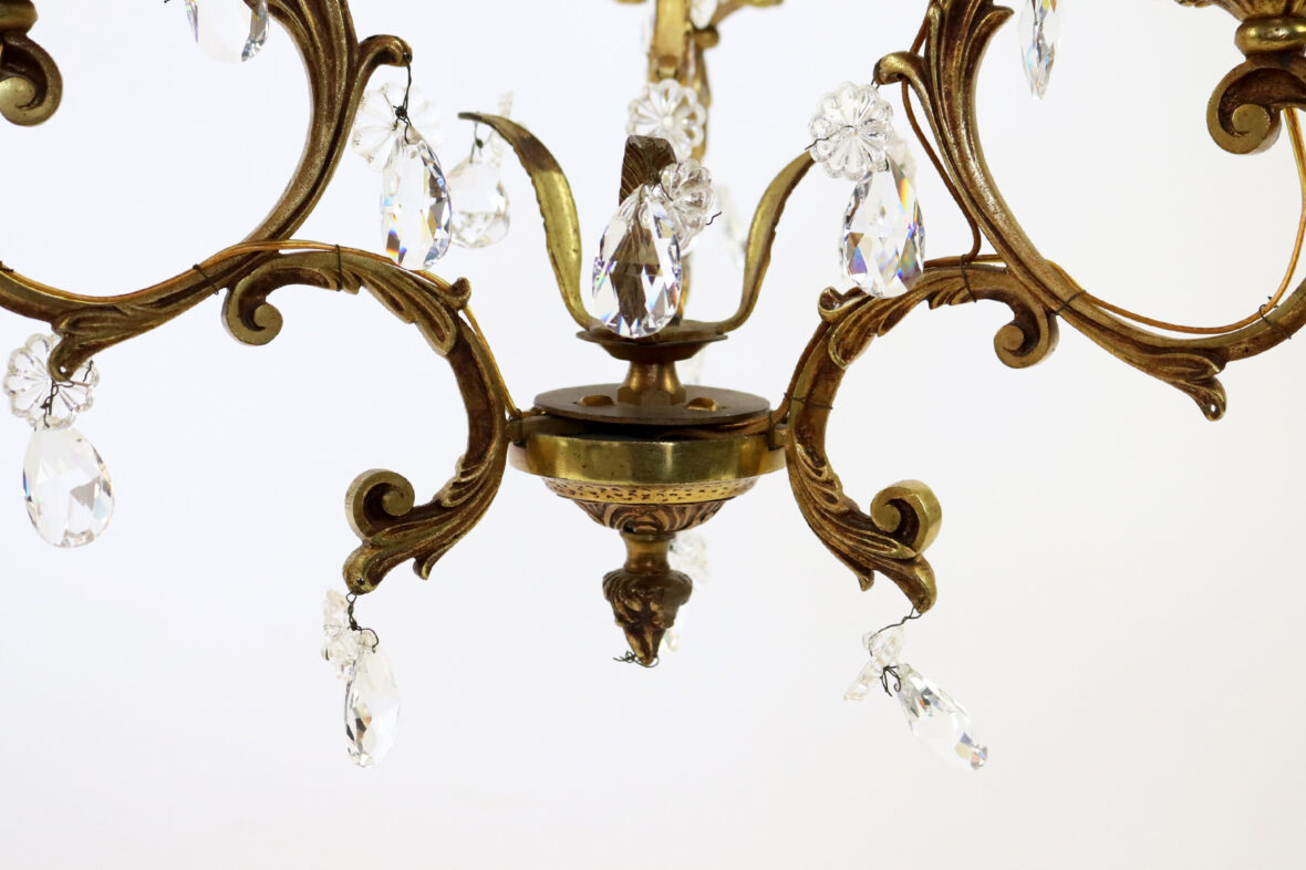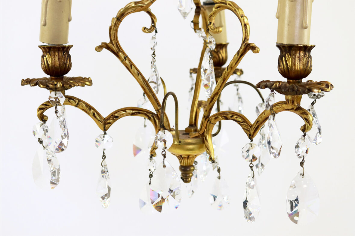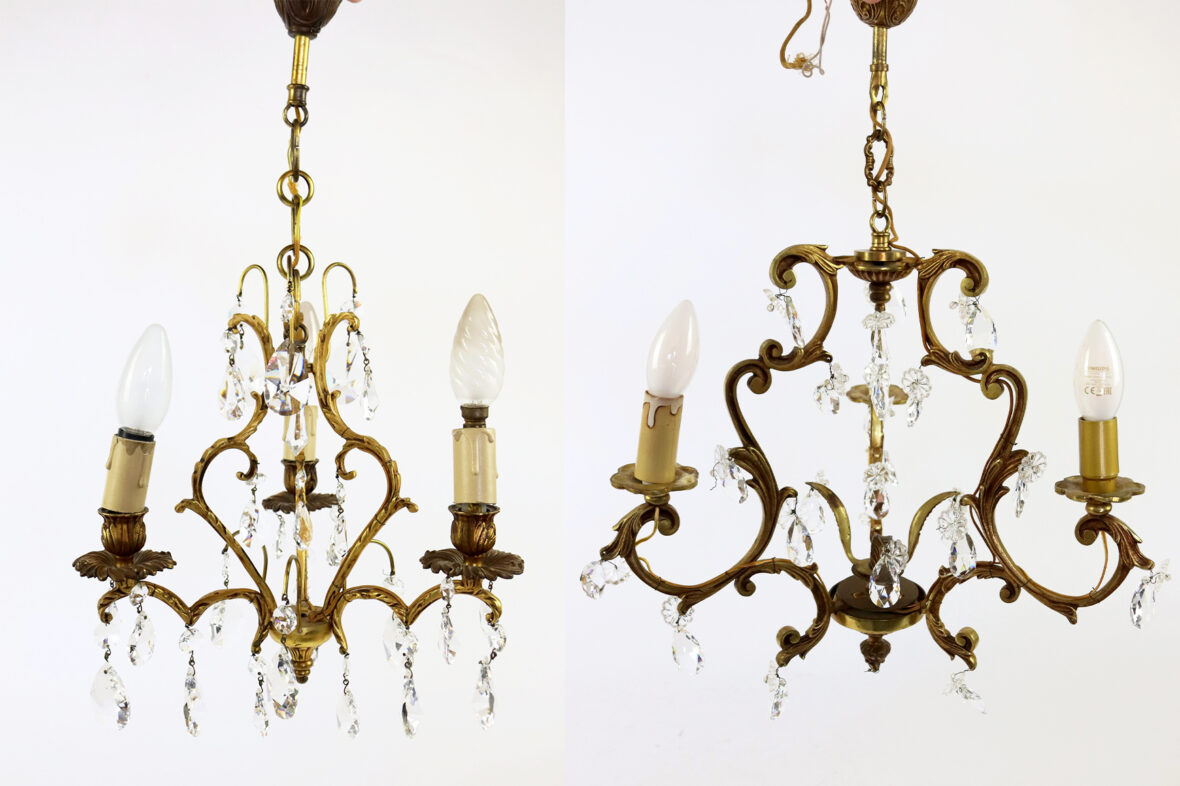 Ensemble de deux lustres en bronze à décor d’agrafes et feuillage stylisé orné de pampilles de cristal faceté, l’un à deux bras de lumière et l’autre à trois bras de lumière.