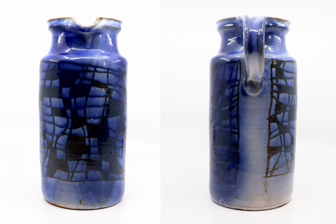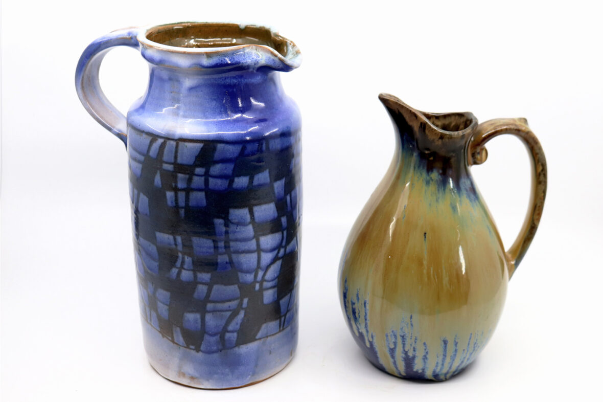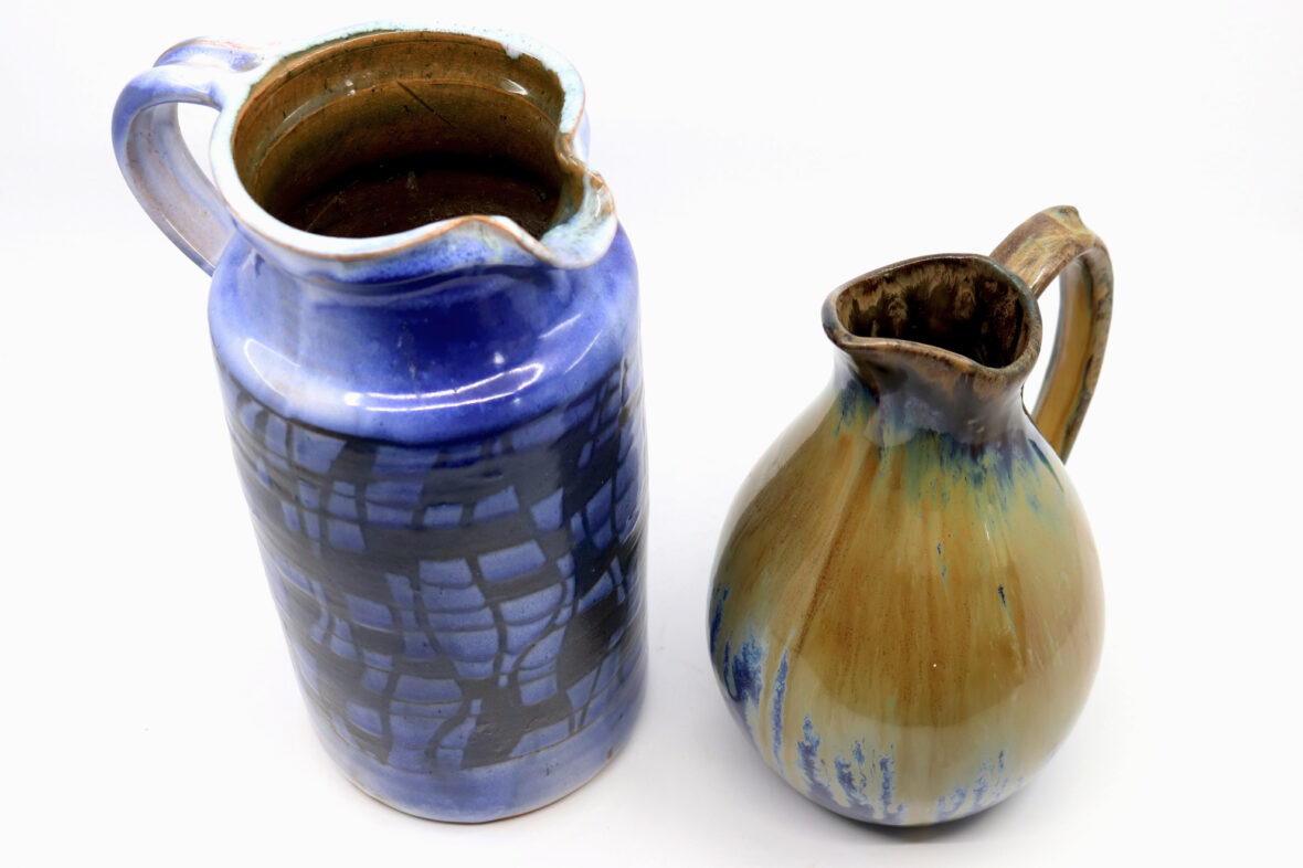 Ensemble de deux pichets, l’un en terre cuite émaillée à motifs de damier noir sur fond bleu (Marque sous base), l’autre en grès émaillé à décor de coulures brunes et bleues.