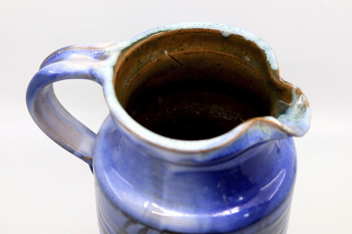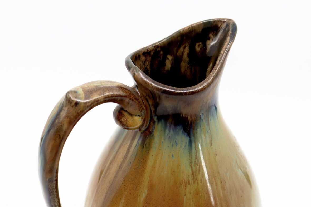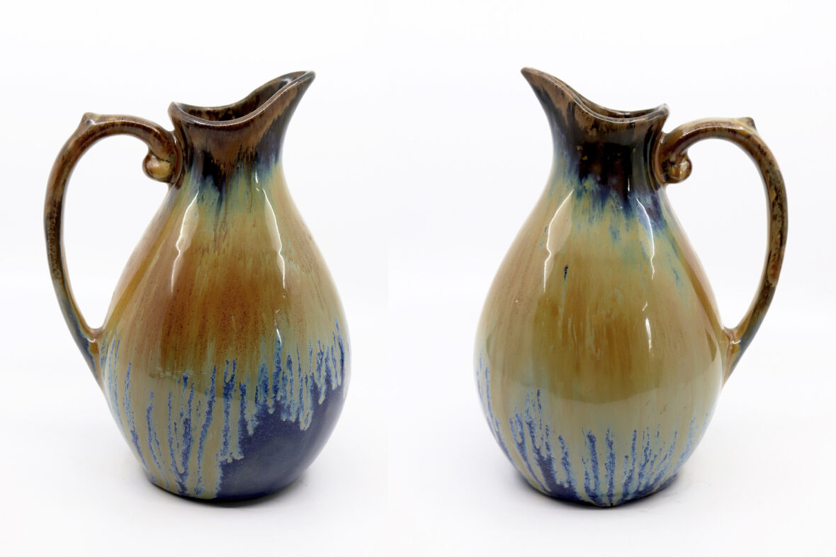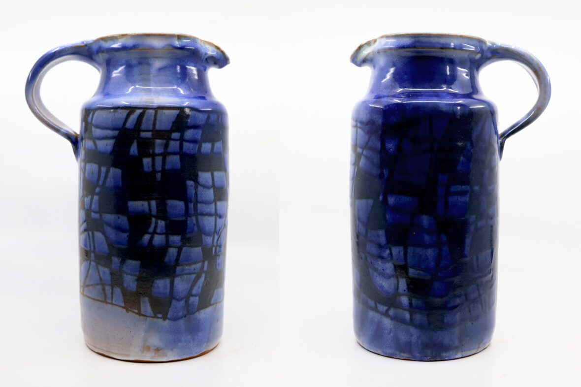 Ensemble de deux pichets, l’un en terre cuite émaillée à motifs de damier noir sur fond bleu (Marque sous base), l’autre en grès émaillé à décor de coulures brunes et bleues.