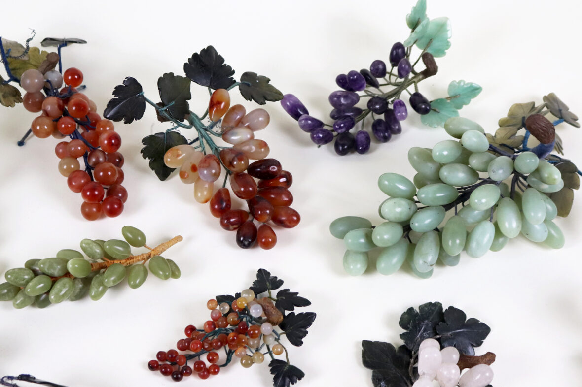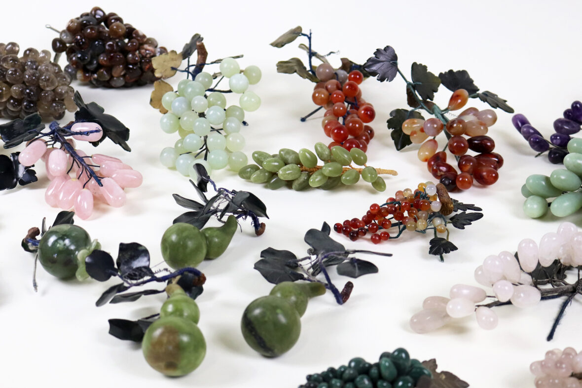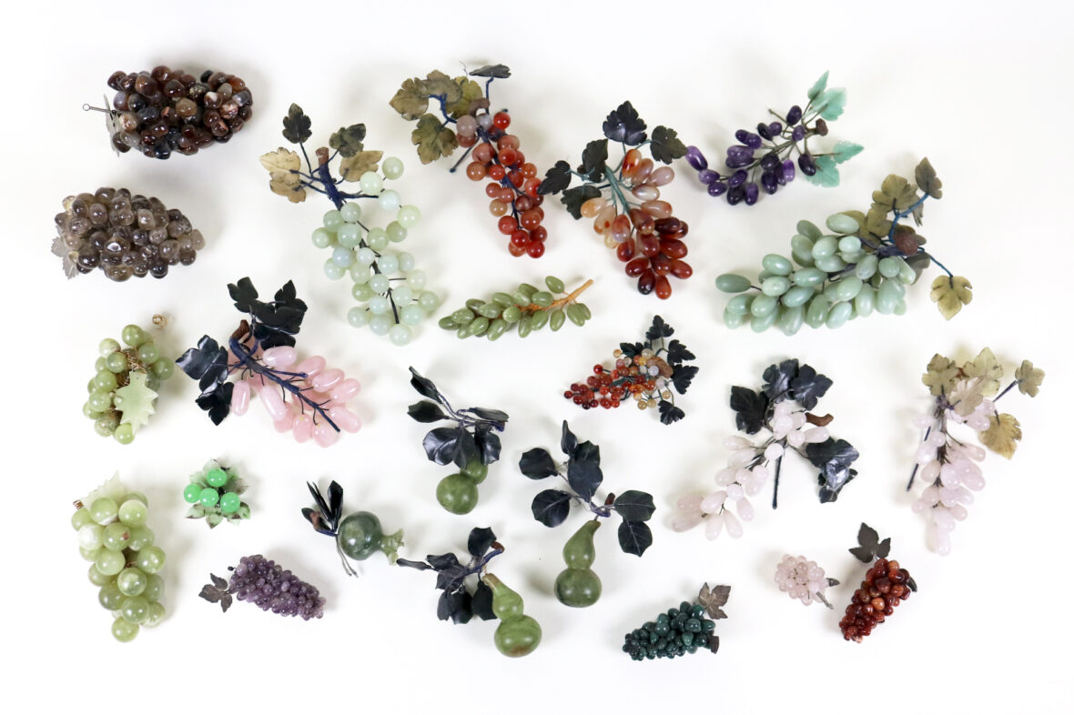 Ensemble de fruits en trompe l’œil dont grappes de raisin et calebasses.