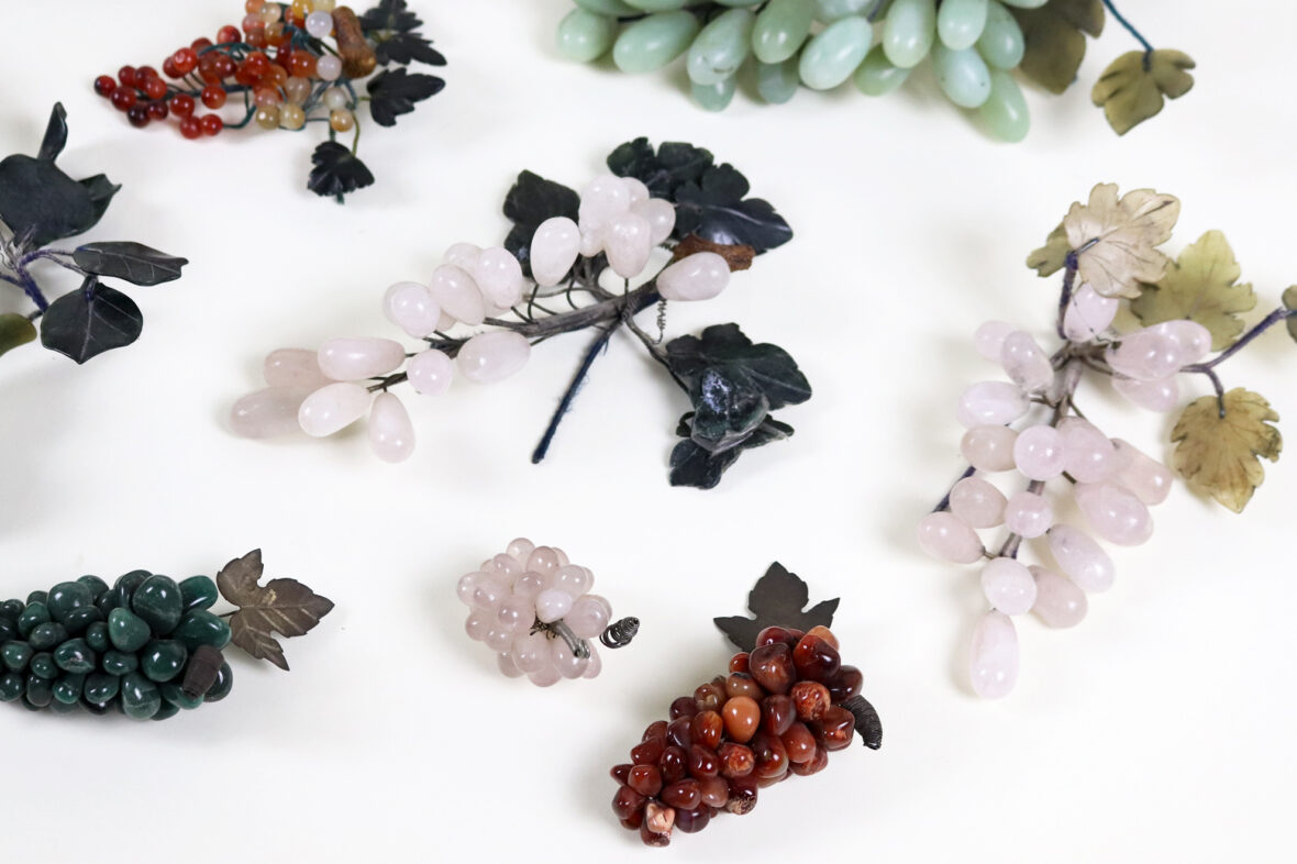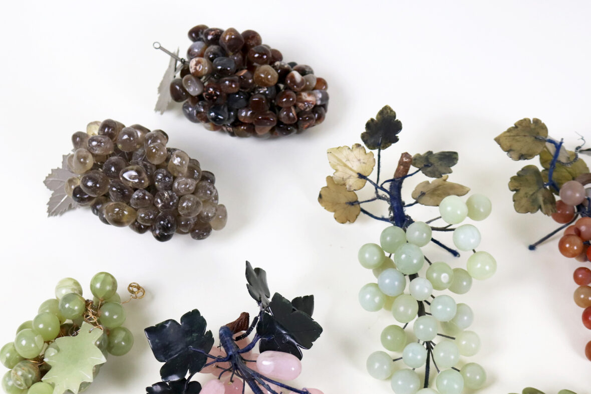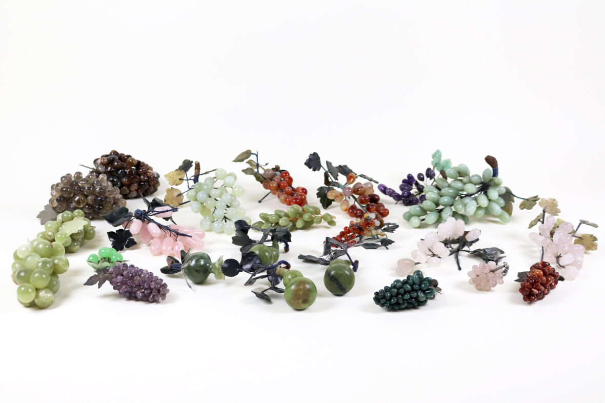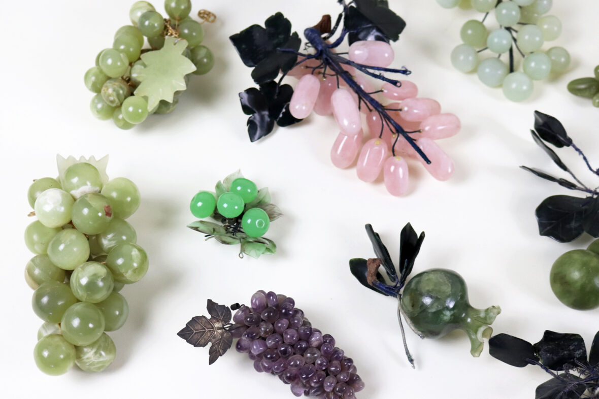 Ensemble de fruits en trompe l’œil dont grappes de raisin et calebasses.
