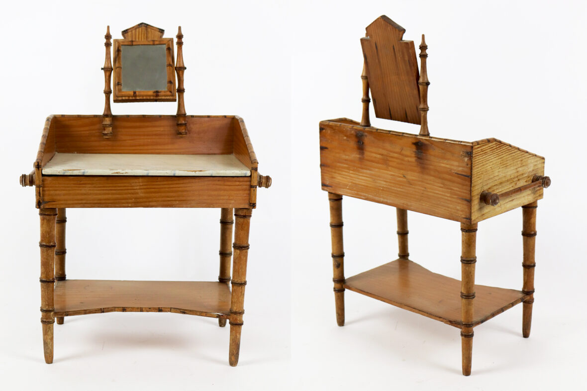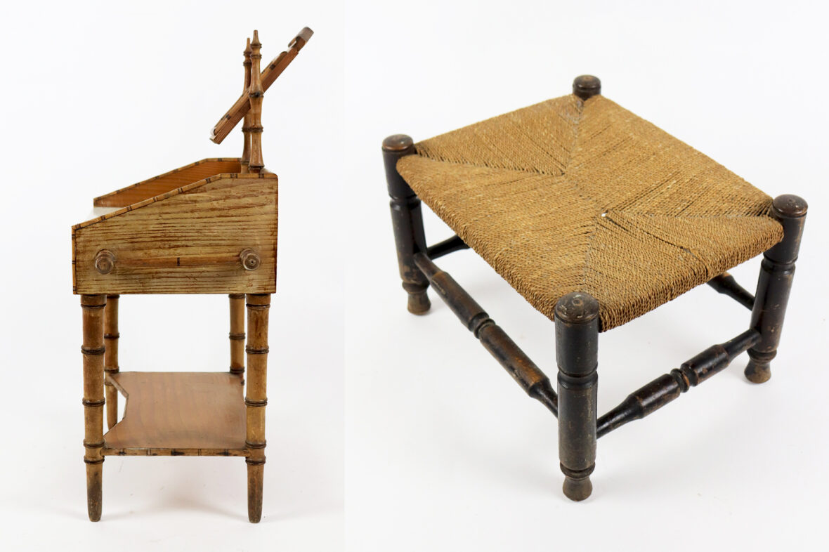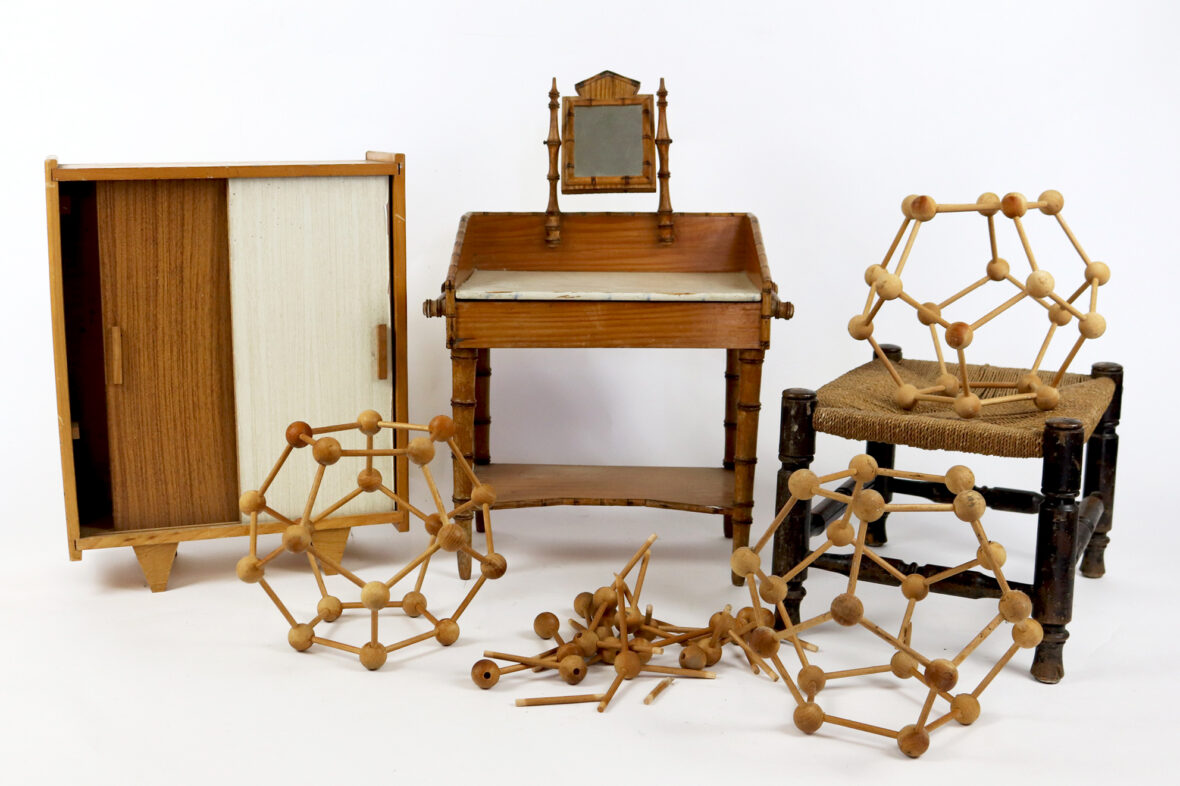 Ensemble de jouets en bois comprenant une coiffeuse, une armoire circa 1960, quatre casses-têtes en bois et un repose-pieds en bois et assise paillée.