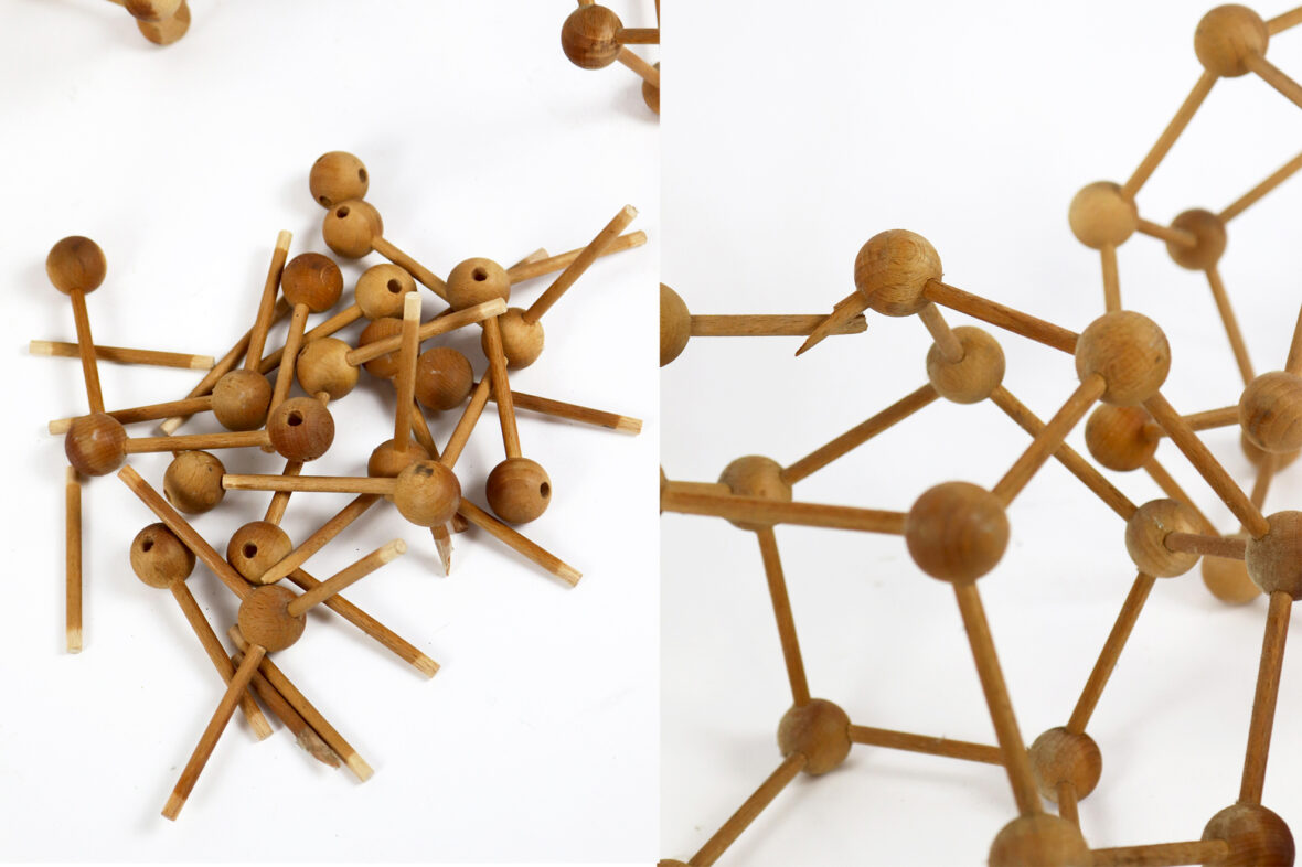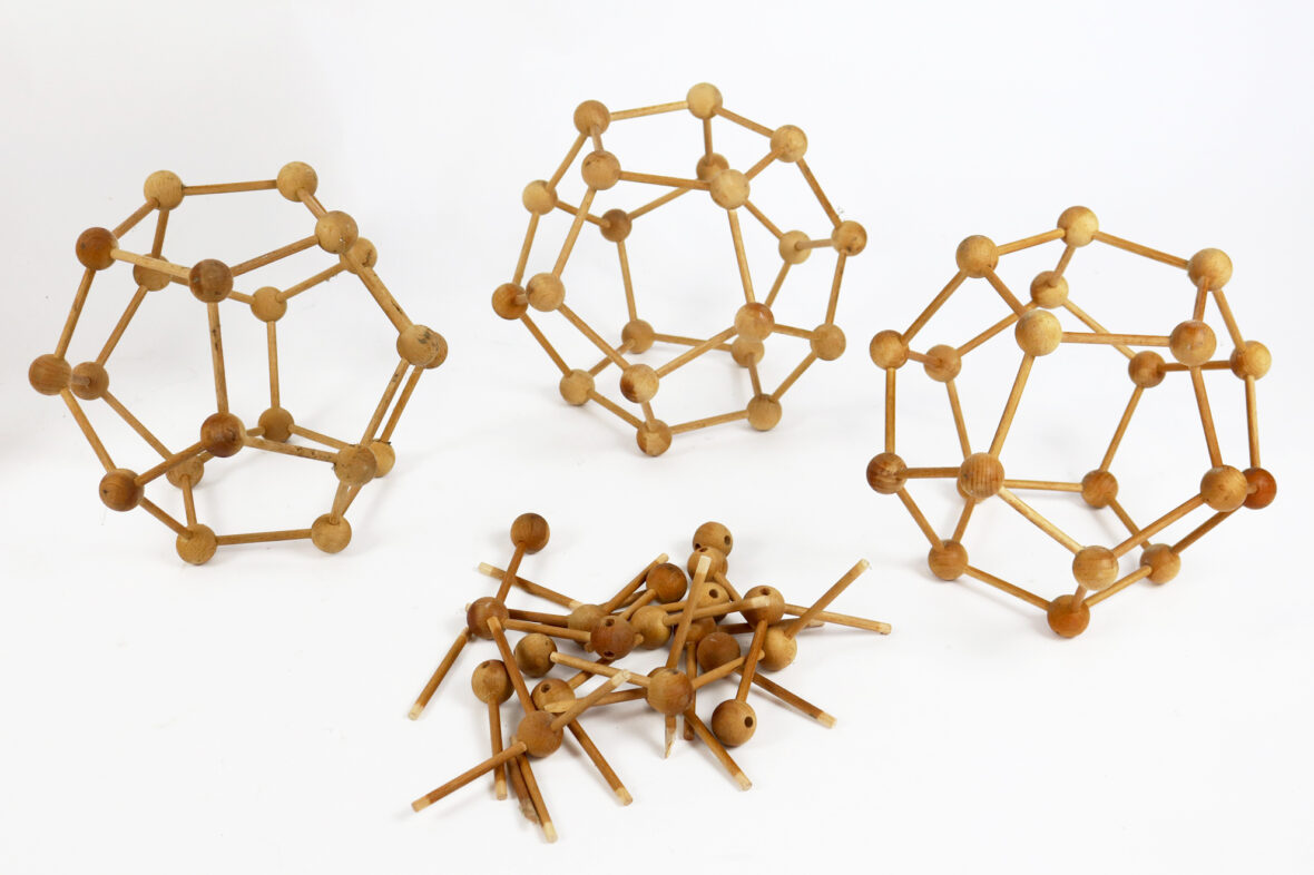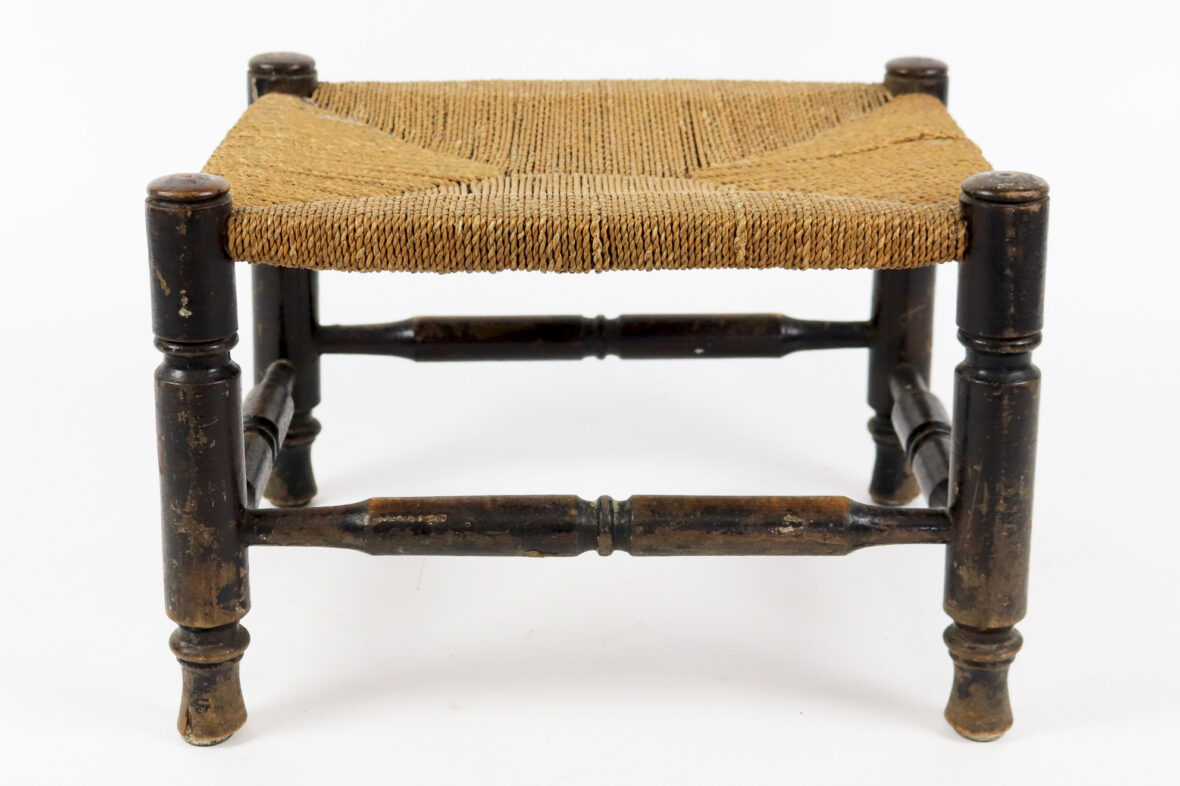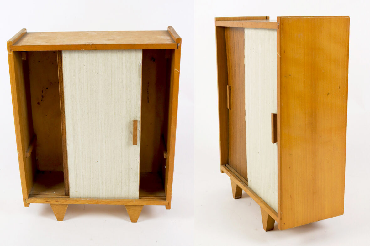 Ensemble de jouets en bois comprenant une coiffeuse, une armoire circa 1960, quatre casses-têtes en bois et un repose-pieds en bois et assise paillée.