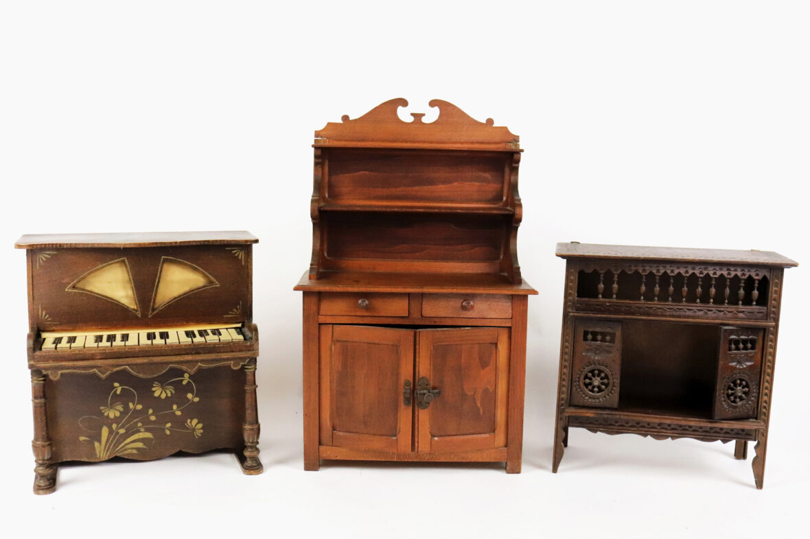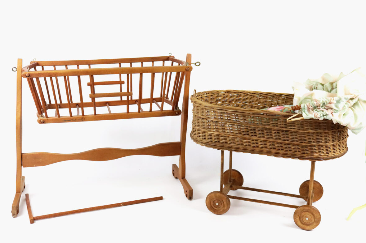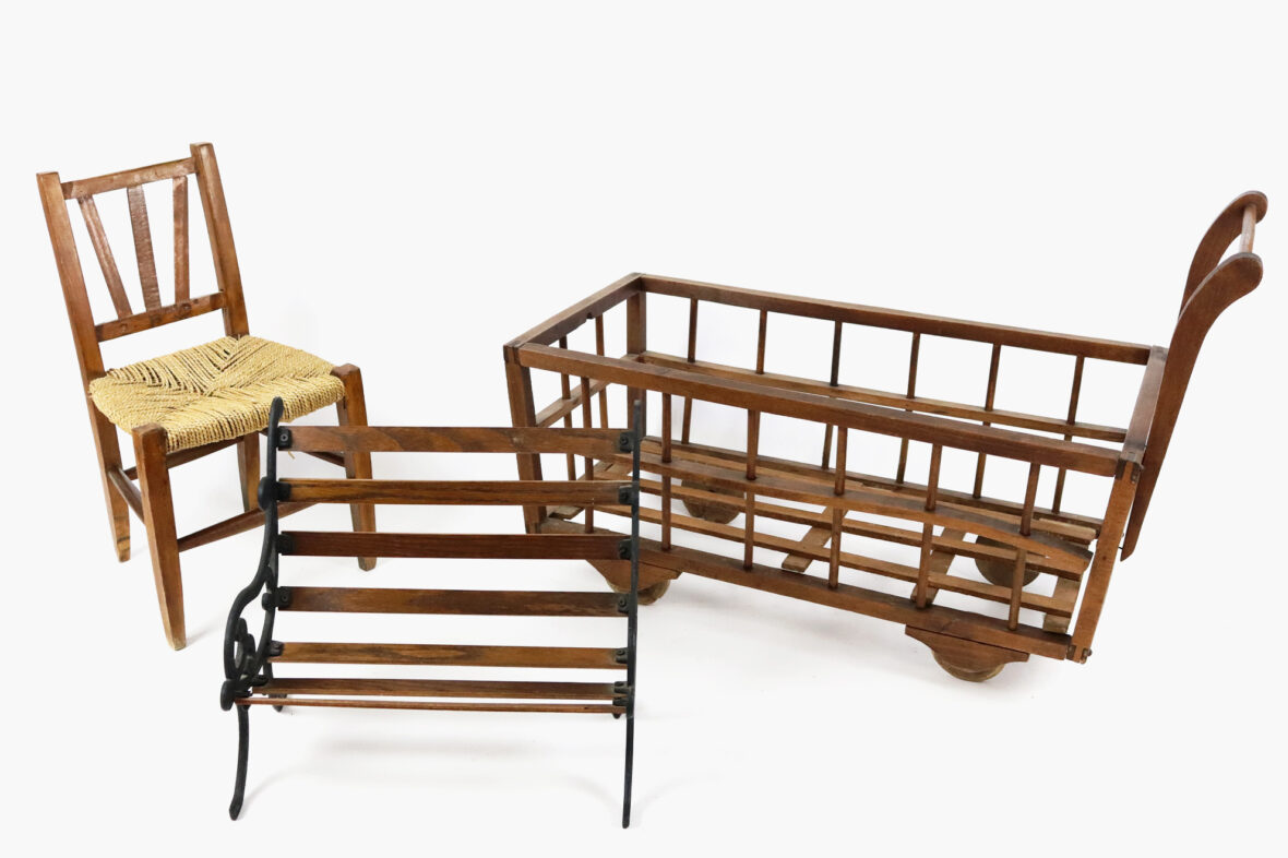 Ensemble de mobilier de poupée en bois comprenant un berceau, un landeau en rotin, une chaise paillée, un banc en bois et fer forgé, un piano etc.