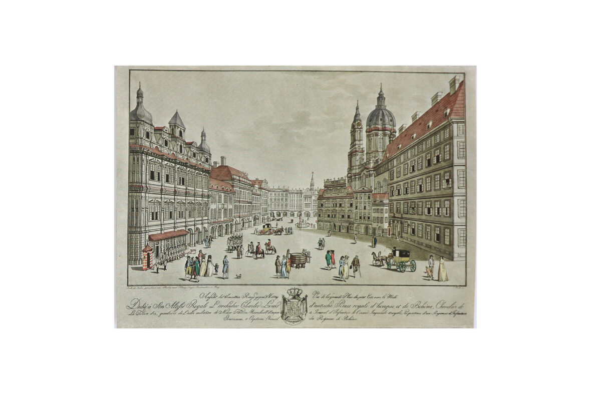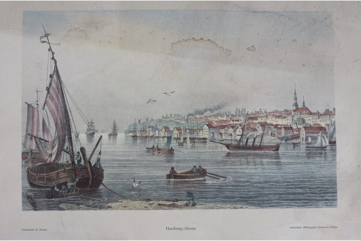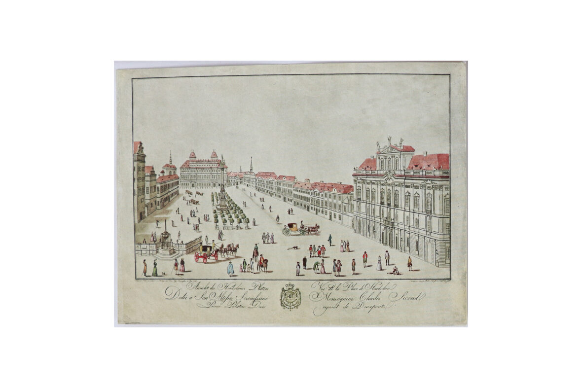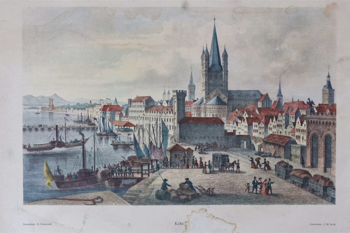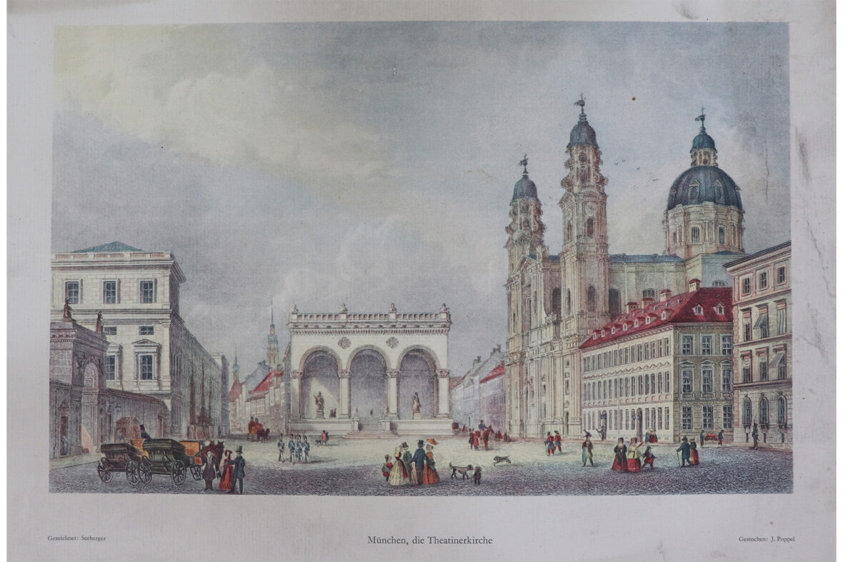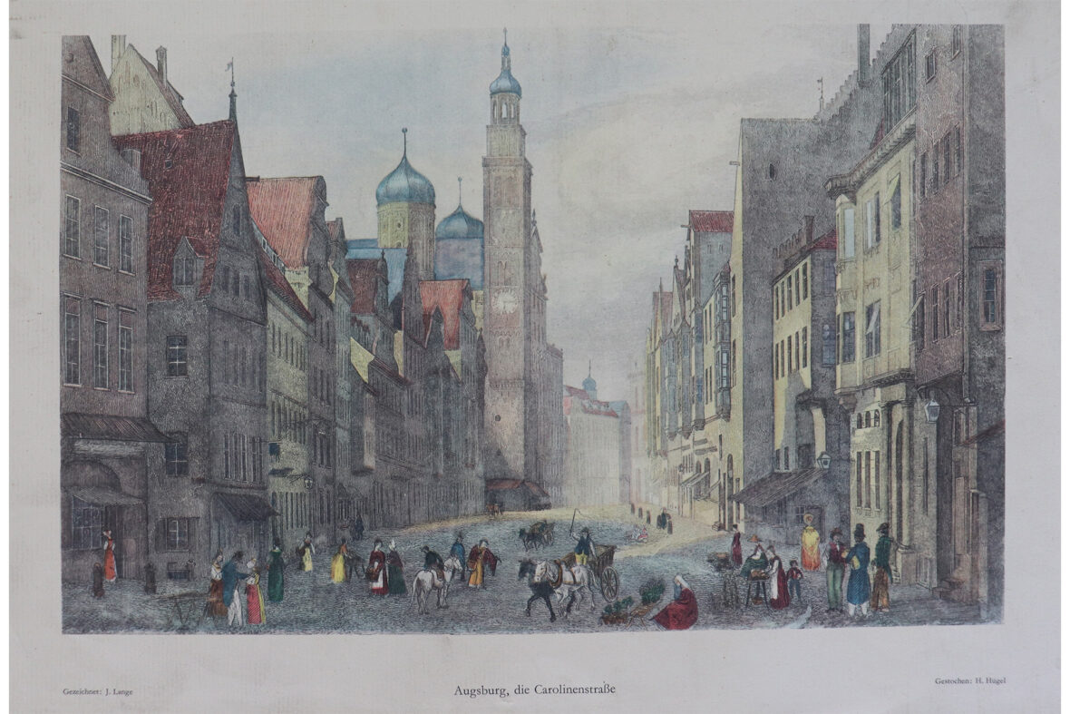 Ensemble de quatre gravures en couleurs reprenant des vues de villes allemandes dont München, Köln, Hamburg et Augsburg. On y joint deux cartes postales modernes à décor de vues d’optique.