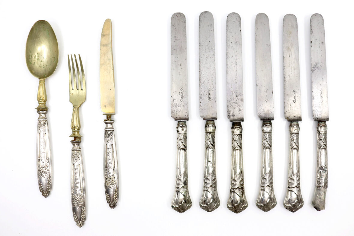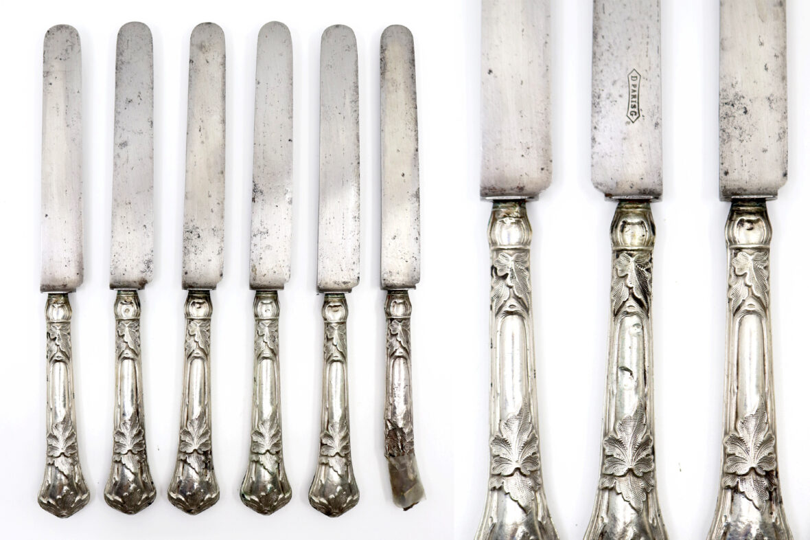 Ensemble de six couteaux à fromage, lame métal, manche en argent fourré à décor de feuilles de vigne. (Un accidenté).