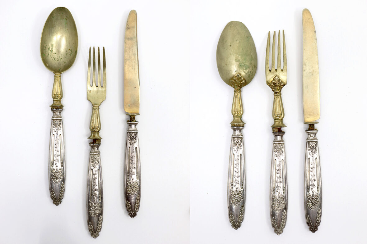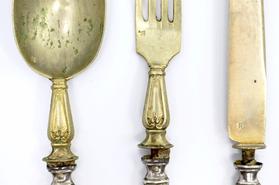 On y joint un couvert de baptême comprenant cuillère, fourchette et couteau, en métal doré, manches en argent fourré à décor de nœud, rinceaux de style Louis XVI.