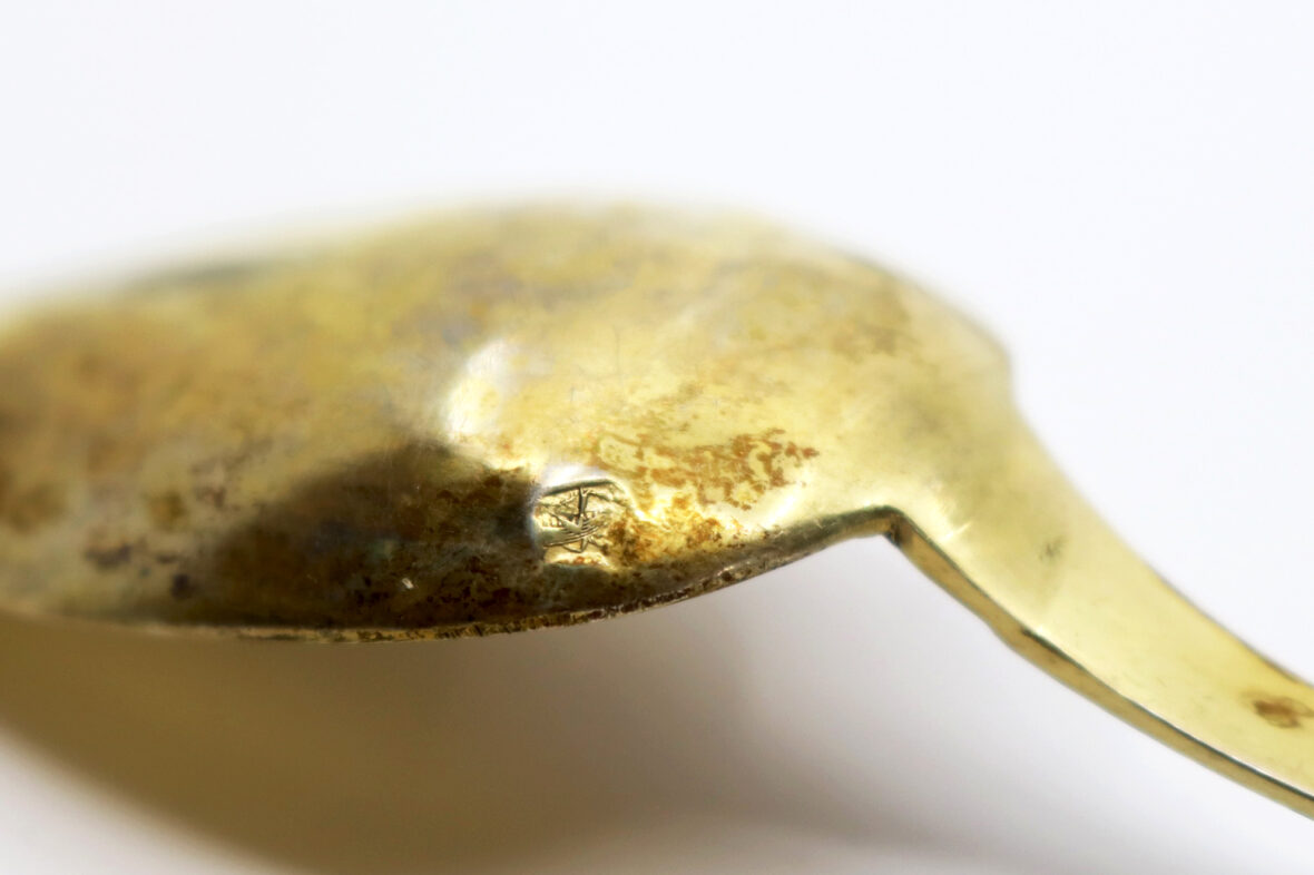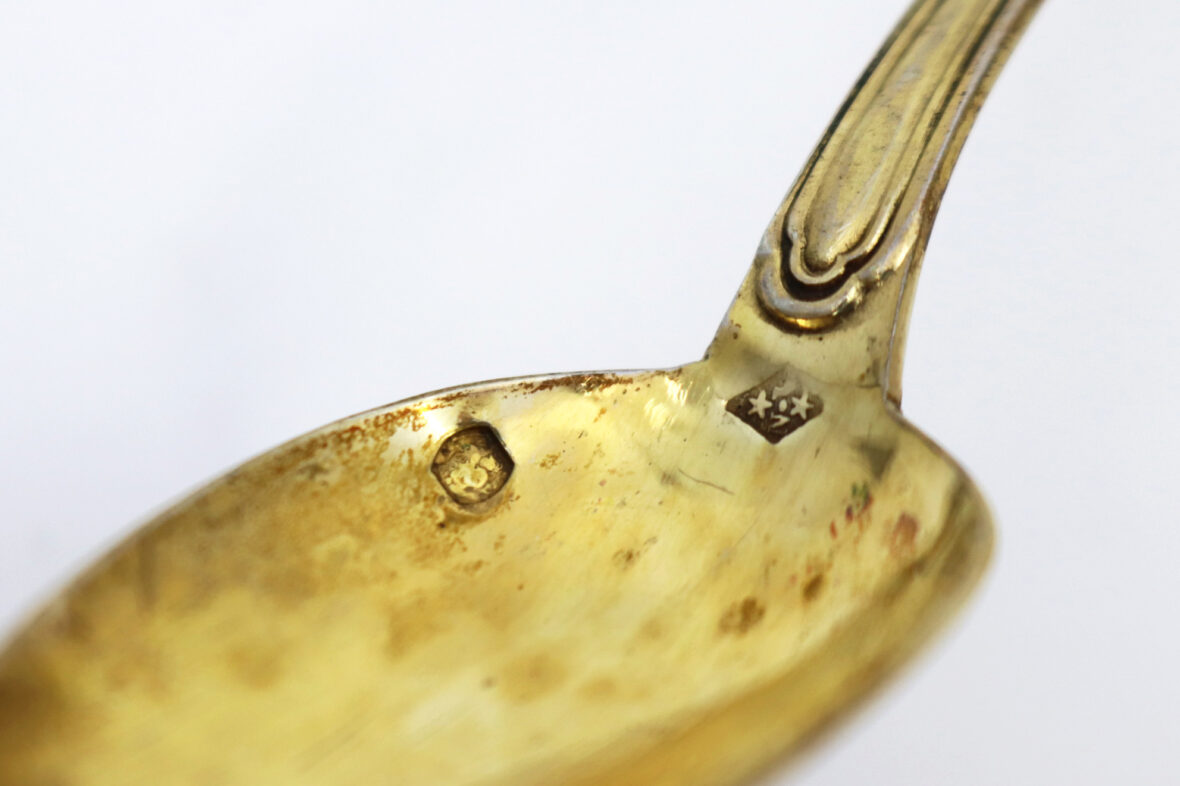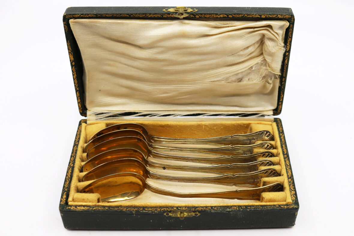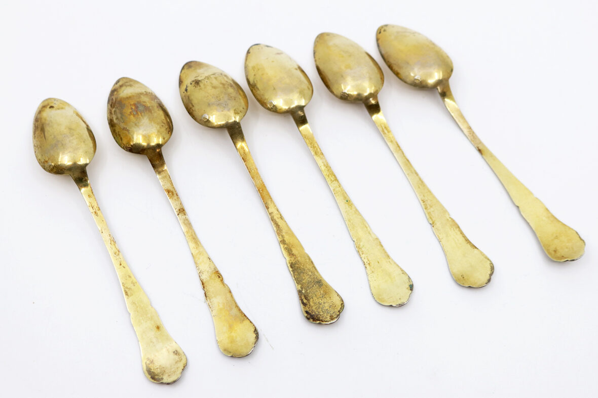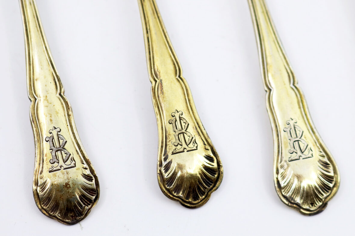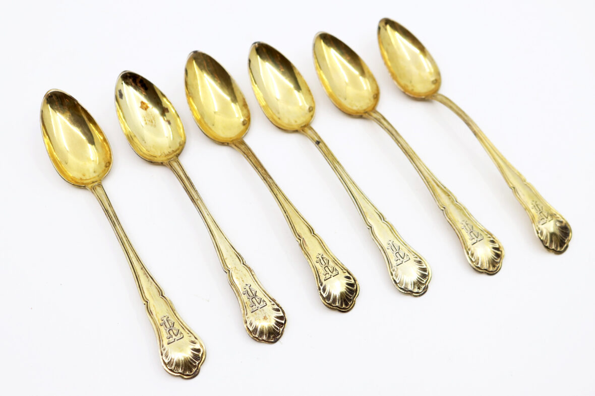 Ensemble de six petites cuillères en vermeil, le manche violonné à décor de coquille, monogrammé LB.