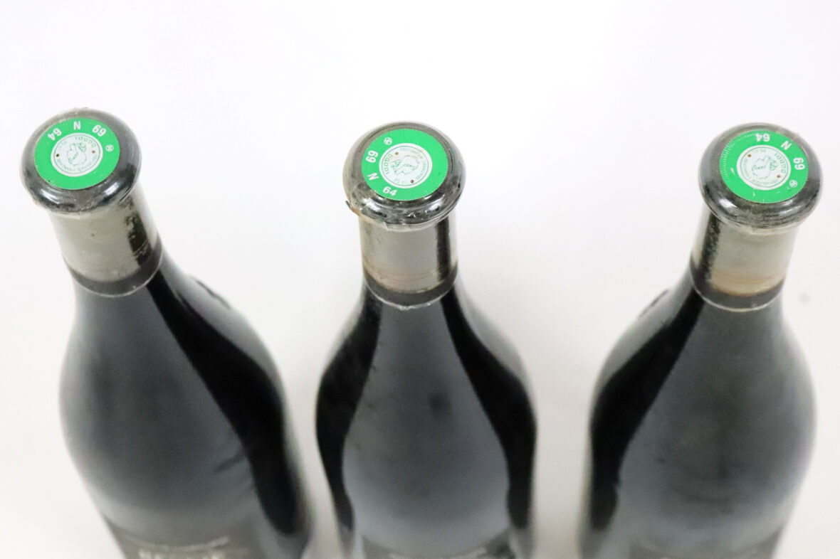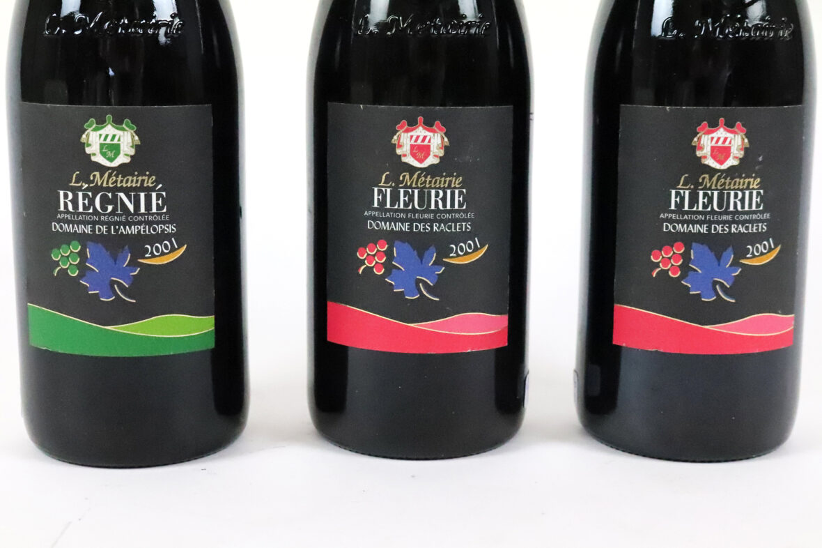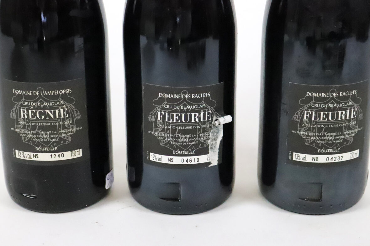 Ensemble de trois bouteilles BEAUJOLAIS dont 1 btle Régnié, Domaine de L’Ampélopsis, 2001 et 2 btles Fleurie, Domaine des Raclets, 2001.