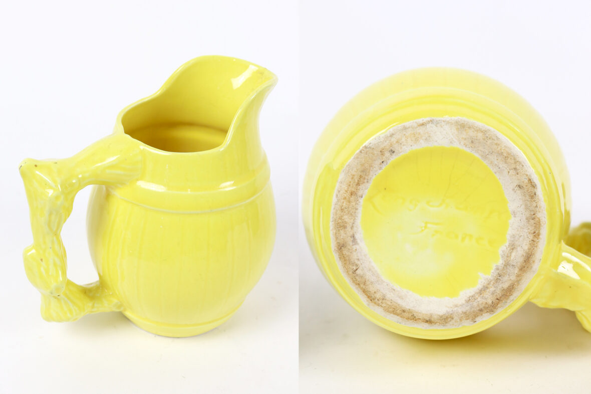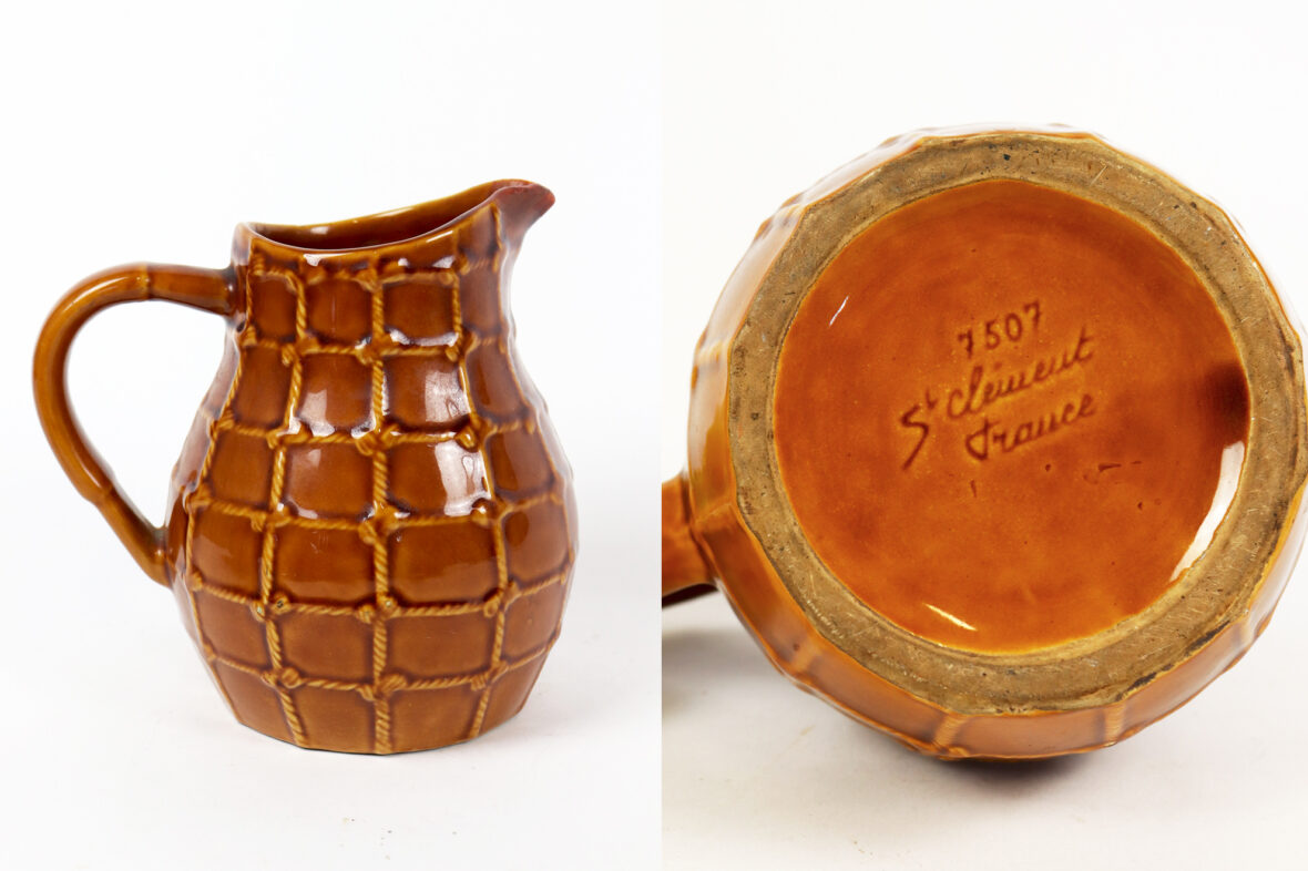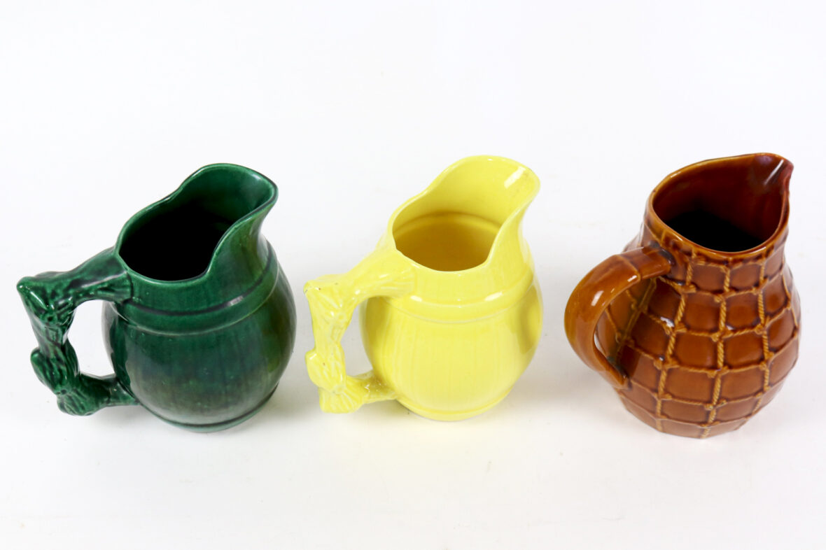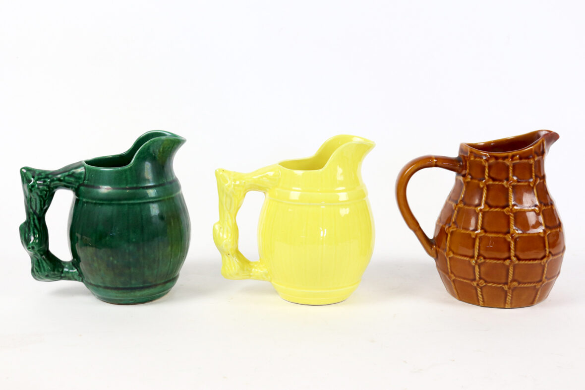 Ensemble de trois pichets en céramique jaune, vert et marron, dont Saint Clément et Longchamp.