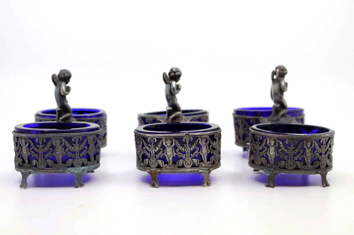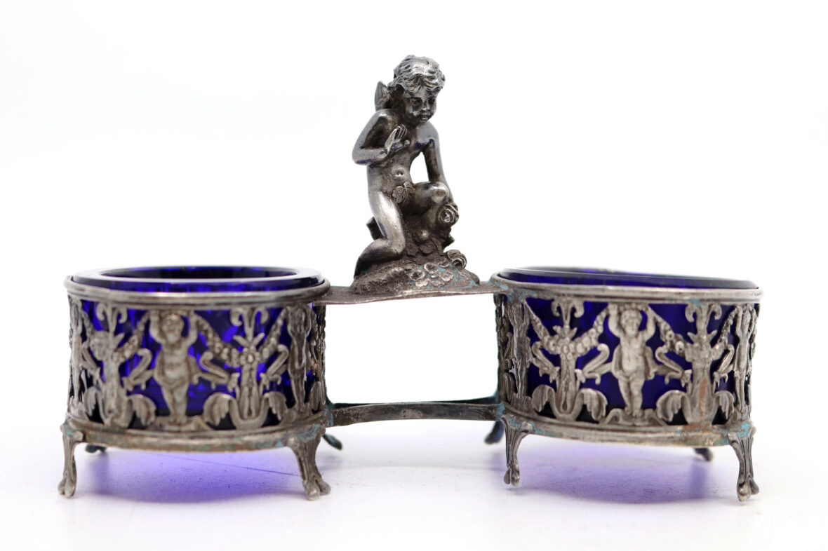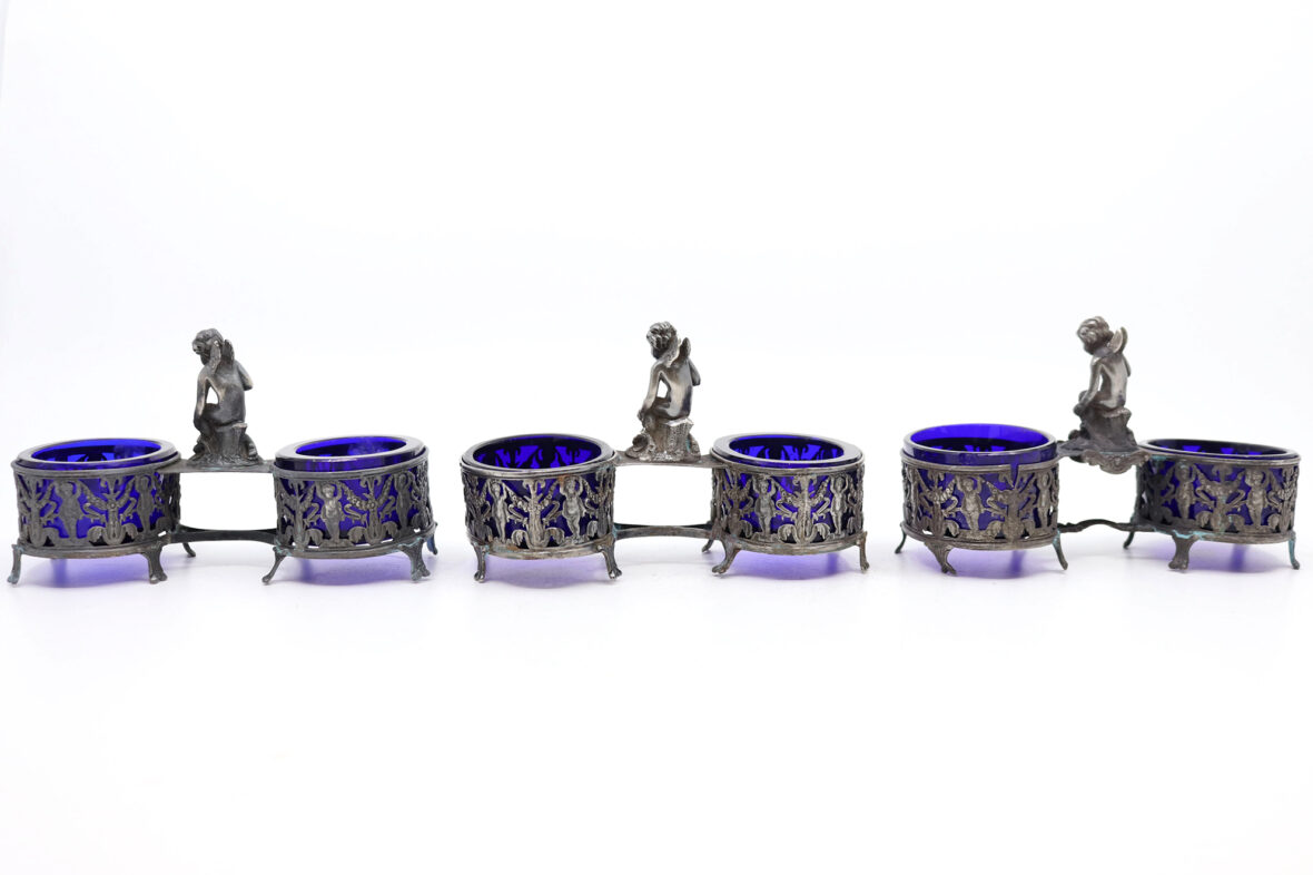 Ensemble de trois salerons doubles en argent à décor ajouré de putti soutenant une guirlande de fleurs, alternés de motifs végétaux. La prise formée d’un Amour agenouillé. Intérieurs en verre bleu.